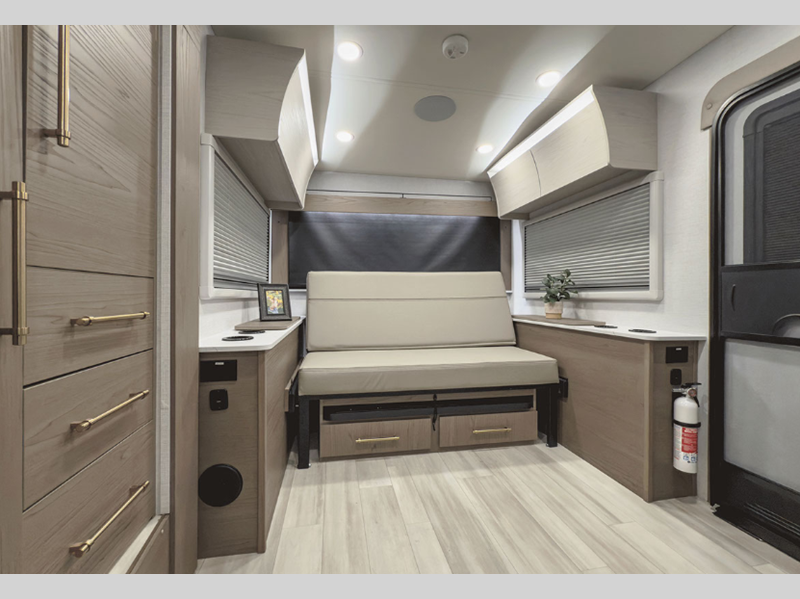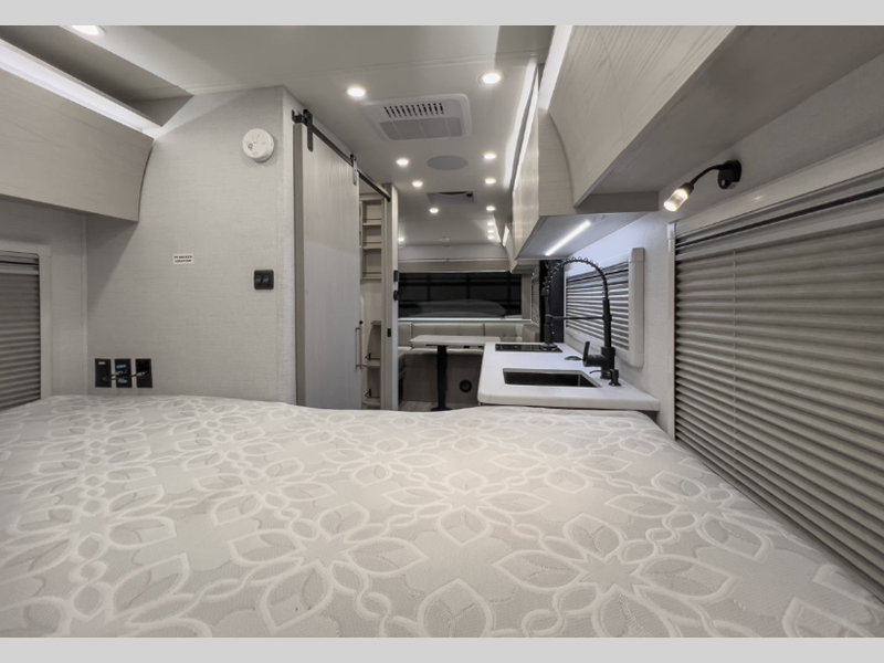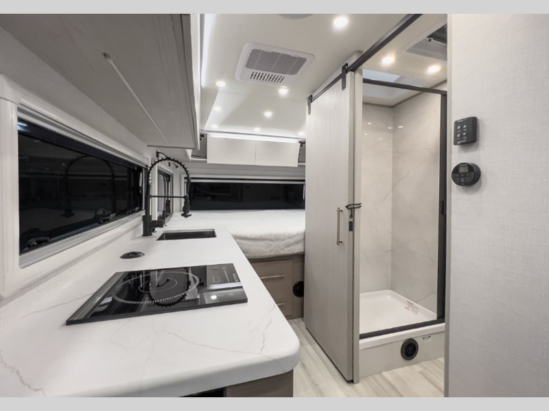 Some of the stand-out features include a power stabilizing system for easy set up, a 200W solar panel, and Azdel sidewall construction. There is an aluminum frame for added durability, plus an enclosed underbelly for protection against the elements. A molded fiberglass front cap with an automotive windshield is eye-catching, and an armless cassette awning features an integrated LED light so you can visit outdoors with campground neighbors.