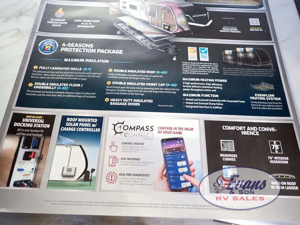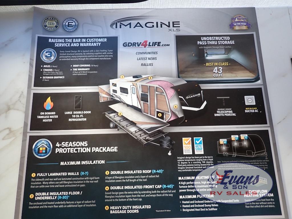 Let your imagination run wild with the possibilities that the Grand Design Imagine XLS travel trailer can provide! The Imagine XLS has been built with oversized tank capacities, an extra-large 2" fresh water drain valve, a ducted A/C system, a power tongue jack, and a heated and enclosed underbelly with suspended tanks. There is a designated heat duct to the subfloor and a residential ductless heating system throughout. For outdoor adventures, the electric awning with LED lights will enable you to stay protected, and the exterior speakers make any time outside a party. You will also love the XLS Solar Package that comes with a 165W roof mounted solar panel, a 40 Amp charge controller, a 12V 10 cu. ft. refrigerator, and roof mounted quick connect plugs!