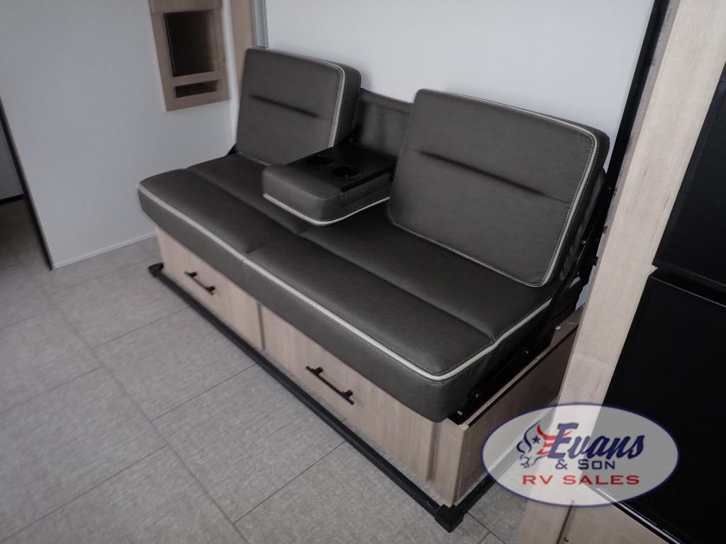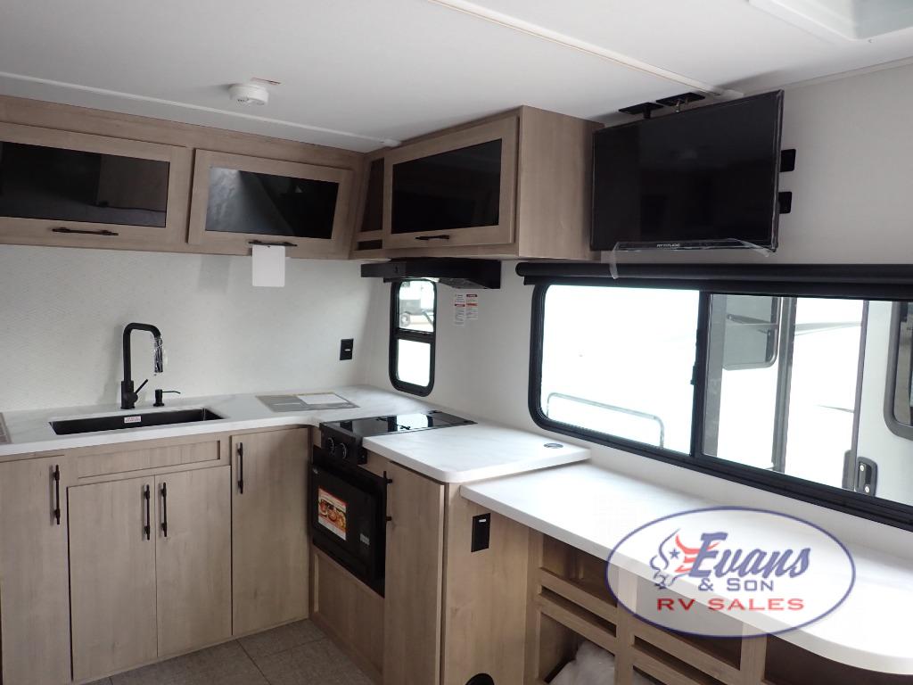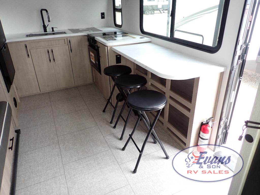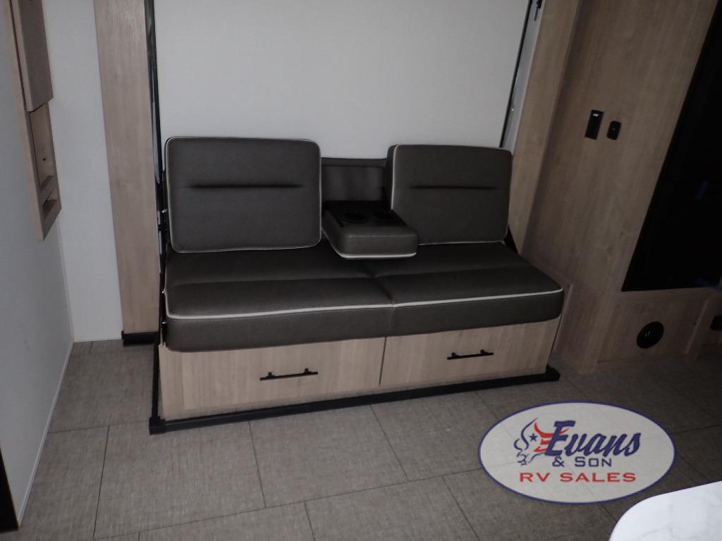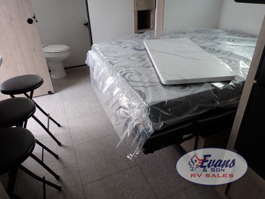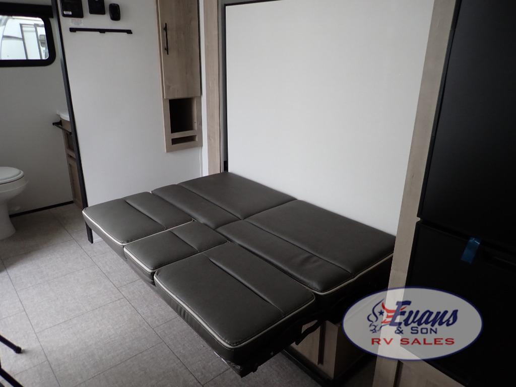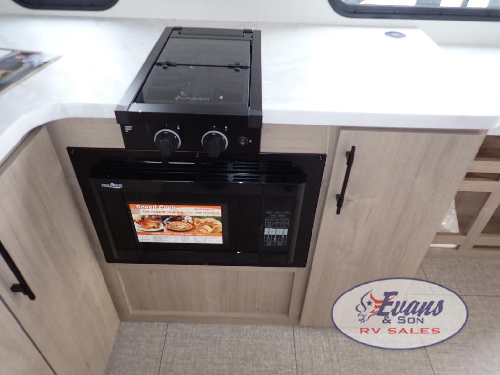 This simple, but cozy travel trailer is sure to meet all of your camping needs. There is a full rear bath with a shower skylight and wardrobe to keep your things tidy. The front kitchen includes ample counter space to prep meals and a bar tabletop dinette with three stools you are sure to love. A two burner cooktop also comes standard, along with a convection microwave, and an exterior griddle for when you want to cook outdoors under the 12' awning! The versatile Murphy bed provides seating and sleeping space each day, and the hi-definition LED TV across from the bed will let you watch movies at night.