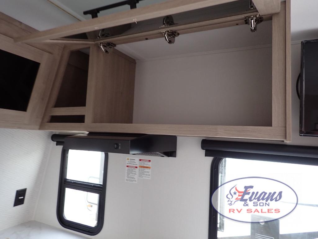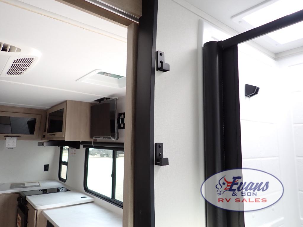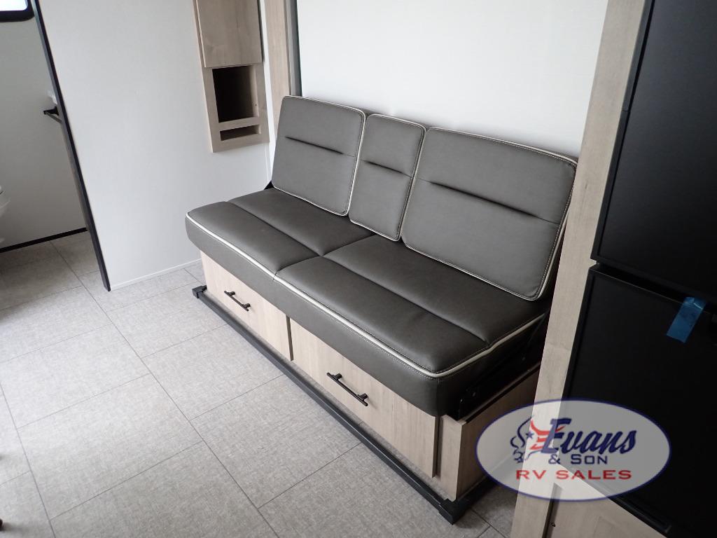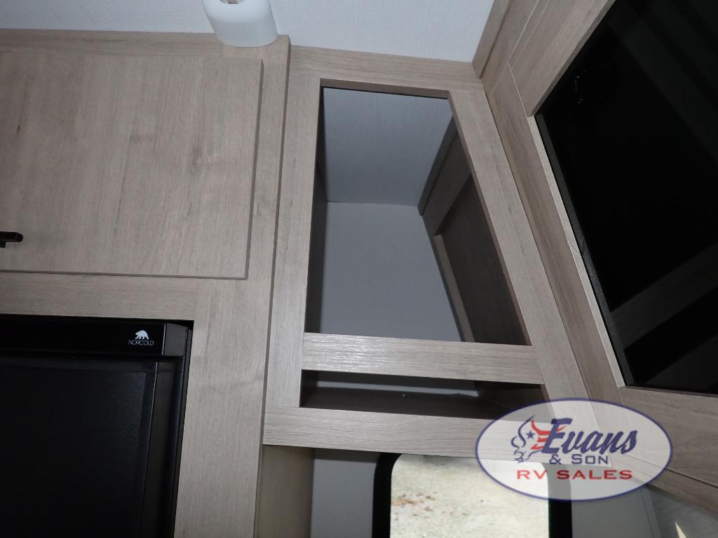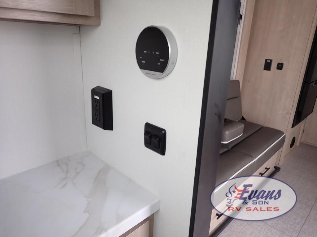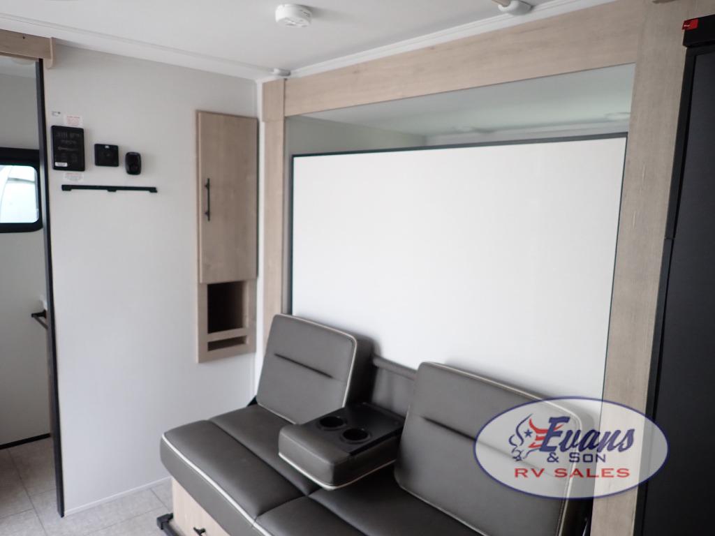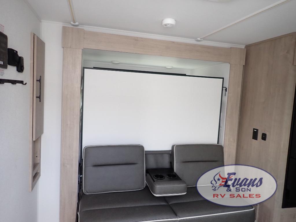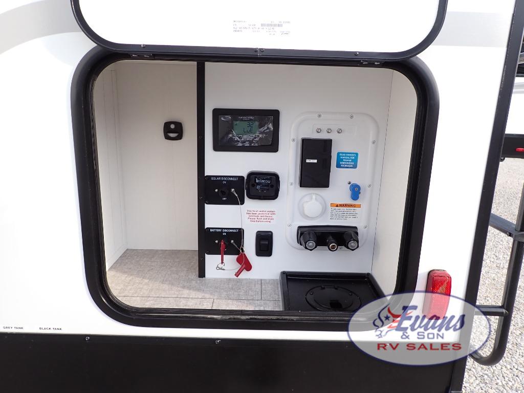 This simple, but cozy travel trailer is sure to meet all of your camping needs. There is a full rear bath with a shower skylight and wardrobe to keep your things tidy. The front kitchen includes ample counter space to prep meals and a bar tabletop dinette with three stools you are sure to love. A two burner cooktop also comes standard, along with a convection microwave, and an exterior griddle for when you want to cook outdoors under the 12' awning! The versatile Murphy bed provides seating and sleeping space each day, and the hi-definition LED TV across from the bed will let you watch movies at night.