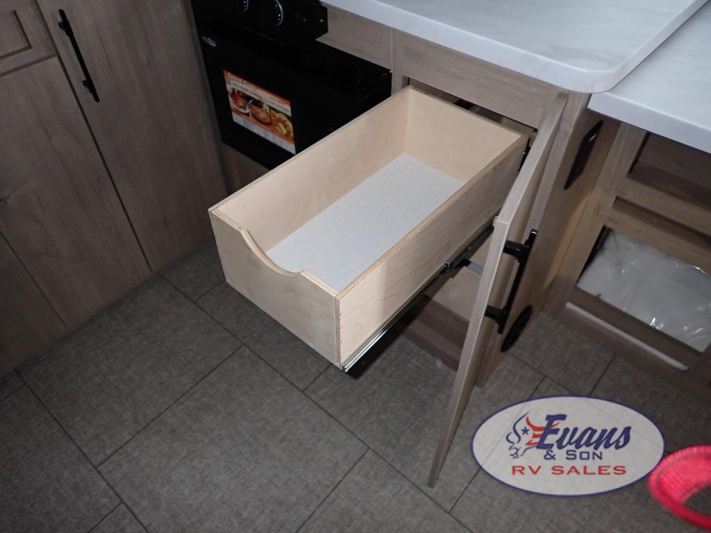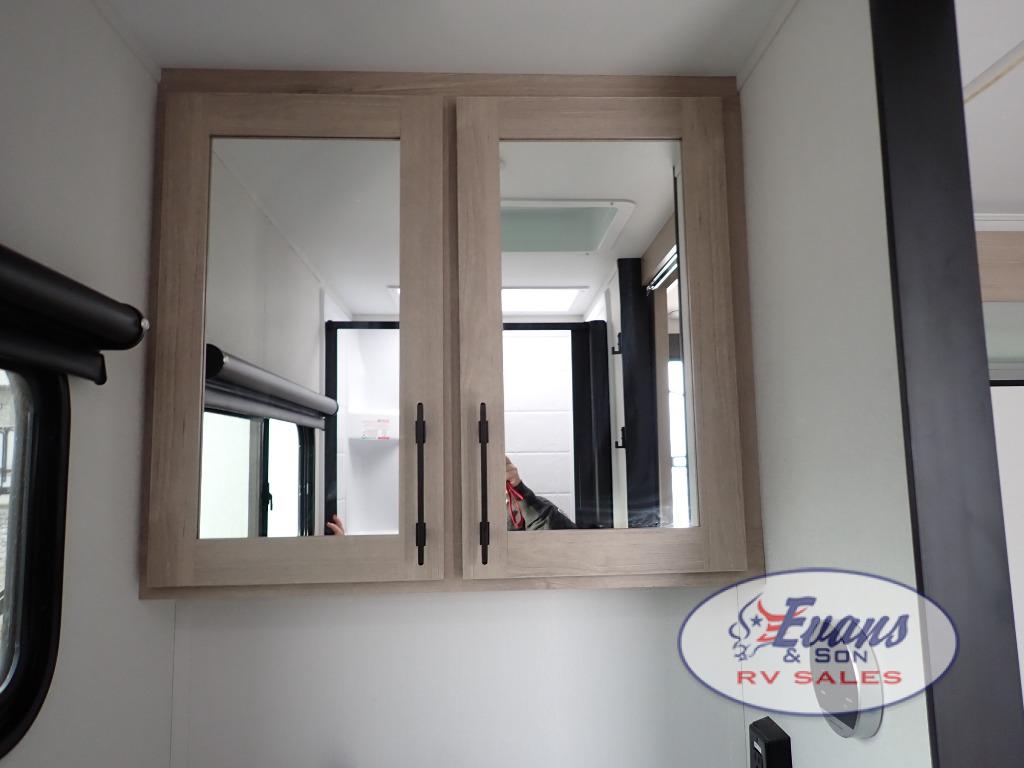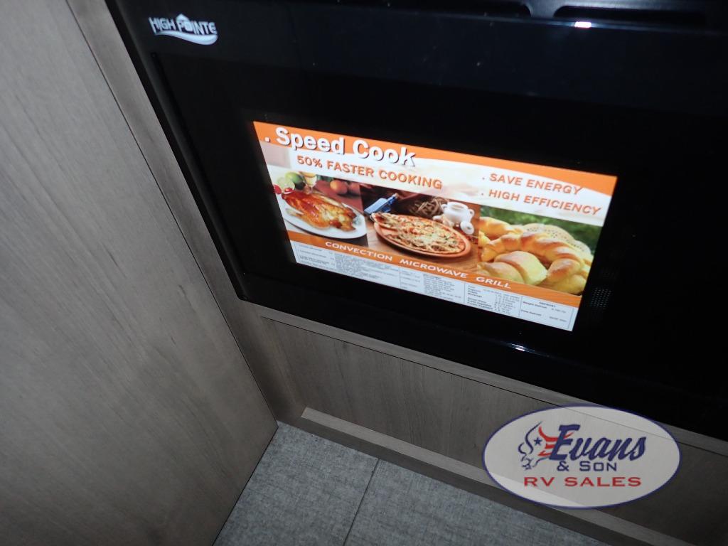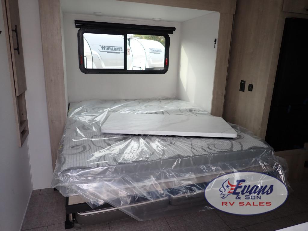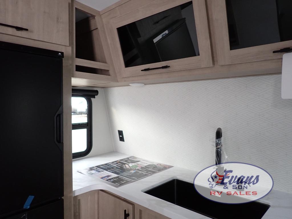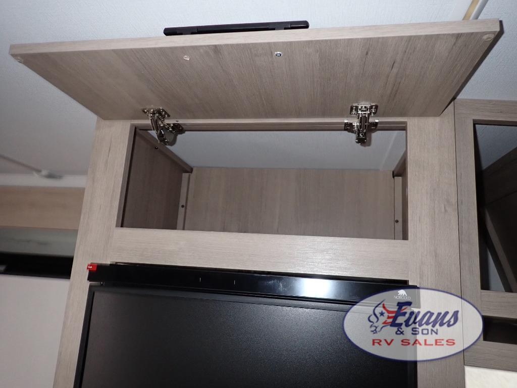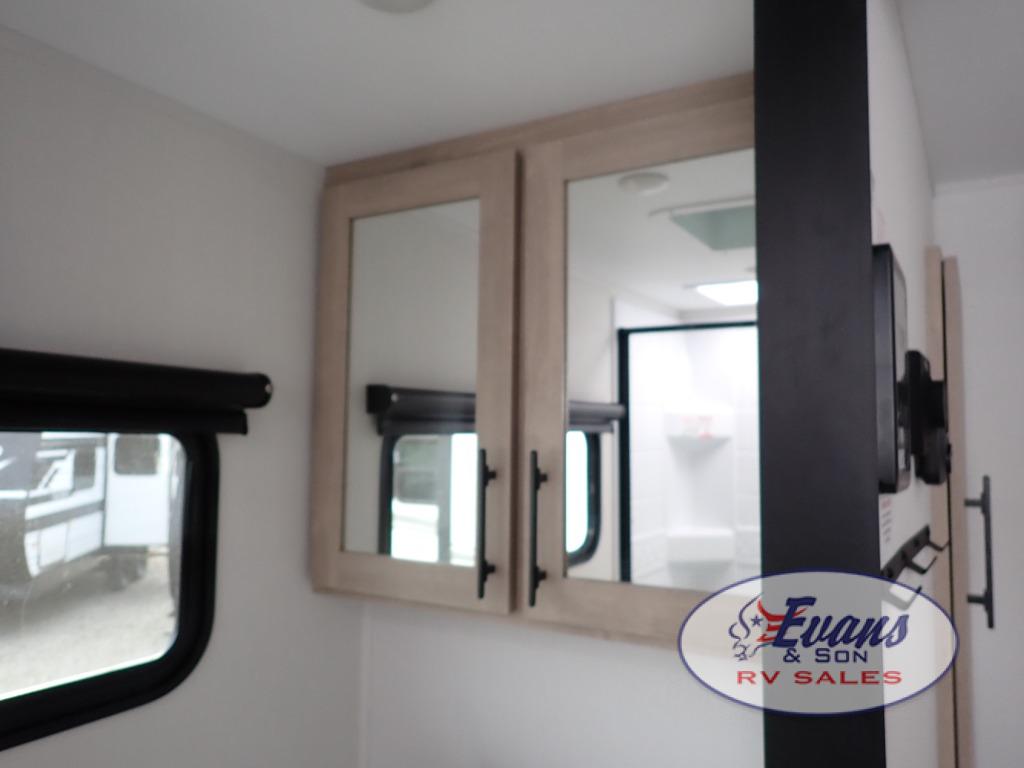 This simple, but cozy travel trailer is sure to meet all of your camping needs. There is a full rear bath with a shower skylight and wardrobe to keep your things tidy. The front kitchen includes ample counter space to prep meals and a bar tabletop dinette with three stools you are sure to love. A two burner cooktop also comes standard, along with a convection microwave, and an exterior griddle for when you want to cook outdoors under the 12' awning! The versatile Murphy bed provides seating and sleeping space each day, and the hi-definition LED TV across from the bed will let you watch movies at night.