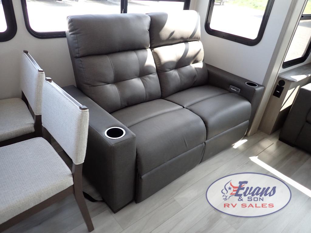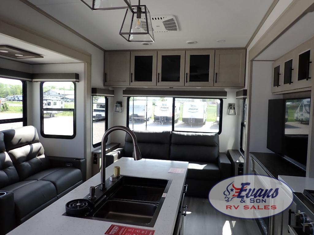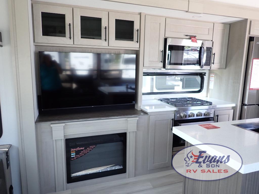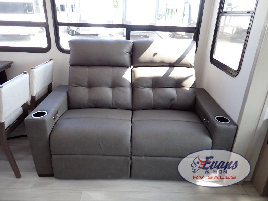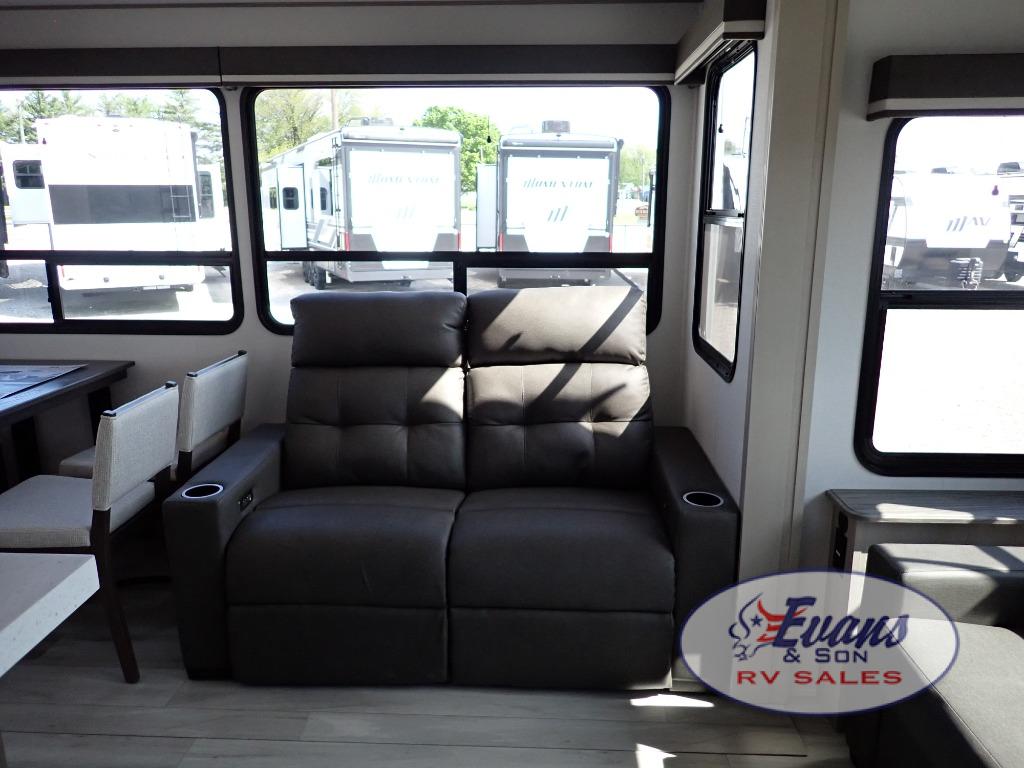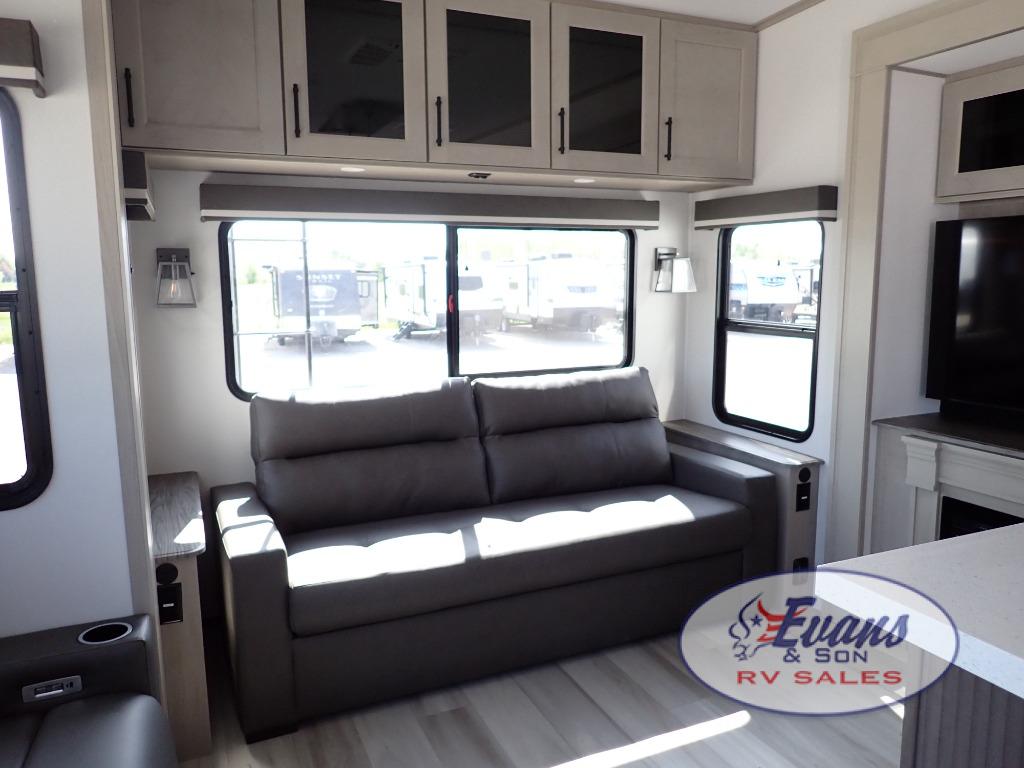 You'll feel right at home in this spacious fifth wheel with triple slides, a front master bedroom, and a kitchen island with extra counter space. The theatre seating is right across from the entertainment center which includes a 40" TV and fireplace, and there is a rear tri-fold sofa if you have any guests staying over. This model includes a hutch in the kitchen with cabinets above to store you nice dishes, plus there is a large pantry with washer and dryer prep if you plan to go full-time. Head to the dual entry bath that includes a linen closet and a spacious shower, and check out the front master bedroom with its queen bed, and slide out wardrobe.
