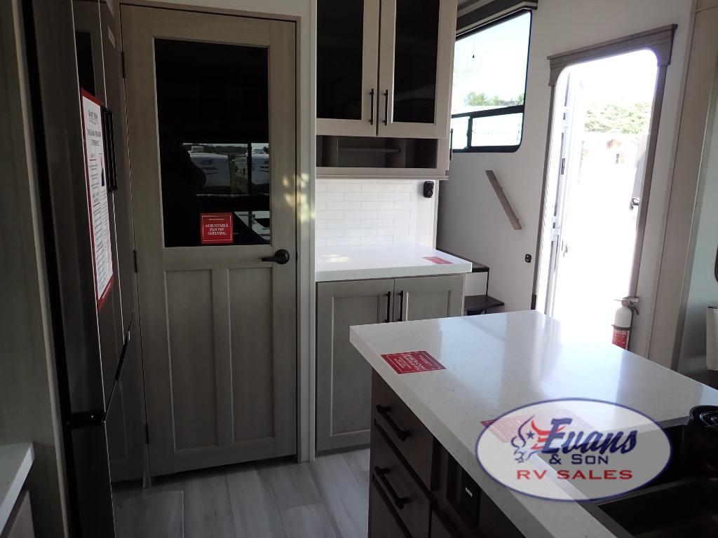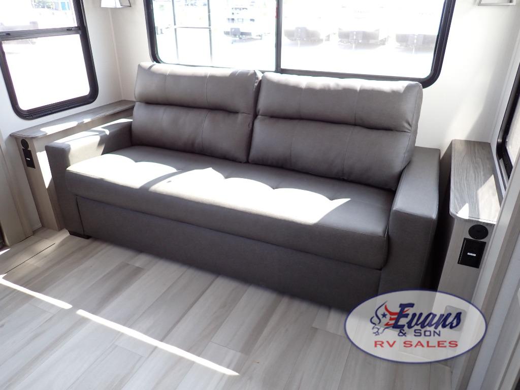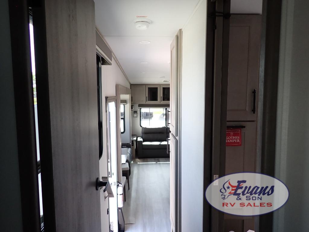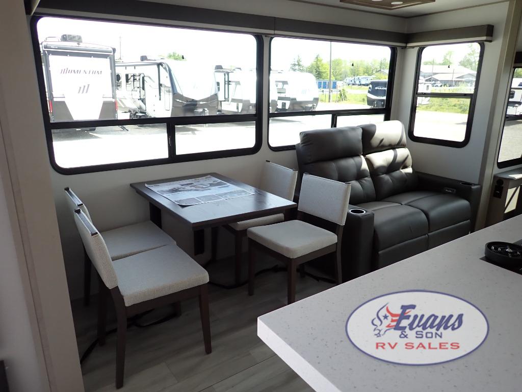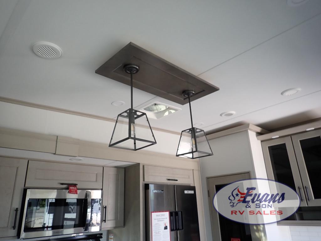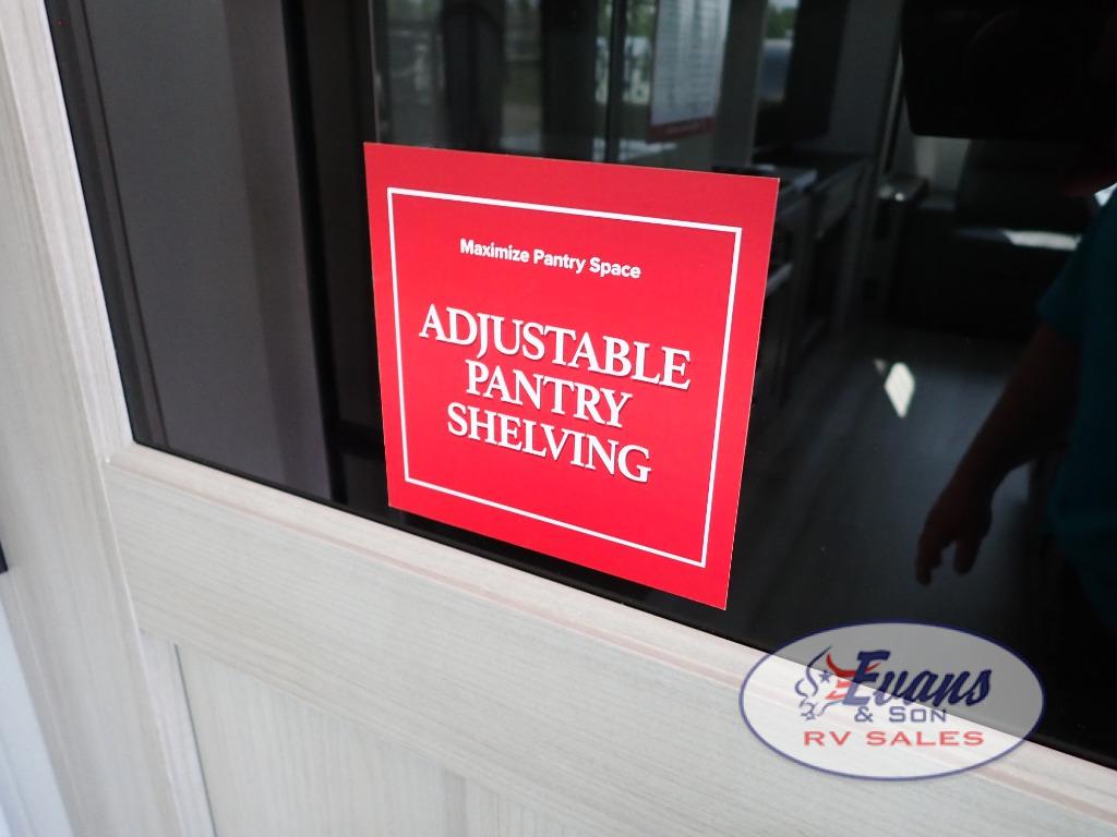 You'll feel right at home in this spacious fifth wheel with triple slides, a front master bedroom, and a kitchen island with extra counter space. The theatre seating is right across from the entertainment center which includes a 40" TV and fireplace, and there is a rear tri-fold sofa if you have any guests staying over. This model includes a hutch in the kitchen with cabinets above to store you nice dishes, plus there is a large pantry with washer and dryer prep if you plan to go full-time. Head to the dual entry bath that includes a linen closet and a spacious shower, and check out the front master bedroom with its queen bed, and slide out wardrobe.