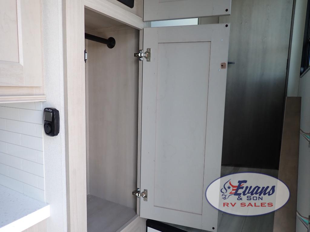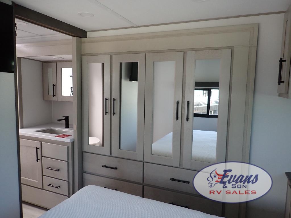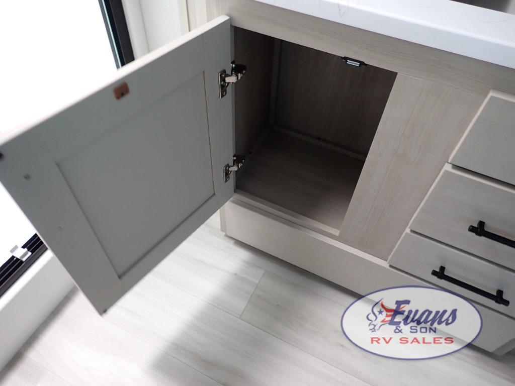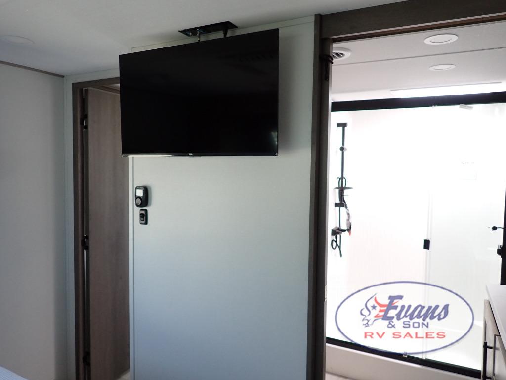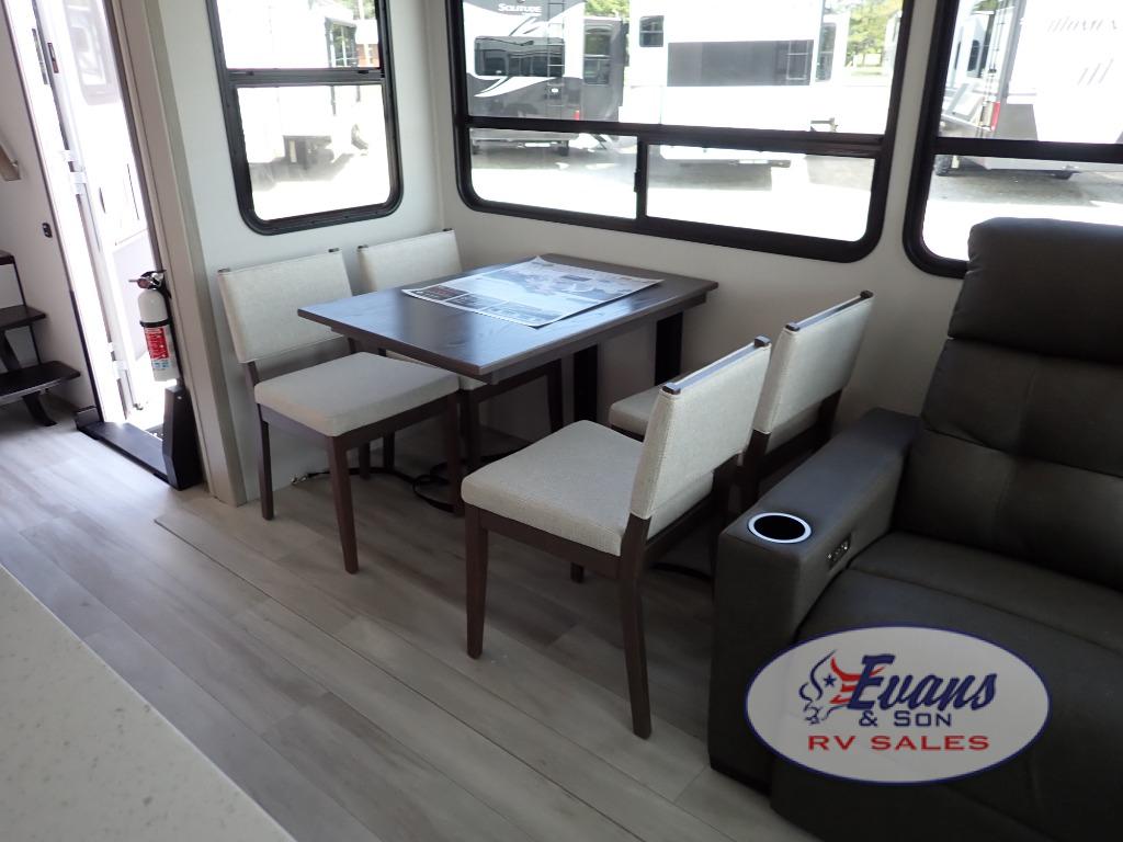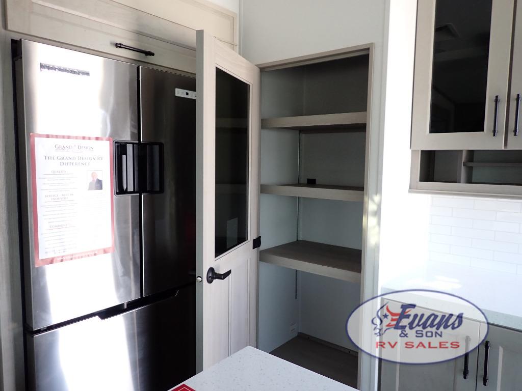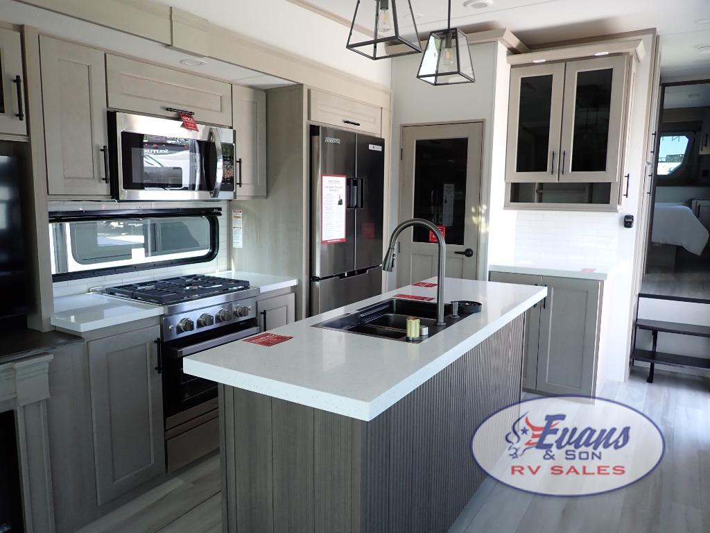 You'll feel right at home in this spacious fifth wheel with triple slides, a front master bedroom, and a kitchen island with extra counter space. The theatre seating is right across from the entertainment center which includes a 40" TV and fireplace, and there is a rear tri-fold sofa if you have any guests staying over. This model includes a hutch in the kitchen with cabinets above to store you nice dishes, plus there is a large pantry with washer and dryer prep if you plan to go full-time. Head to the dual entry bath that includes a linen closet and a spacious shower, and check out the front master bedroom with its queen bed, and slide out wardrobe.