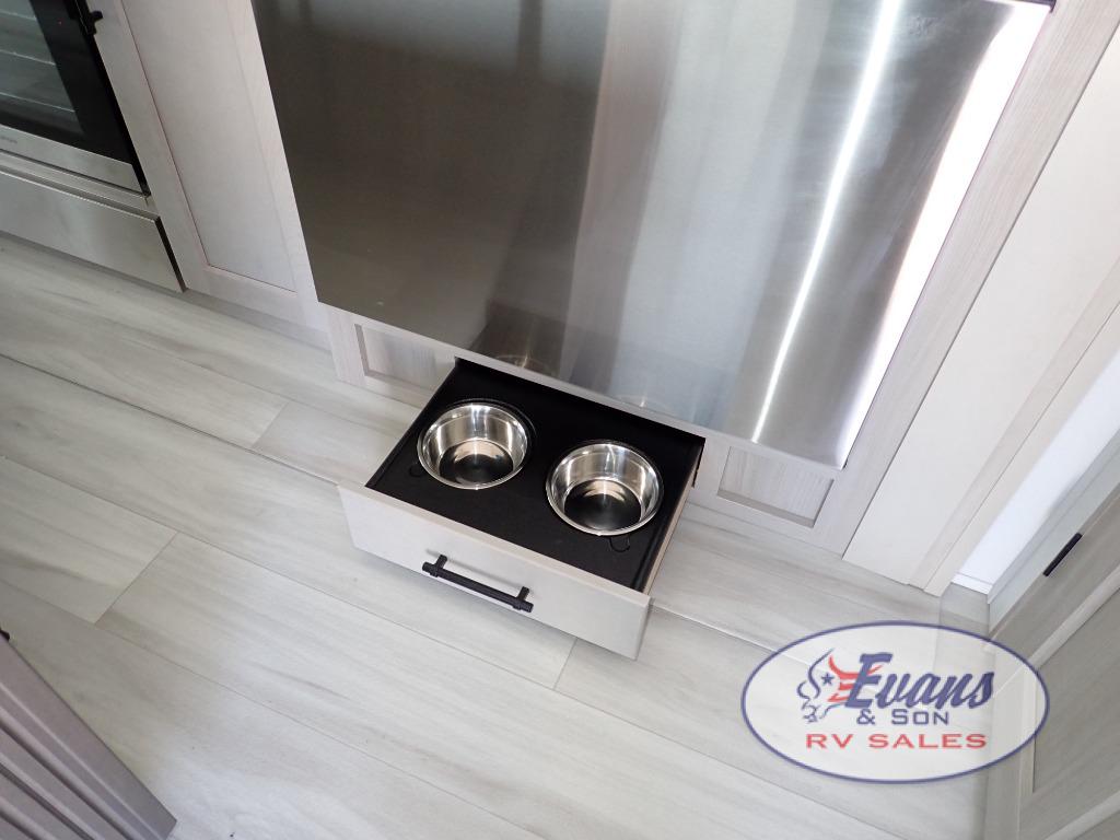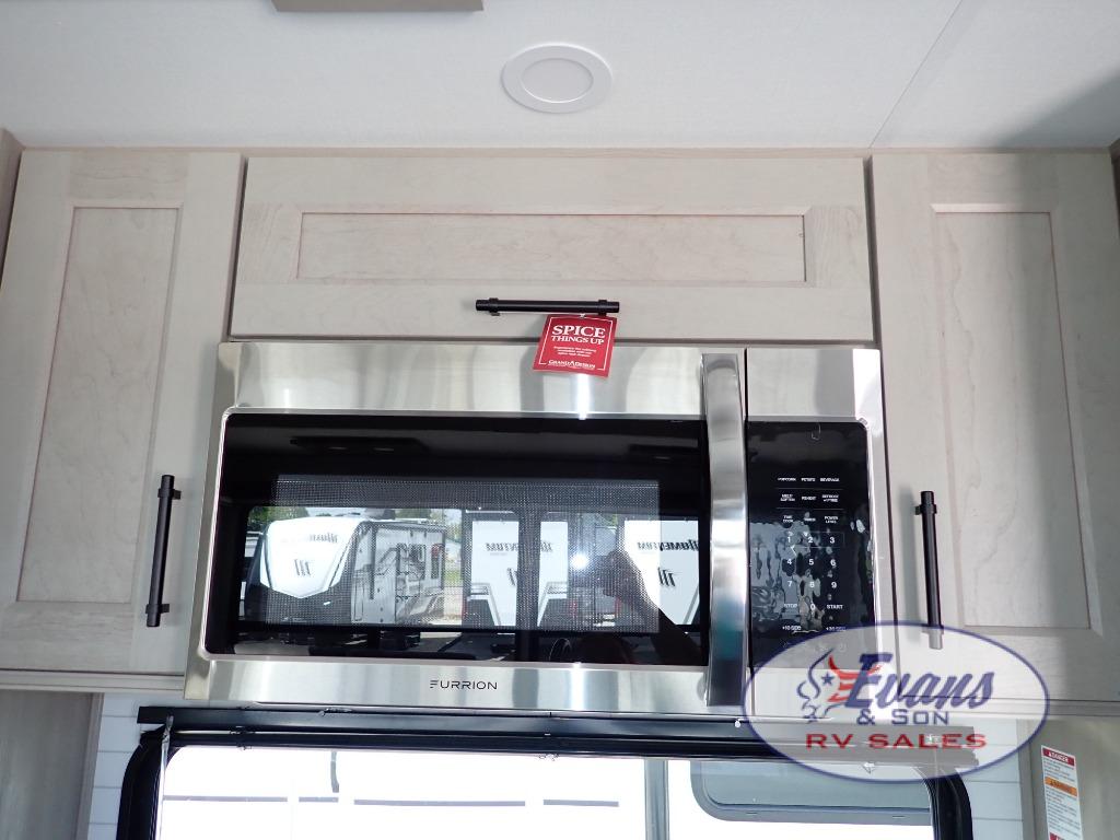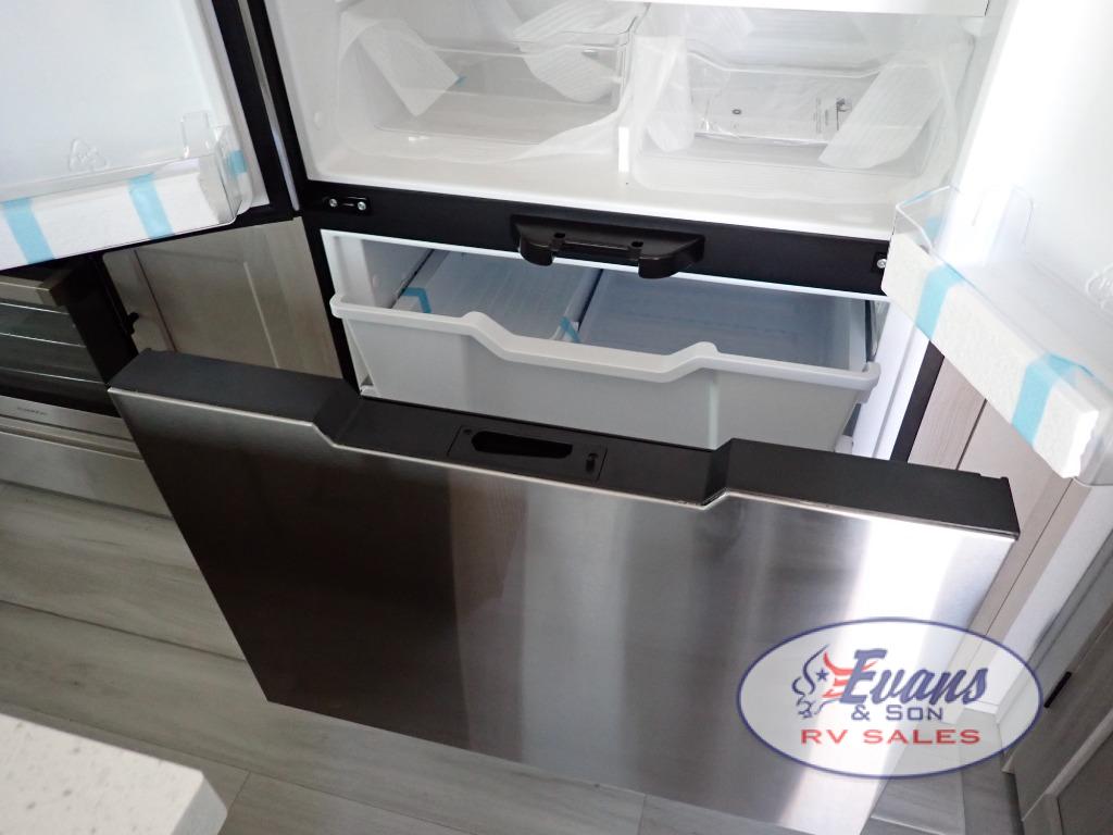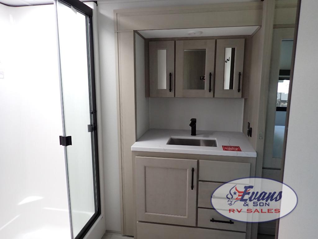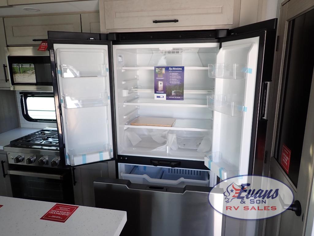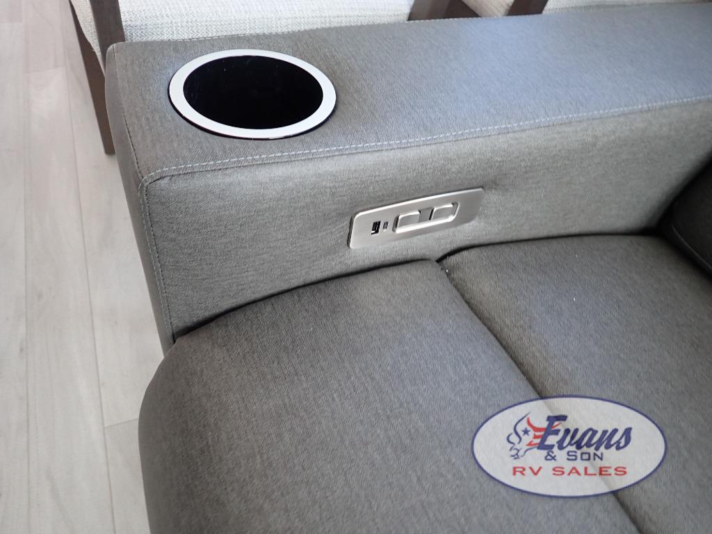You'll feel right at home in this spacious fifth wheel with triple slides, a front master bedroom, and a kitchen island with extra counter space. The theatre seating is right across from the entertainment center which includes a 40" TV and fireplace, and there is a rear tri-fold sofa if you have any guests staying over. This model includes a hutch in the kitchen with cabinets above to store you nice dishes, plus there is a large pantry with washer and dryer prep if you plan to go full-time. Head to the dual entry bath that includes a linen closet and a spacious shower, and check out the front master bedroom with its queen bed, and slide out wardrobe.