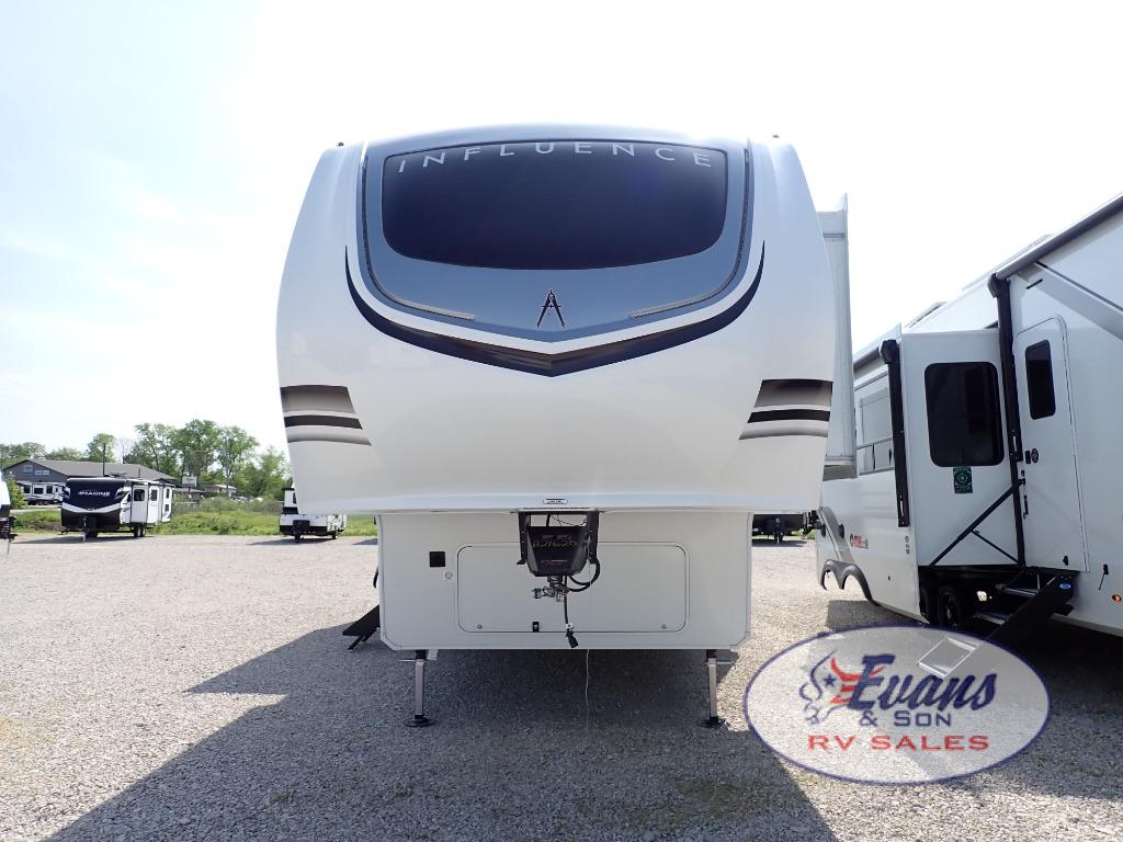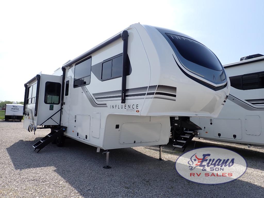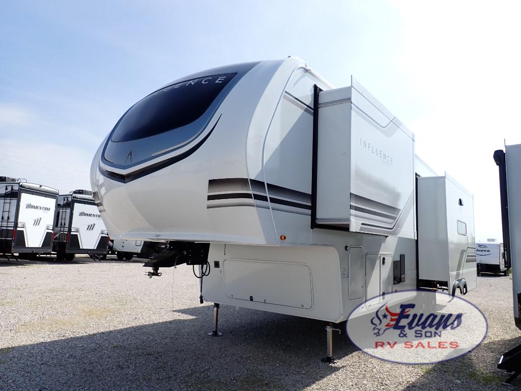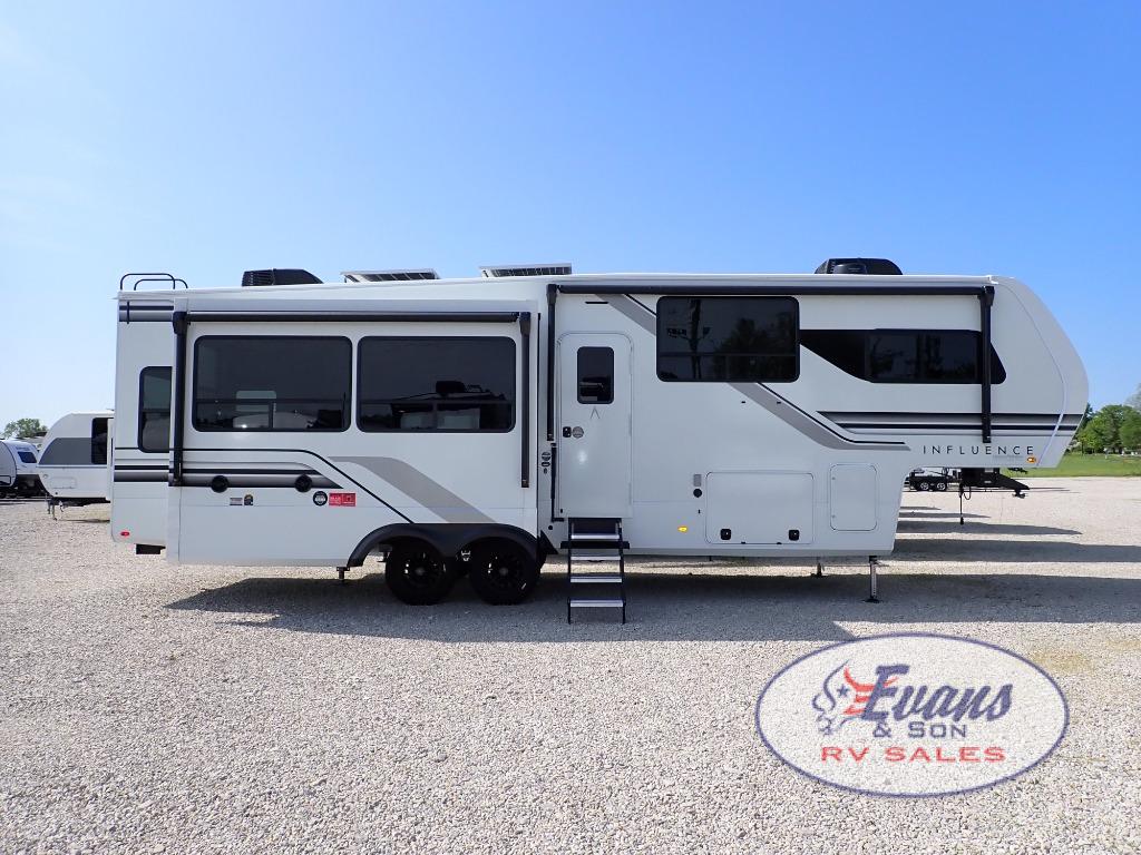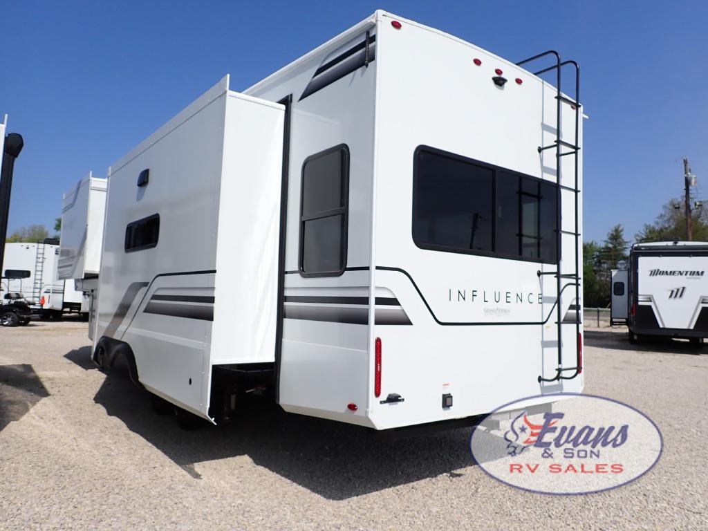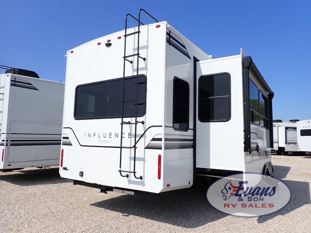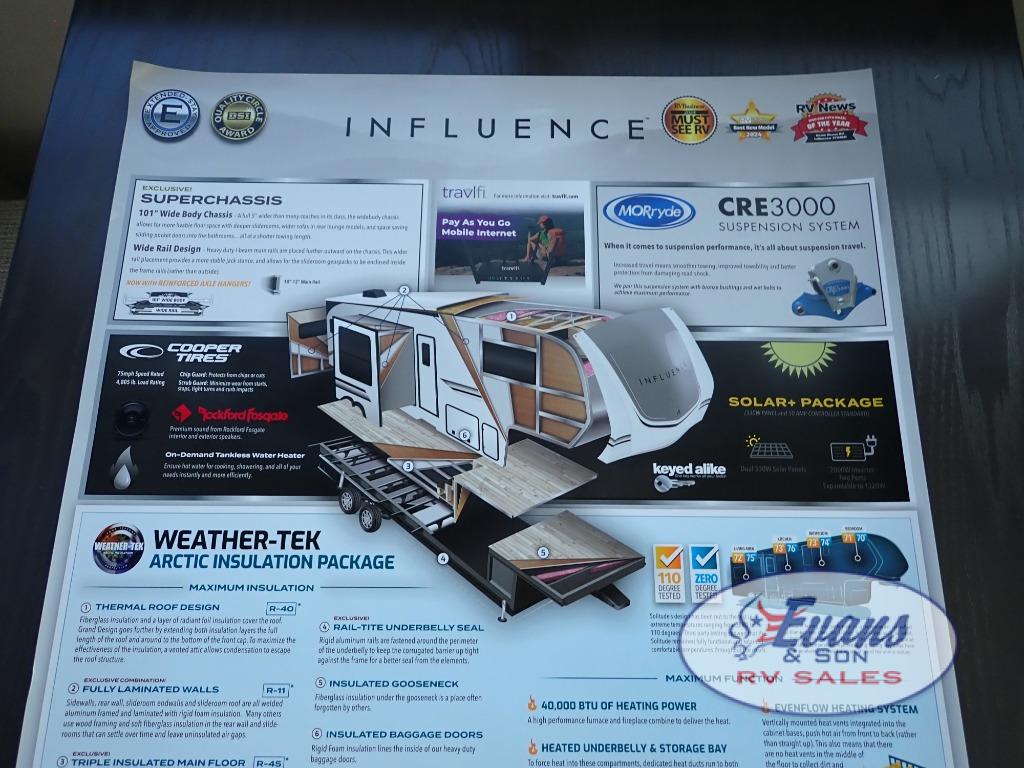 Any Grand Design Influence fifth wheel features five-sided aluminum cage construction with a walk-on roof and a fully enclosed underbelly with heated tanks and storage for all weather camping. For peace of mind, the MORryde CRE3000 Suspension system will provide safe and smooth towing, and the 101" widebody construction offers all the room you need and that is before multiple slides are fully engaged. You will appreciate the Keyed-Alike locks, slam-latch baggage doors with magnetic door catches, exterior security light, and SolidStep entry steps. On the inside, Congoleum flooring, premium roller shades for privacy, a hallway handrail for safety, and nightstands with USB ports to keep all of your electronics fully charged. You will also love the on demand tankless water heater when showering, plus the added heat and ambiance from an electric fireplace, and so much more!