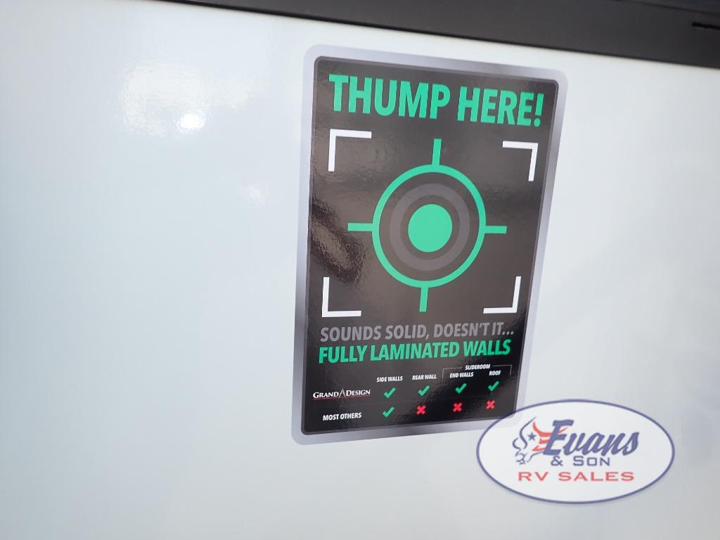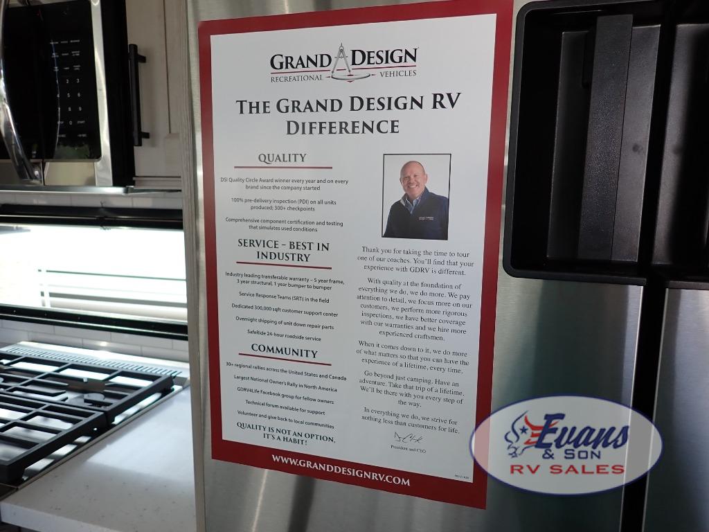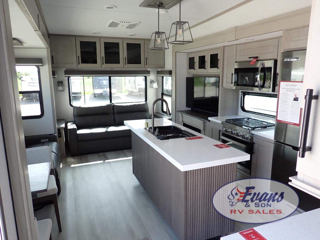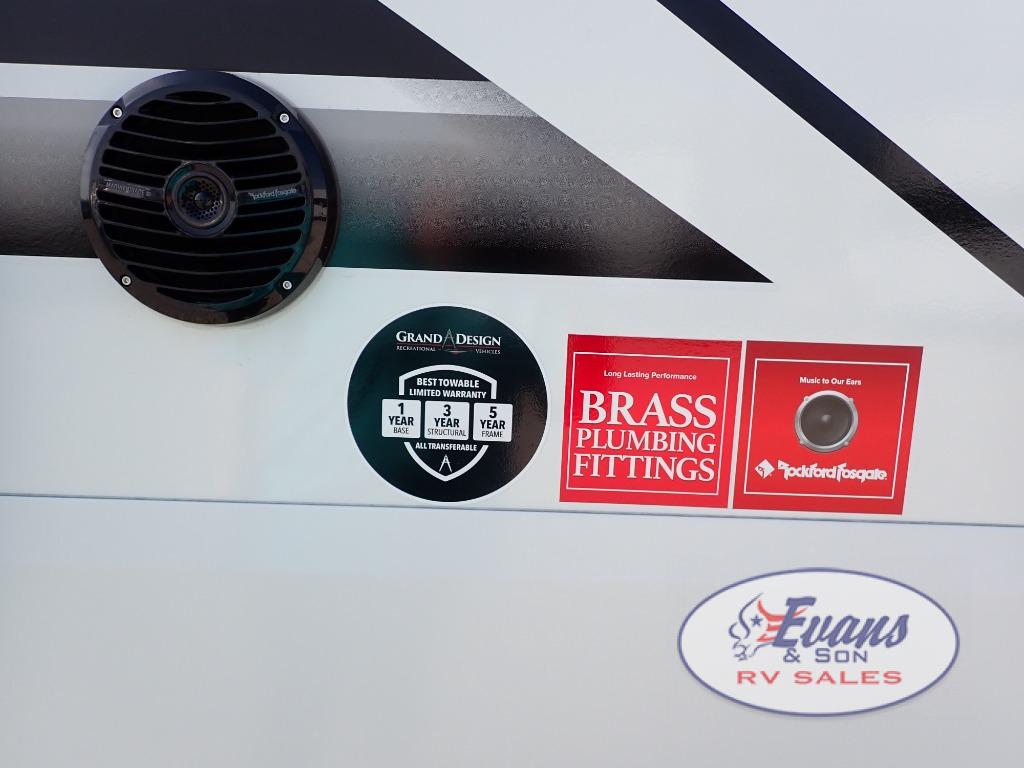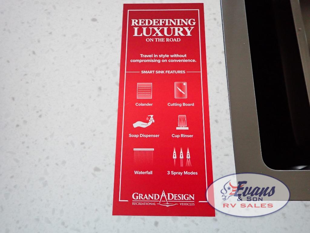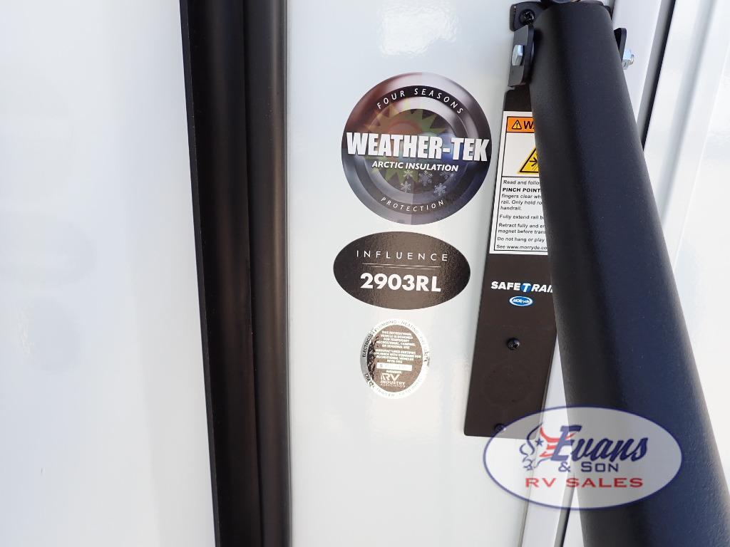 Any Grand Design Influence fifth wheel features five-sided aluminum cage construction with a walk-on roof and a fully enclosed underbelly with heated tanks and storage for all weather camping. For peace of mind, the MORryde CRE3000 Suspension system will provide safe and smooth towing, and the 101" widebody construction offers all the room you need and that is before multiple slides are fully engaged. You will appreciate the Keyed-Alike locks, slam-latch baggage doors with magnetic door catches, exterior security light, and SolidStep entry steps. On the inside, Congoleum flooring, premium roller shades for privacy, a hallway handrail for safety, and nightstands with USB ports to keep all of your electronics fully charged. You will also love the on demand tankless water heater when showering, plus the added heat and ambiance from an electric fireplace, and so much more!