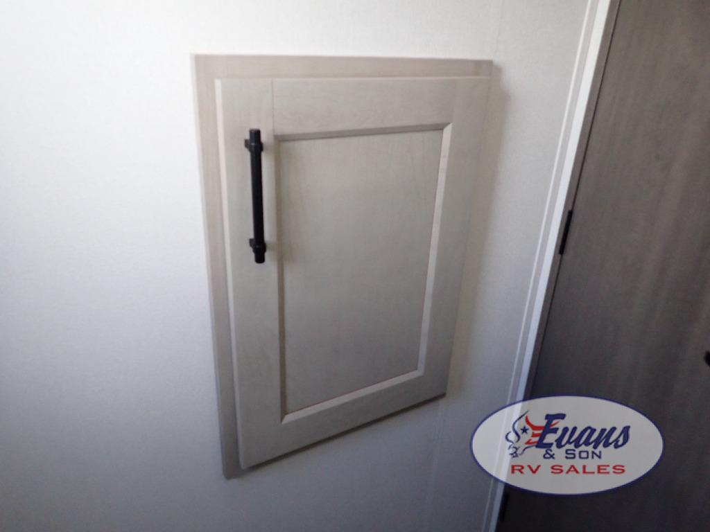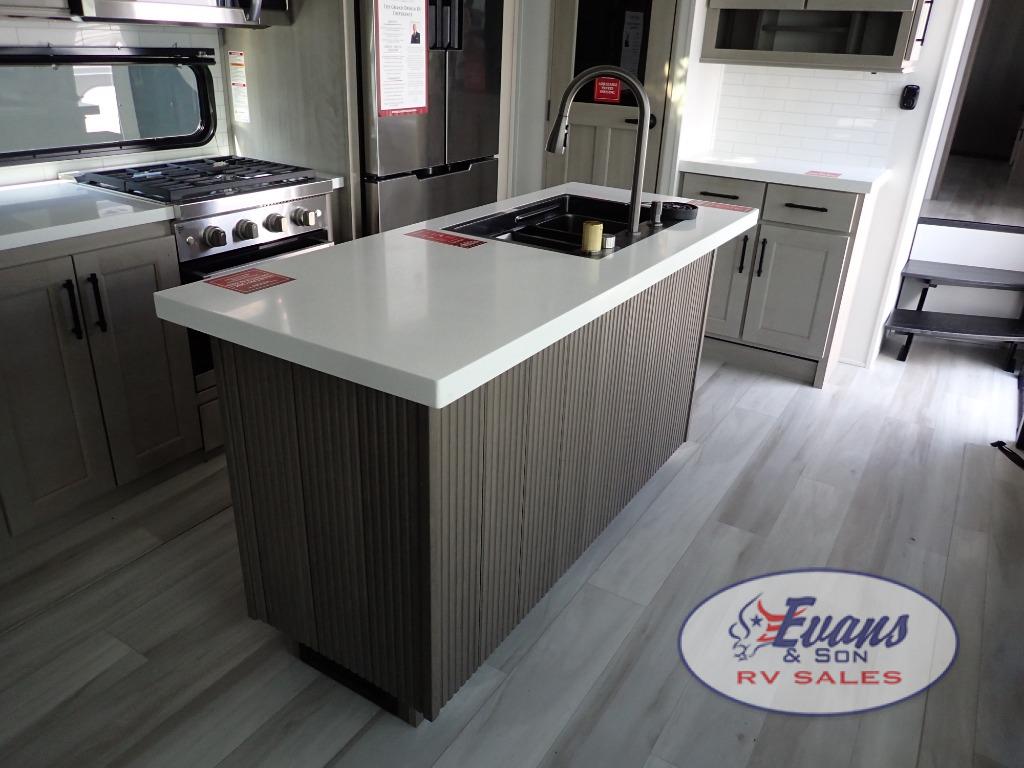 Grab the whole gang and head out in this fifth wheel featuring a private bunkhouse that sleeps five. This unit also features dual entry doors for added convenience with one set leading into a half bath, and quad slides for even more space in this widebody layout. The combined kitchen and living area featuring dual opposing slides offer space to dine and relax including theater seating for two opposite the entertainment center and fireplace. The chef in your group will appreciate the amenities for dreaming up dishes to feed everyone, and the outside griddle, sink and beverage cooler provides even more options. In front, a private bedroom and full bath with a queen bed or optional king, your choice. You can even add a washer and dryer with a space in front prepped for both if you like.