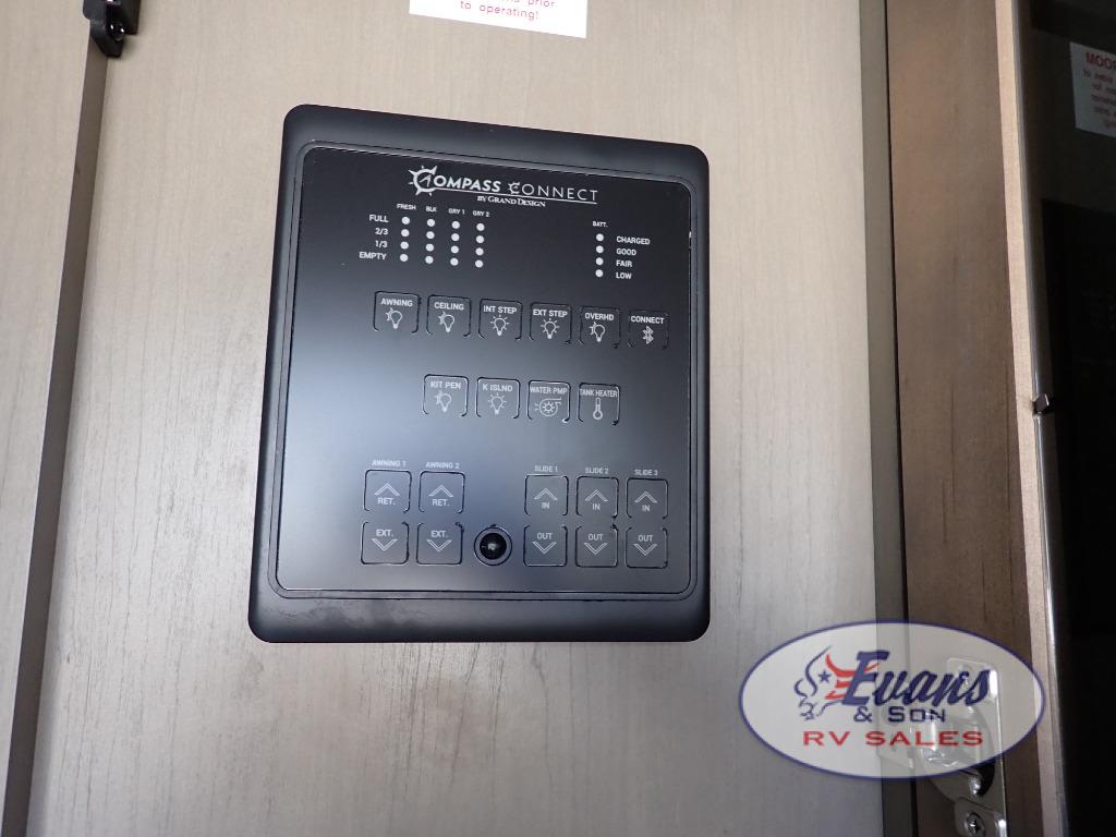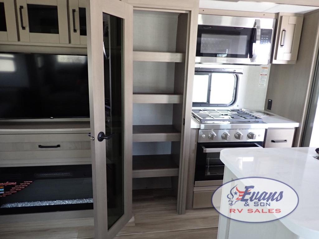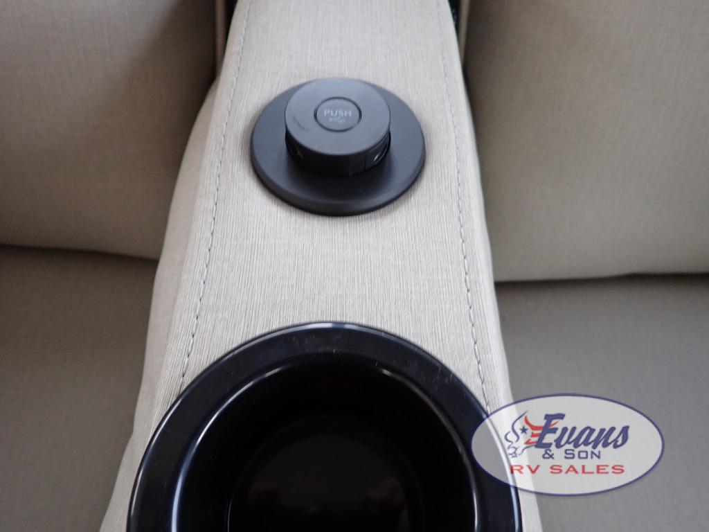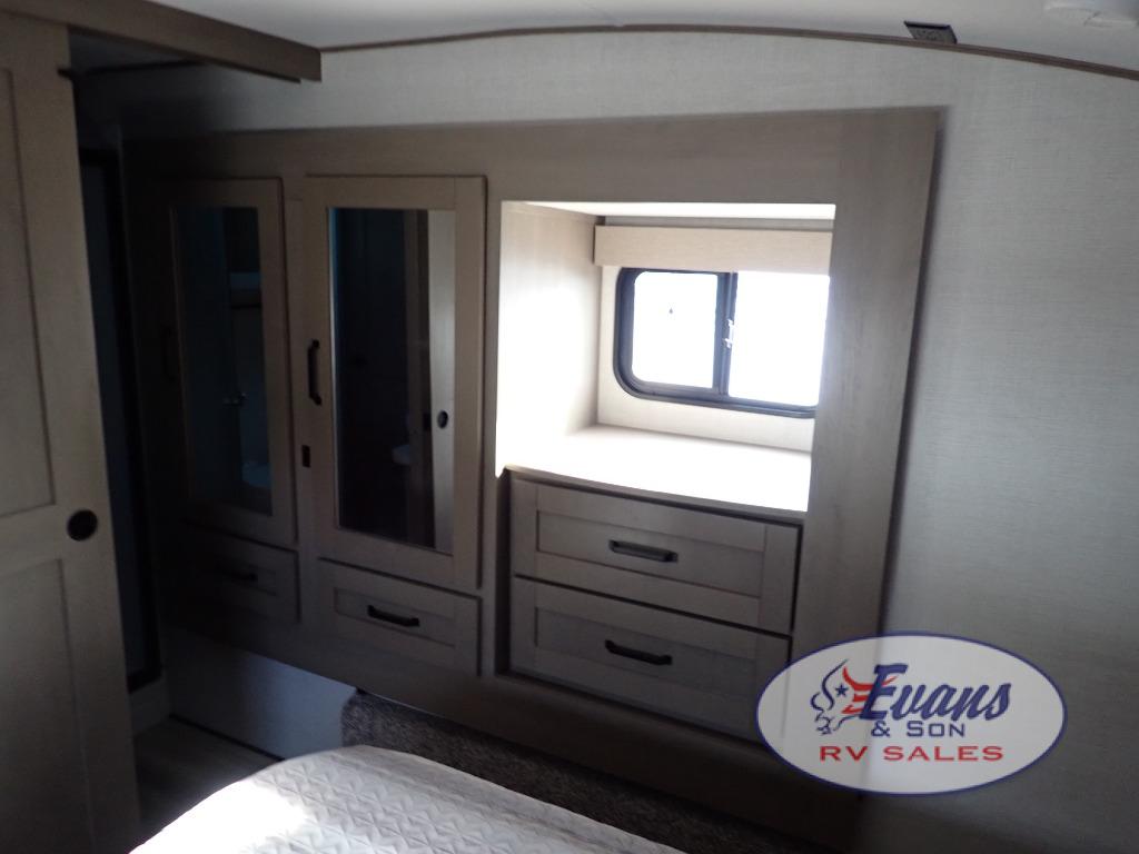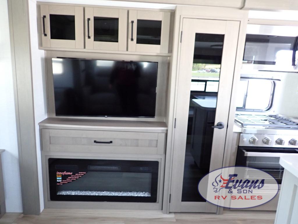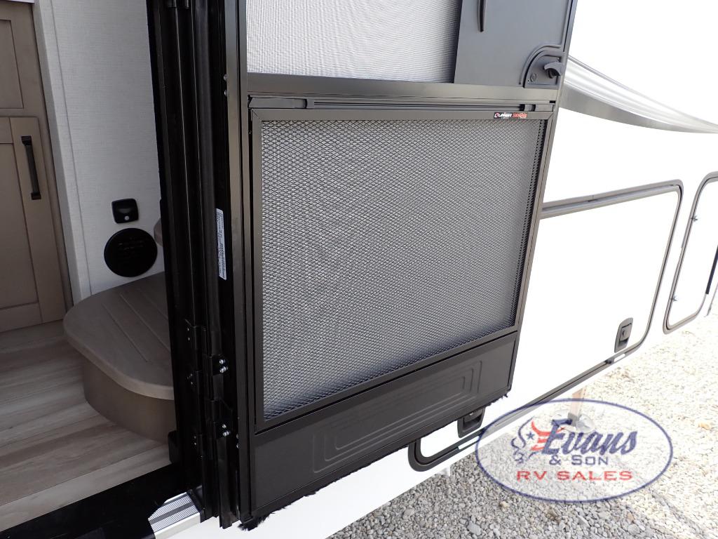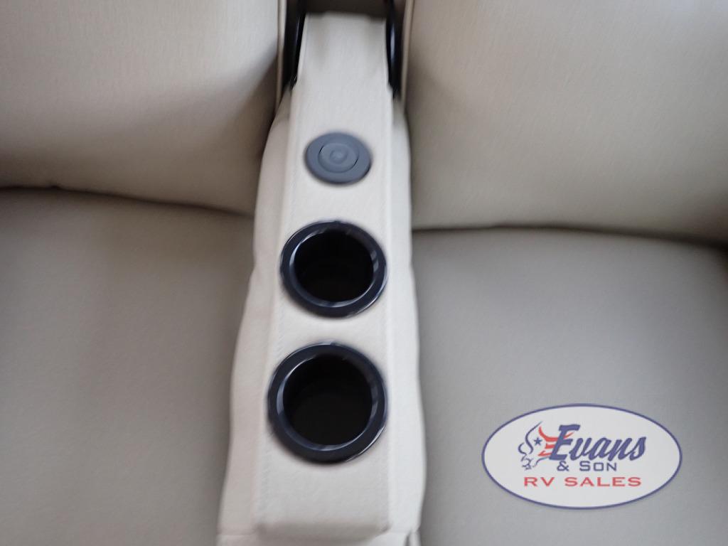Whether you travel for pleasure or work, you will love the spacious main living and kitchen area with a rear tri-fold sofa that doubles as extra sleeping space, and the theater seating directly across from the entertainment center with a 40" LED HDTV and a fireplace below. The kitchen island will make meal prepping and drying the dishes easier and the hutch is the perfect place to place your picture frames, nice dishes, and extra cooking items. There is even a pantry that is big enough to store all of your favorite snacks, dry ingredients and such. Outside you can enjoy two electric awnings that provide protection from the elements as you relax and visit with other RVers, and your camping chairs can easily be stored in the pass-through compartment. The double entry bathroom is convenient especially at night when you can slide the door to enter from the front master bedroom. You will find plenty of storage for your clothing and gear, plus the bedroom slide out gives you drawers and linen storage that stretches into the full bathroom.