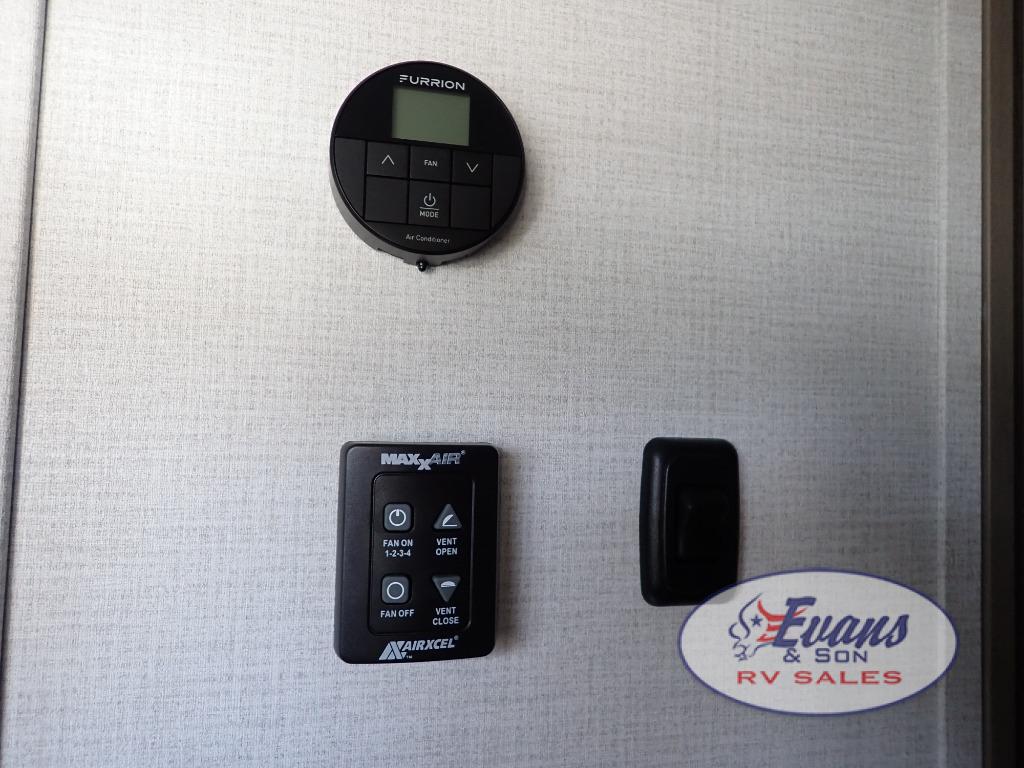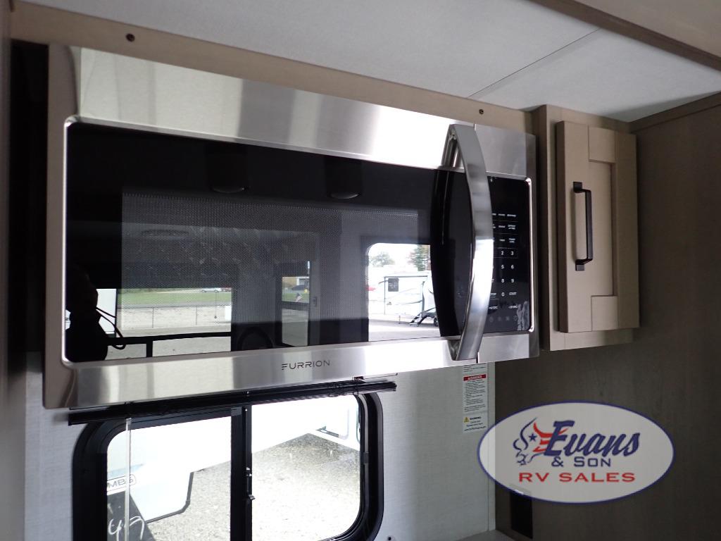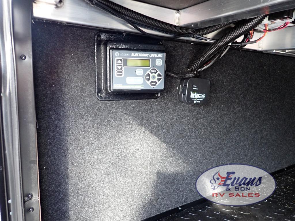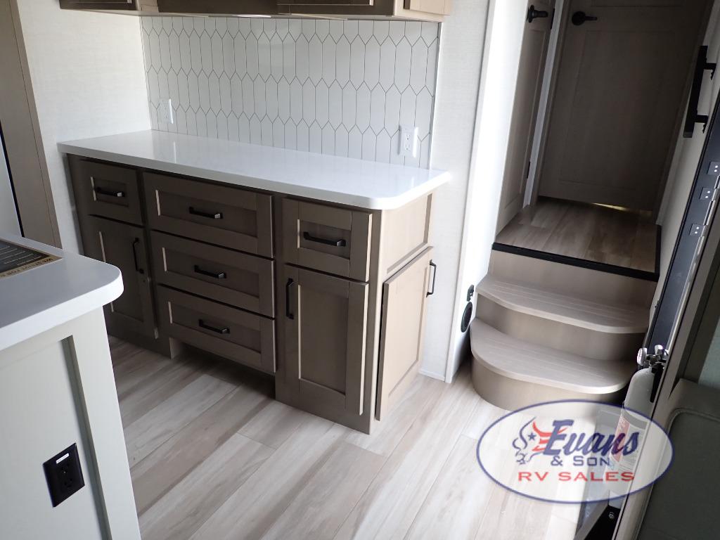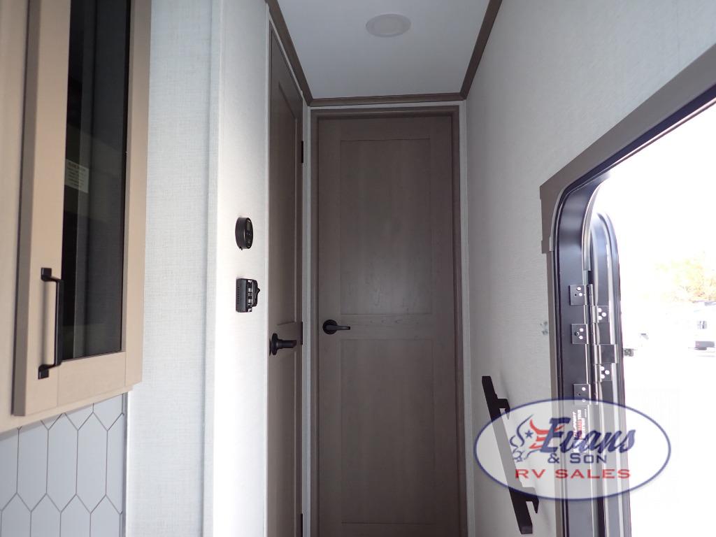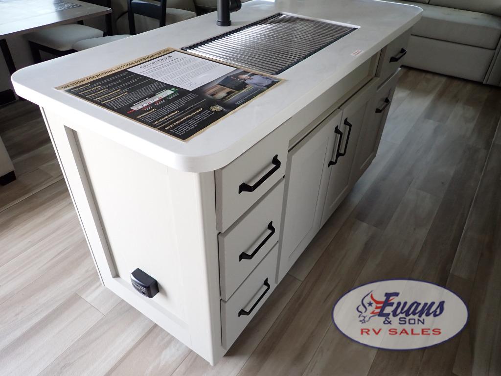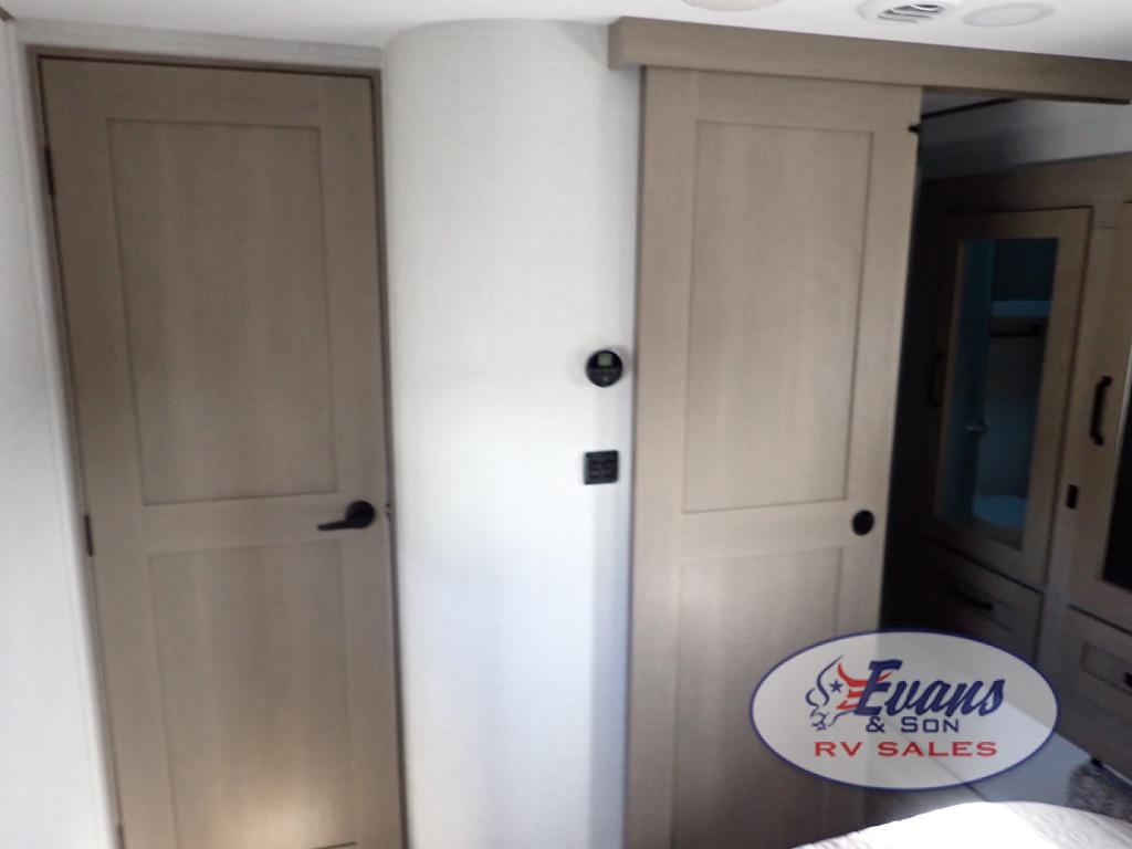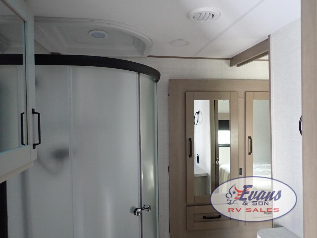 Whether you travel for pleasure or work, you will love the spacious main living and kitchen area with a rear tri-fold sofa that doubles as extra sleeping space, and the theater seating directly across from the entertainment center with a 40" LED HDTV and a fireplace below. The kitchen island will make meal prepping and drying the dishes easier and the hutch is the perfect place to place your picture frames, nice dishes, and extra cooking items. There is even a pantry that is big enough to store all of your favorite snacks, dry ingredients and such. Outside you can enjoy two electric awnings that provide protection from the elements as you relax and visit with other RVers, and your camping chairs can easily be stored in the pass-through compartment. The double entry bathroom is convenient especially at night when you can slide the door to enter from the front master bedroom. You will find plenty of storage for your clothing and gear, plus the bedroom slide out gives you drawers and linen storage that stretches into the full bathroom.
