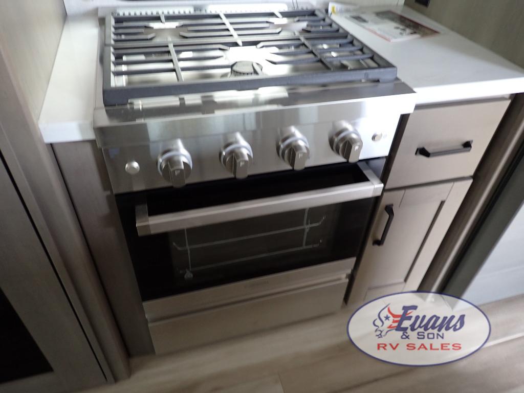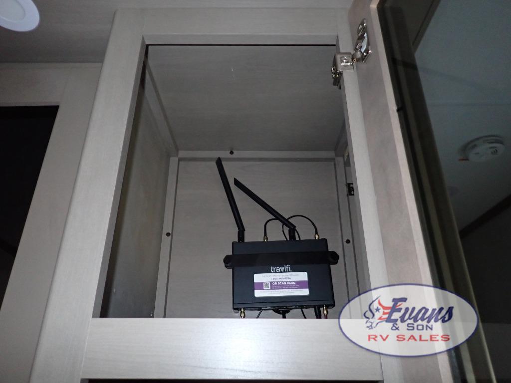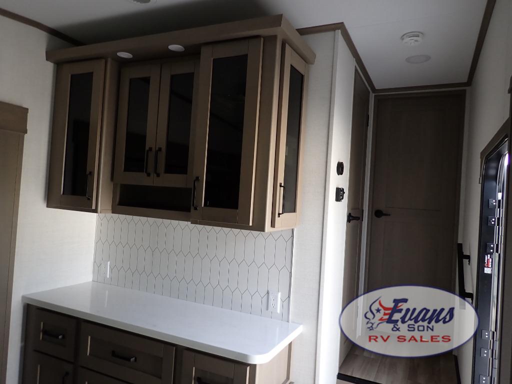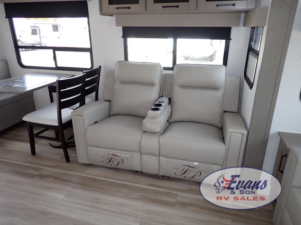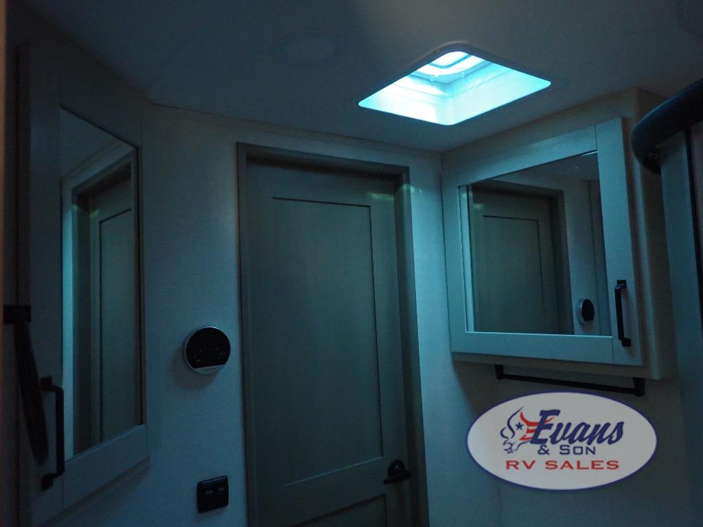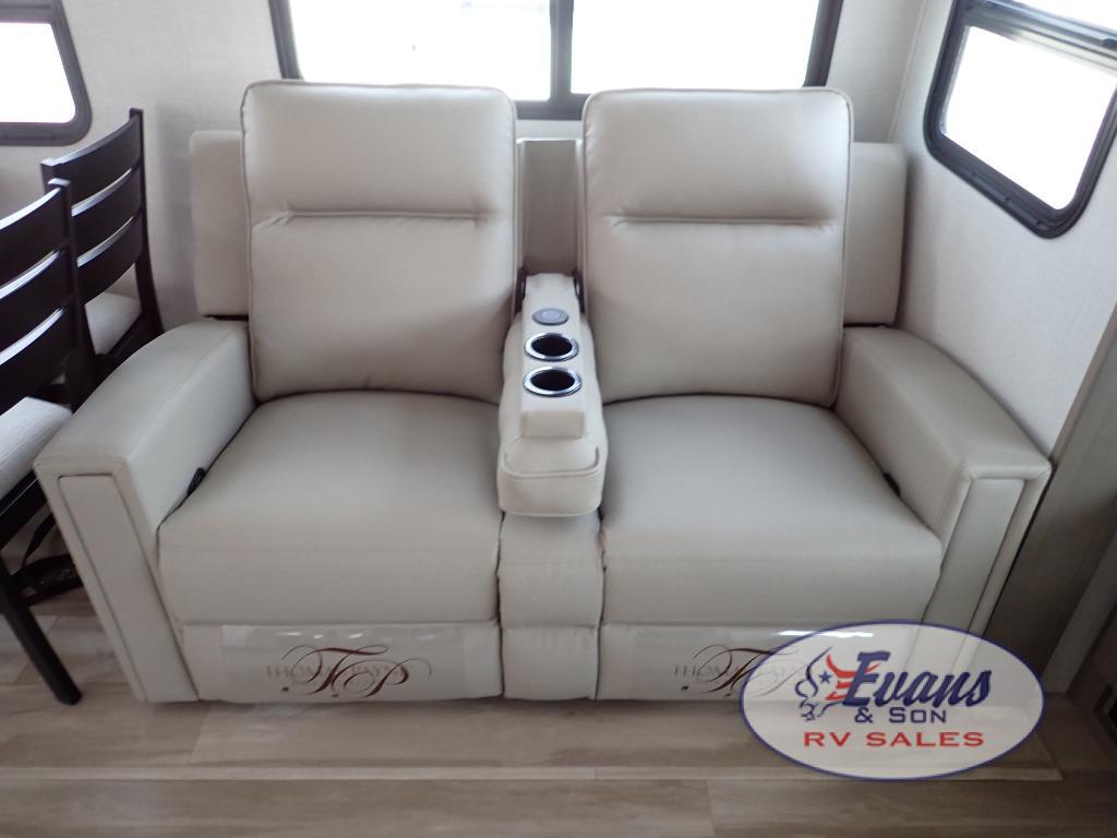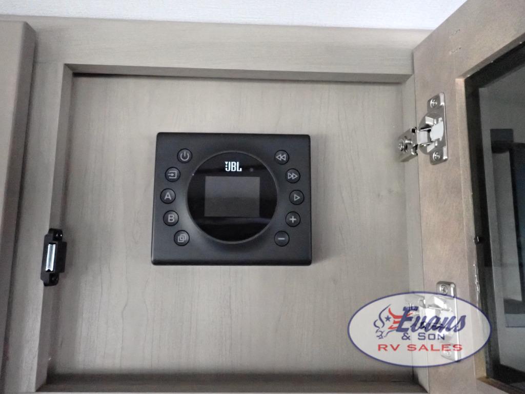 Whether you travel for pleasure or work, you will love the spacious main living and kitchen area with a rear tri-fold sofa that doubles as extra sleeping space, and the theater seating directly across from the entertainment center with a 40" LED HDTV and a fireplace below. The kitchen island will make meal prepping and drying the dishes easier and the hutch is the perfect place to place your picture frames, nice dishes, and extra cooking items. There is even a pantry that is big enough to store all of your favorite snacks, dry ingredients and such. Outside you can enjoy two electric awnings that provide protection from the elements as you relax and visit with other RVers, and your camping chairs can easily be stored in the pass-through compartment. The double entry bathroom is convenient especially at night when you can slide the door to enter from the front master bedroom. You will find plenty of storage for your clothing and gear, plus the bedroom slide out gives you drawers and linen storage that stretches into the full bathroom.