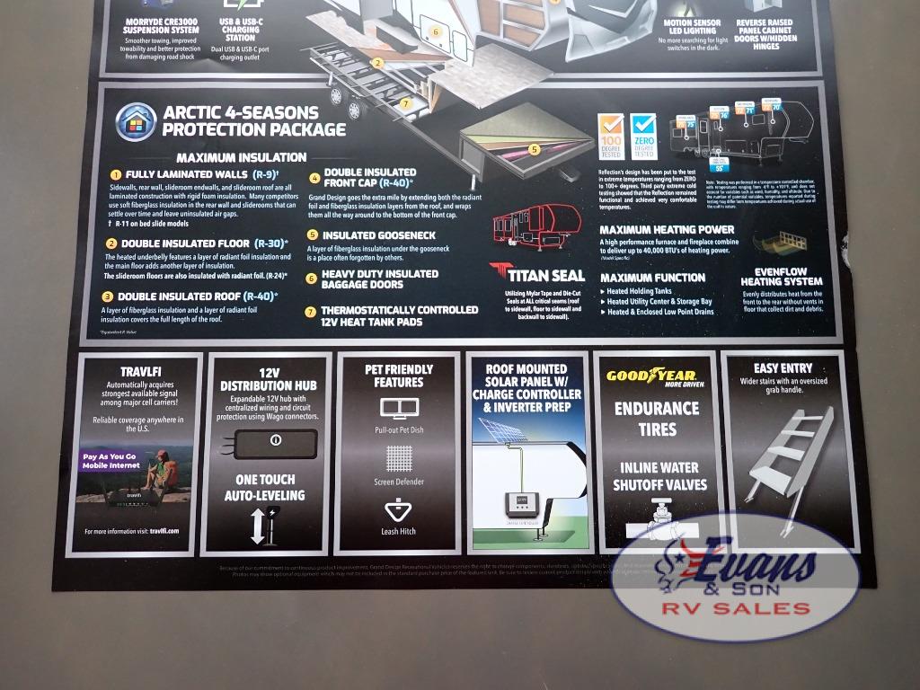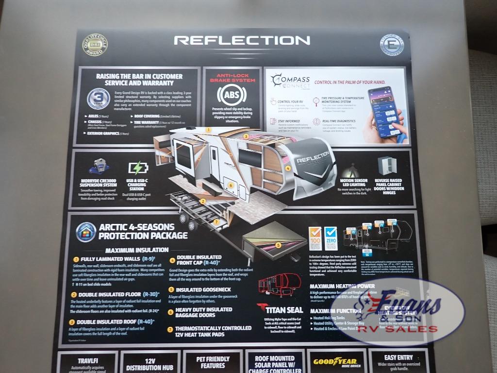 Each Reflection fifth wheel and travel trailer by Grand Design is packed with luxury features for an overall better camping experience! The MORryde 3000CRE suspension provides smooth towing to your destination and the durable construction materials mean you can enjoy your RV for years to come. These units include the Arctic 4-Seasons Protection Package that will extend your camping season thanks to the extreme temperature testing and maximum heating power. The interior of these travel trailers and fifth wheels are designed to make you feel at home with residential cabinetry, solid surface countertops, roller shades, a spacious shower with a glass door, residential bedrooms, and the list goes on! Choose a Reflection today and start a new adventure tomorrow!