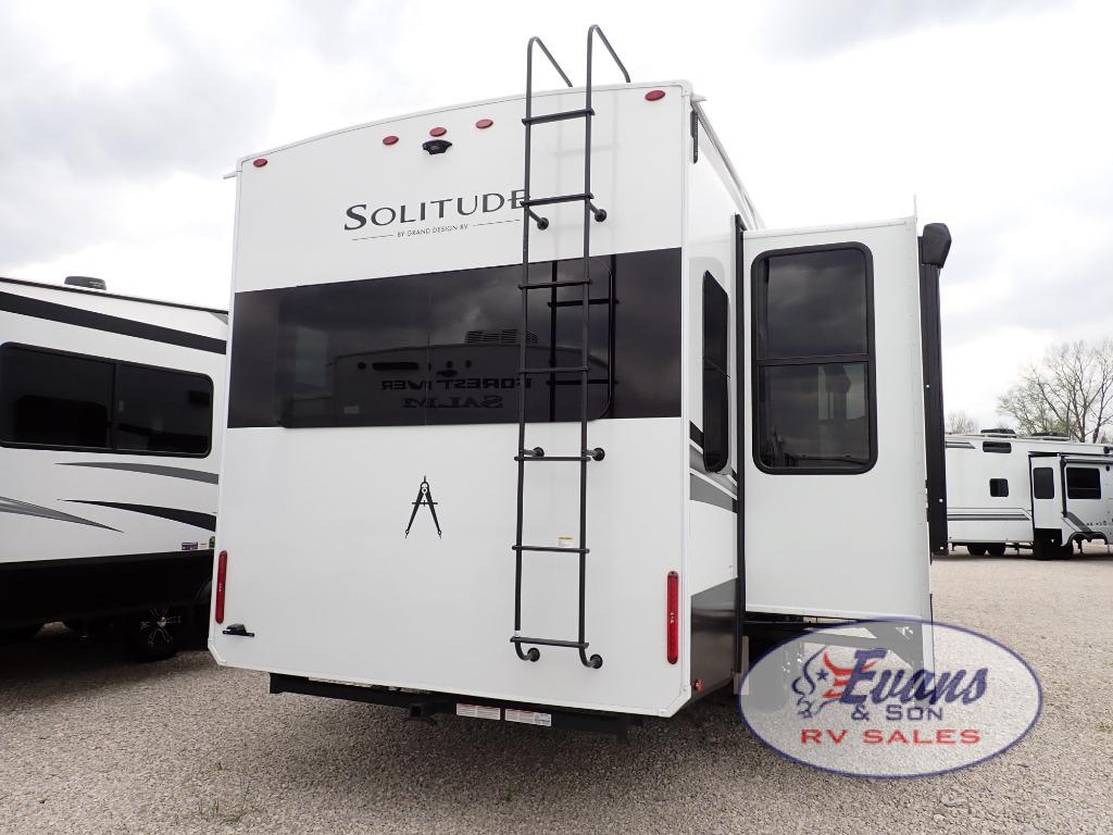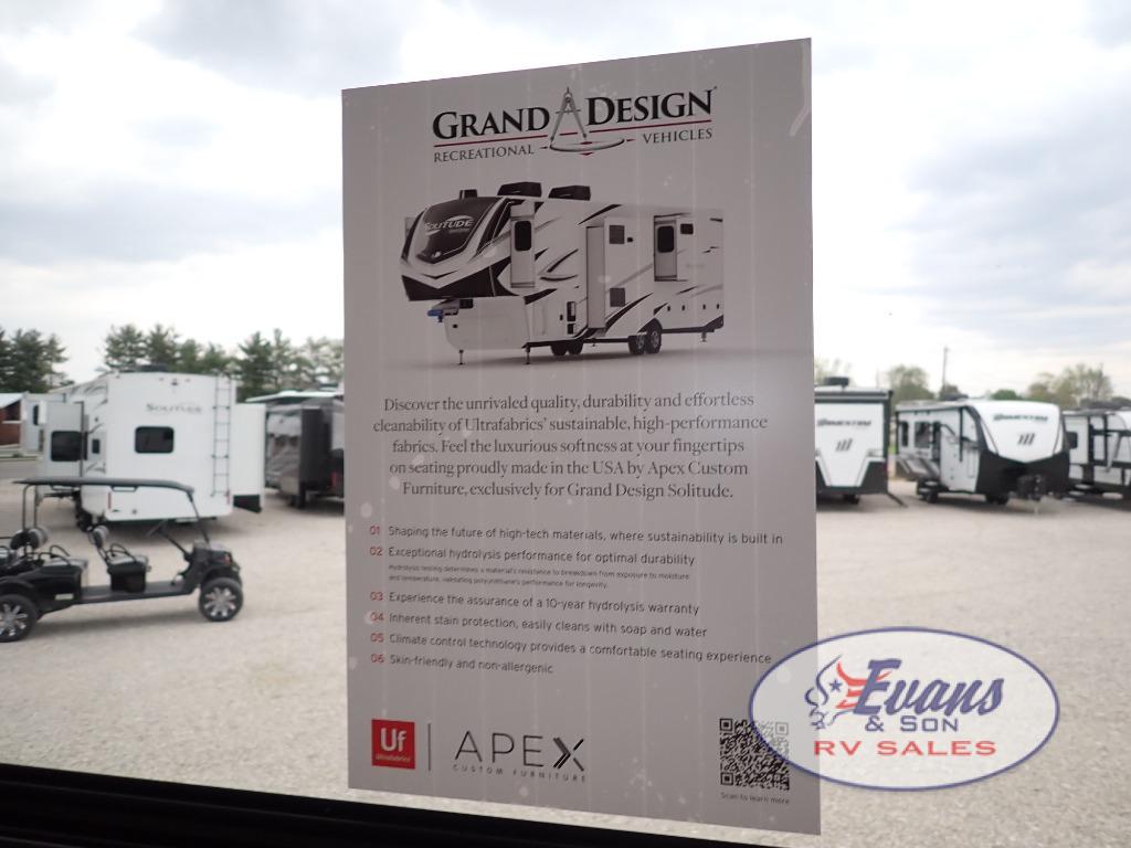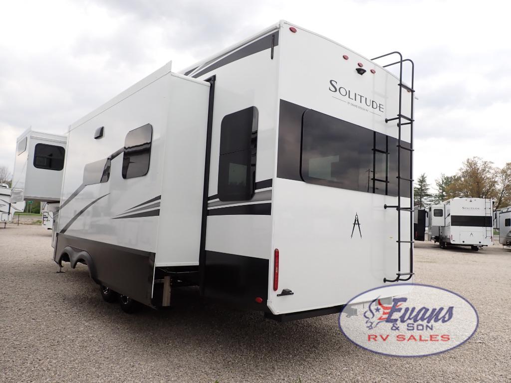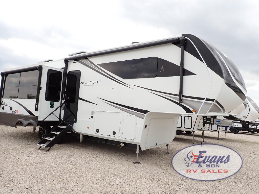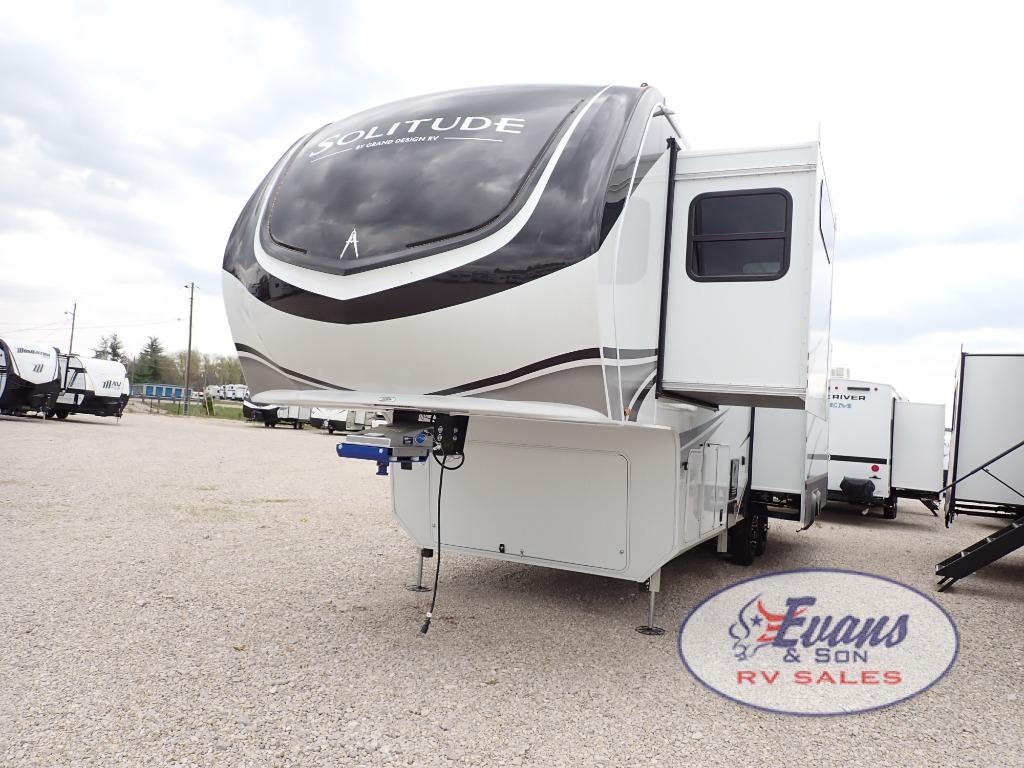 Each Solitude fifth wheel by Grand Design features a 101" wide-body construction, heavy duty 8,000 lb. axles, frameless tinted windows, and high-gloss gel coat sidewalls. You can camp year around thanks to the Weather-Tek Package that includes a 35K BTU high-capacity furnace, an all-in-one enclosed and heated utility center, and a fully enclosed underbelly with heated tanks and storage. Inside, you'll love the premium roller shades, hardwood cabinet doors, solid surface countertops, plus residential finishes throughout to make you truly feel at home. Each model also includes a MORryde CRE3000 suspension system, self adjusting brakes, and a MORryde pin box that will provide smooth towing from home to campground. Affordable luxury is possible with the Solitude fifth wheels; choose yours today!