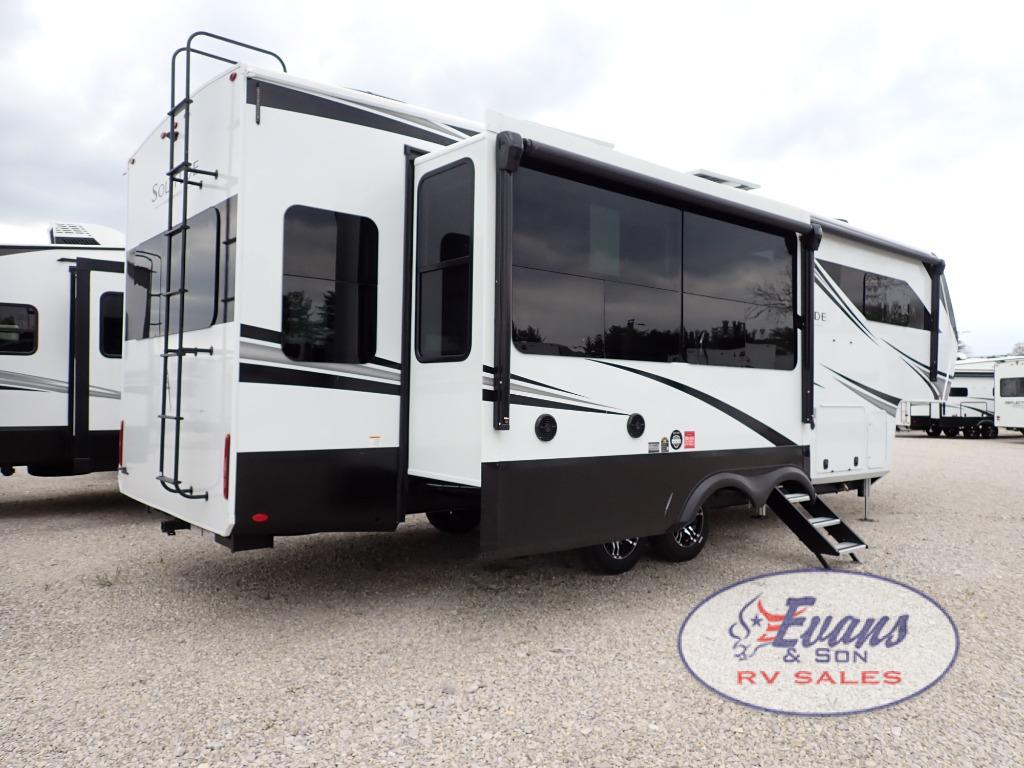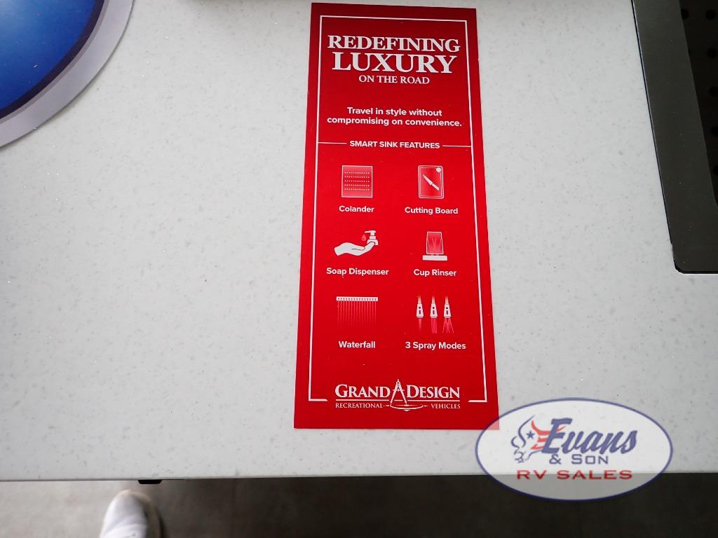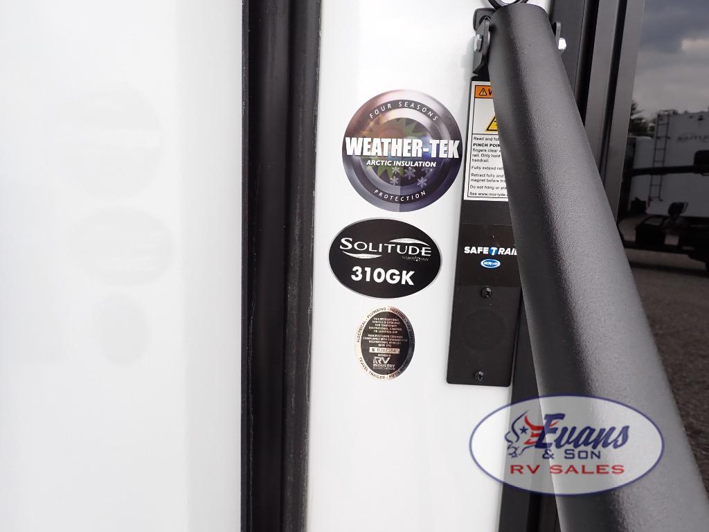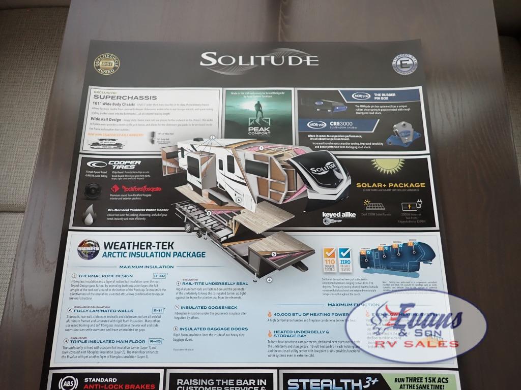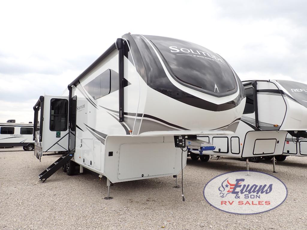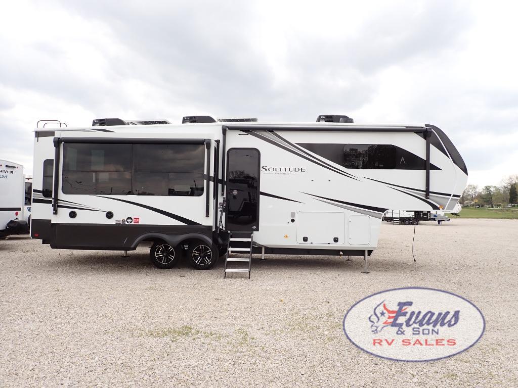 Each Solitude fifth wheel by Grand Design features a 101" wide-body construction, heavy duty 8,000 lb. axles, frameless tinted windows, and high-gloss gel coat sidewalls. You can camp year around thanks to the Weather-Tek Package that includes a 35K BTU high-capacity furnace, an all-in-one enclosed and heated utility center, and a fully enclosed underbelly with heated tanks and storage. Inside, you'll love the premium roller shades, hardwood cabinet doors, solid surface countertops, plus residential finishes throughout to make you truly feel at home. Each model also includes a MORryde CRE3000 suspension system, self adjusting brakes, and a MORryde pin box that will provide smooth towing from home to campground. Affordable luxury is possible with the Solitude fifth wheels; choose yours today!