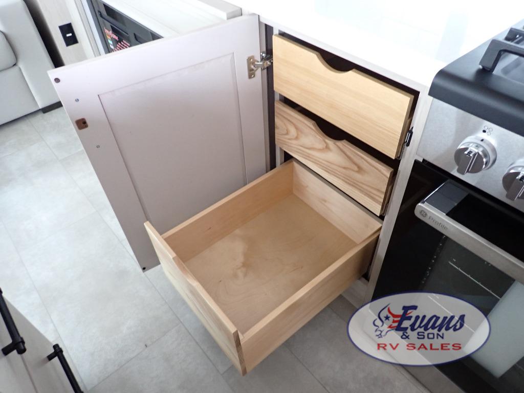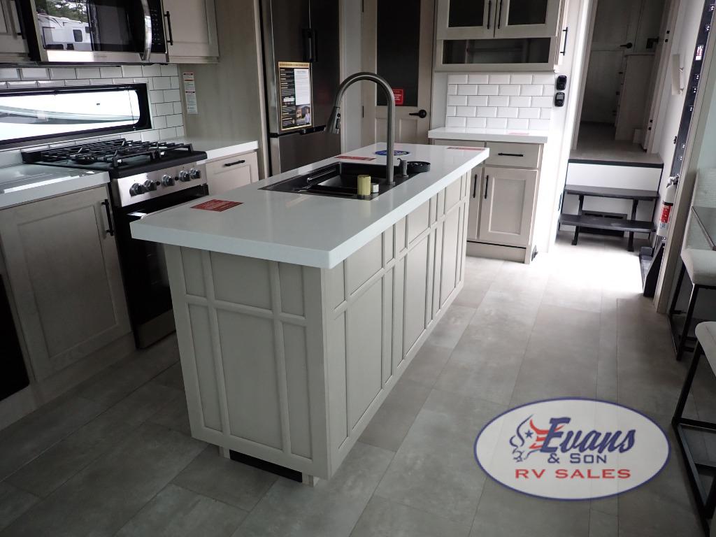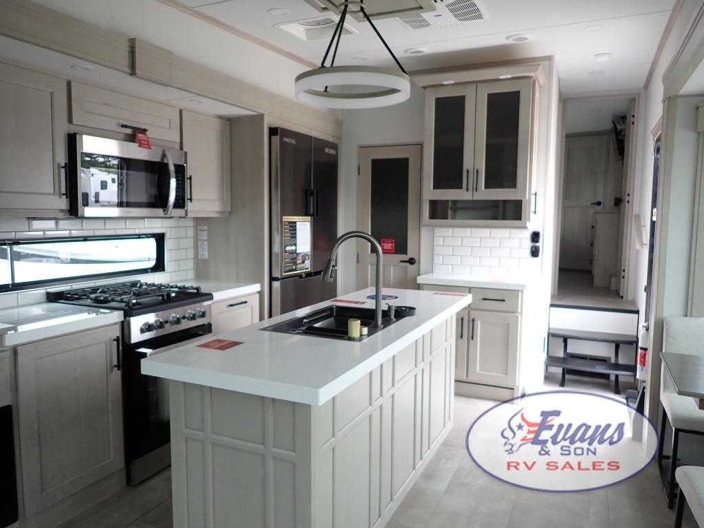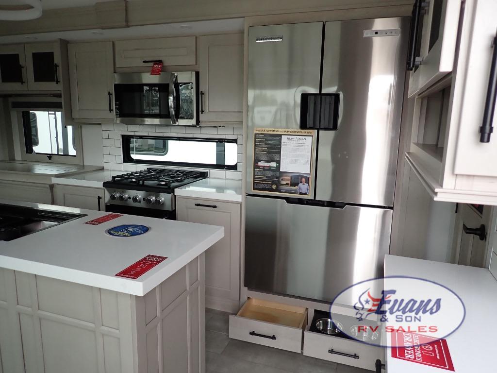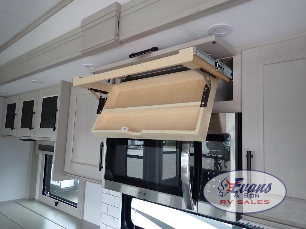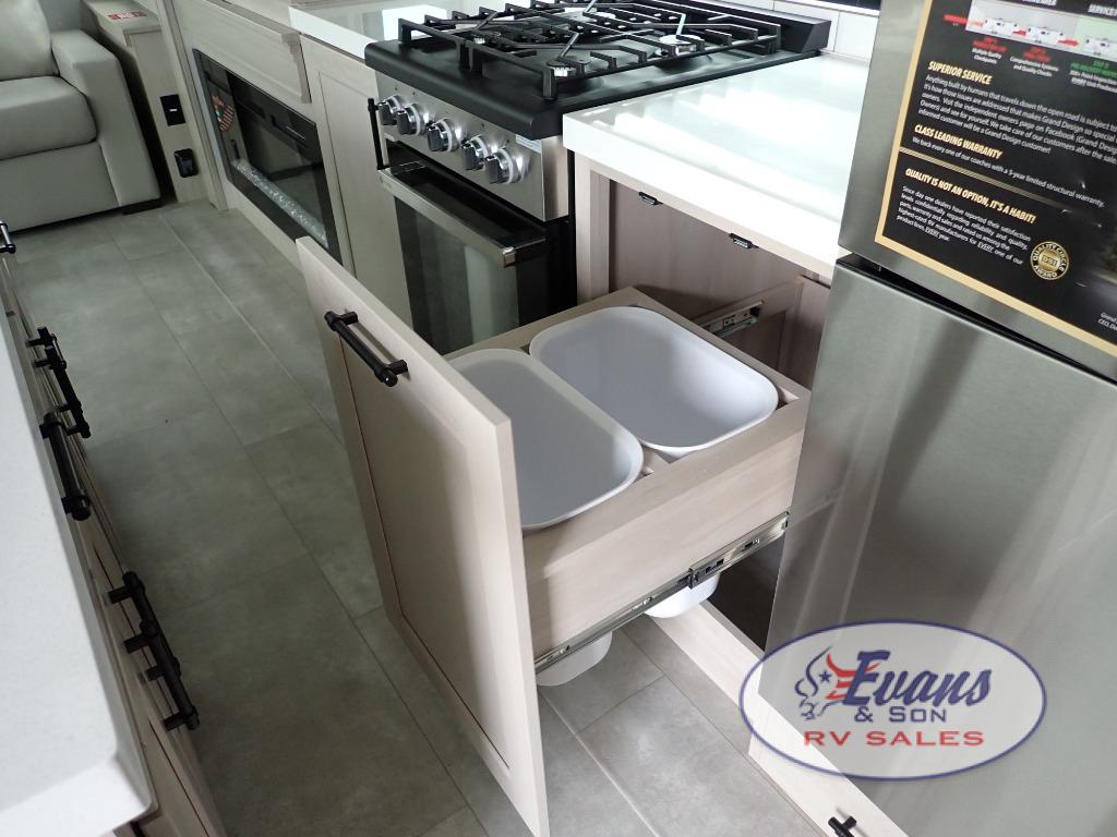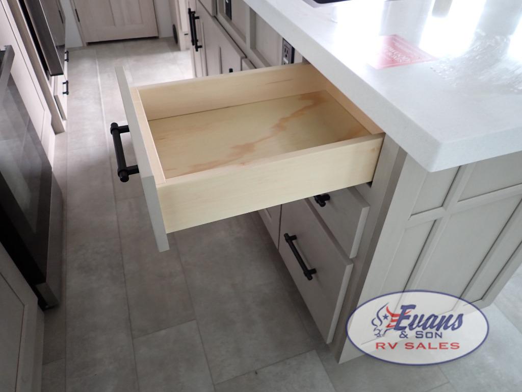 Traveling for long periods at a time is made easy with this gourmet kitchen that can feed your entire group a holiday meal! The professional-grade stainless steel cooktop with a built-in oven, microwave, 12V 20 cu. ft. refrigerator, and a kitchen island offers everything you will need to enjoy cooking for your family and guests. There is abundant storage throughout multiple overhead cabinets, a kitchen pantry and hutch, a bath linen cabinet for your towels, and in the front master bedroom which features a large closet. In the bedroom there is also a queen bed slide for added space to sleep comfortable at night, or you may choose an optional king bed if you enjoy more space. You will also find a closet with washer/dryer prep, large wardrobe, a clothes hamper plus a slide top dresser. Two nice awnings will provide outdoor living space keeping you protected from the sun and rain, and you can add an optional pull-out kitchen to enjoy convenient cooking outdoors as well.