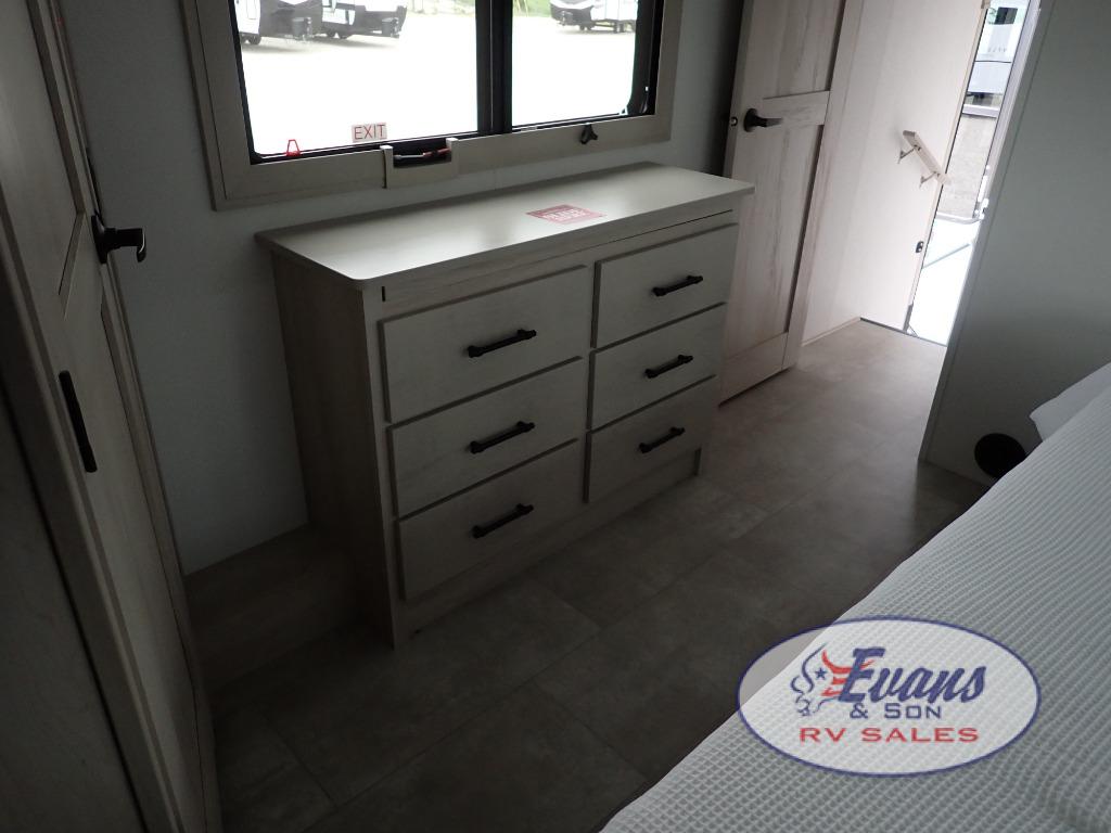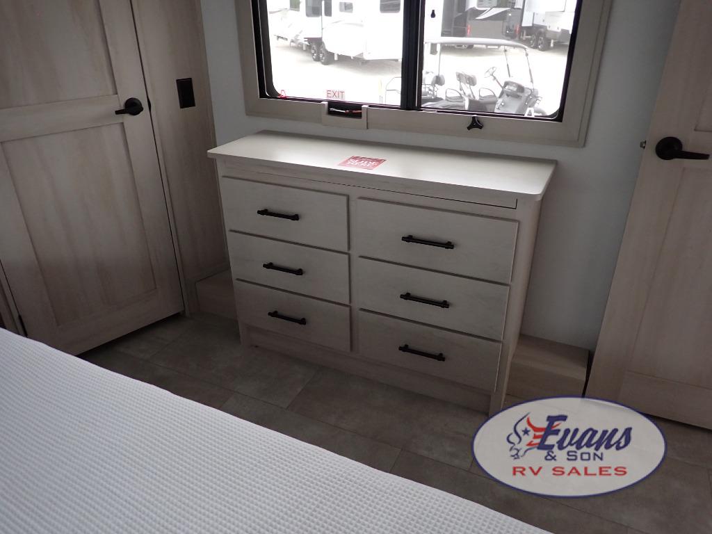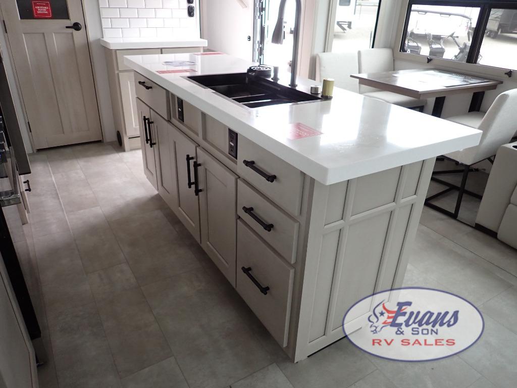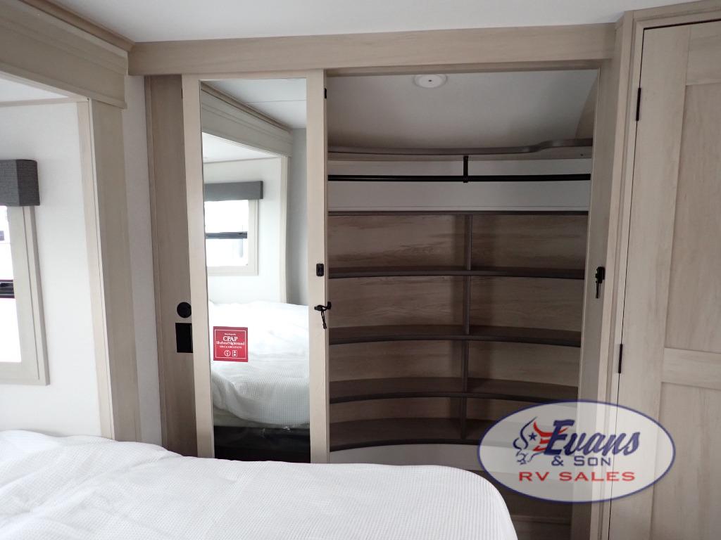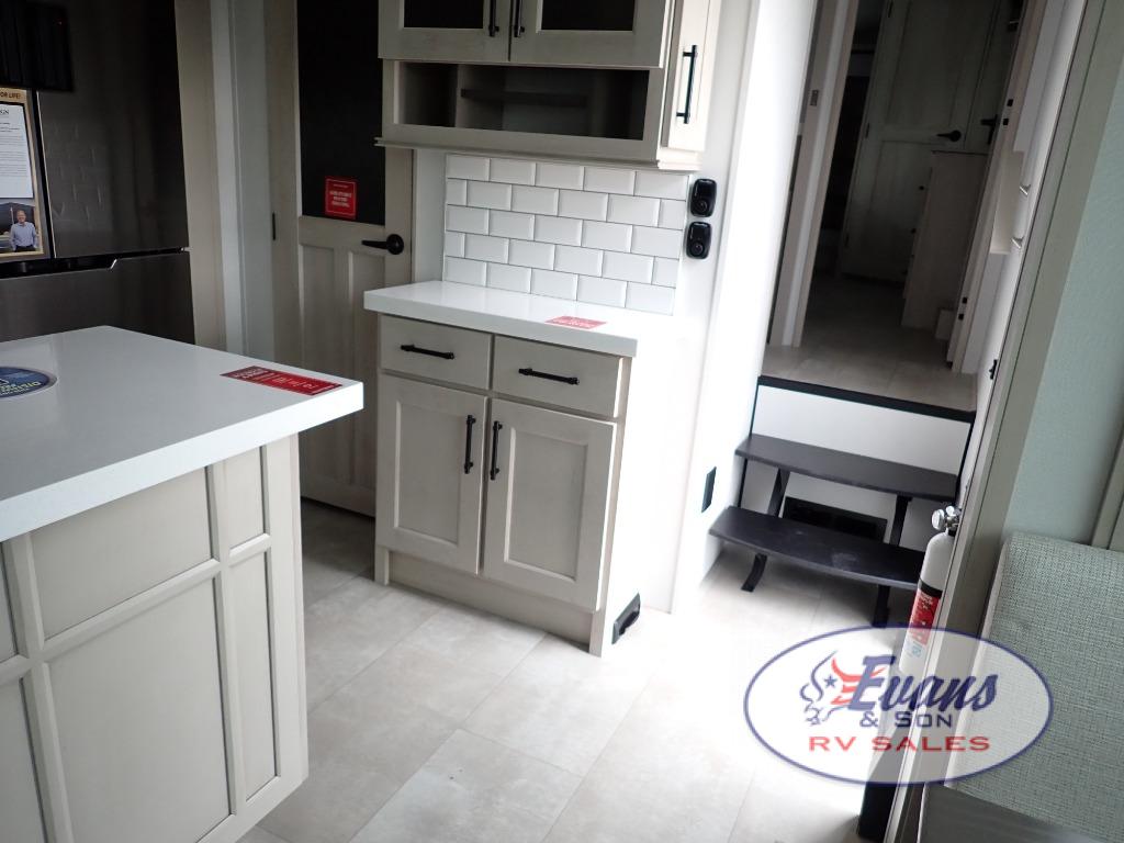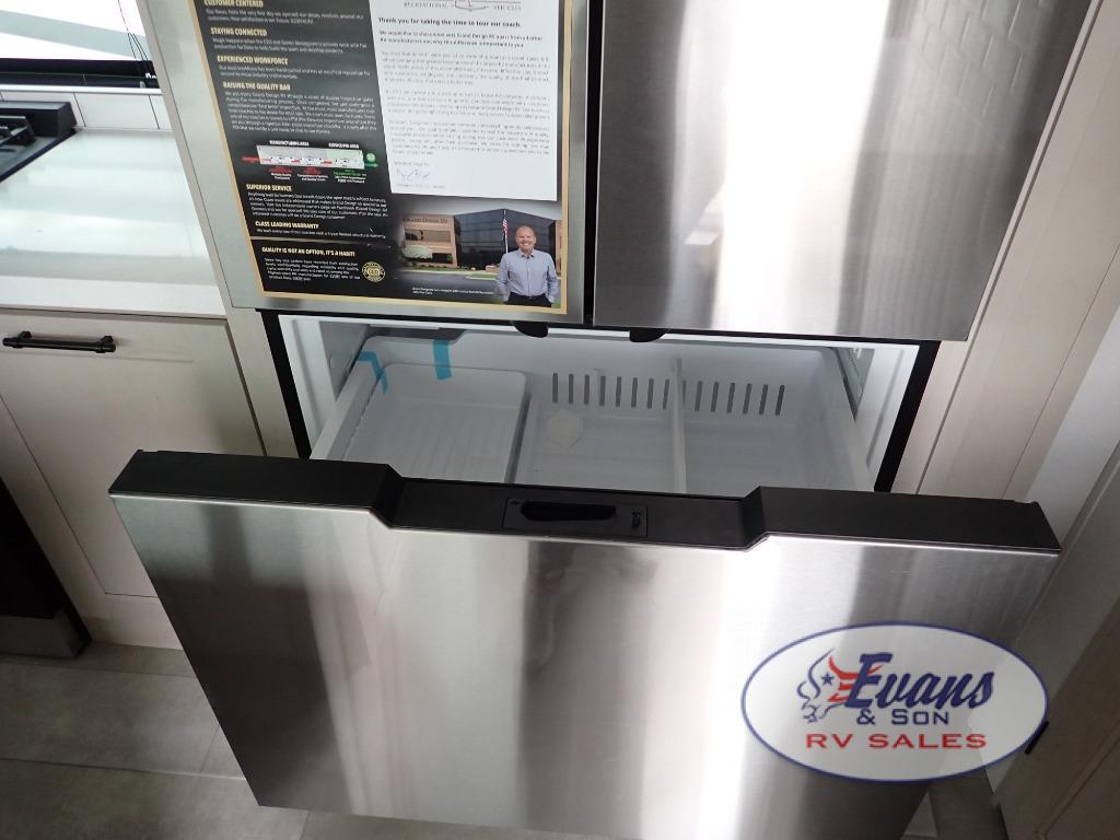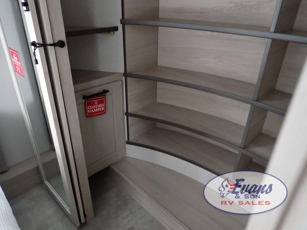 Traveling for long periods at a time is made easy with this gourmet kitchen that can feed your entire group a holiday meal! The professional-grade stainless steel cooktop with a built-in oven, microwave, 12V 20 cu. ft. refrigerator, and a kitchen island offers everything you will need to enjoy cooking for your family and guests. There is abundant storage throughout multiple overhead cabinets, a kitchen pantry and hutch, a bath linen cabinet for your towels, and in the front master bedroom which features a large closet. In the bedroom there is also a queen bed slide for added space to sleep comfortable at night, or you may choose an optional king bed if you enjoy more space. You will also find a closet with washer/dryer prep, large wardrobe, a clothes hamper plus a slide top dresser. Two nice awnings will provide outdoor living space keeping you protected from the sun and rain, and you can add an optional pull-out kitchen to enjoy convenient cooking outdoors as well.