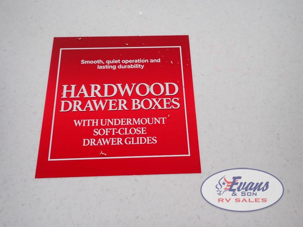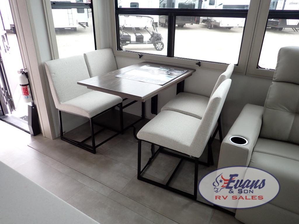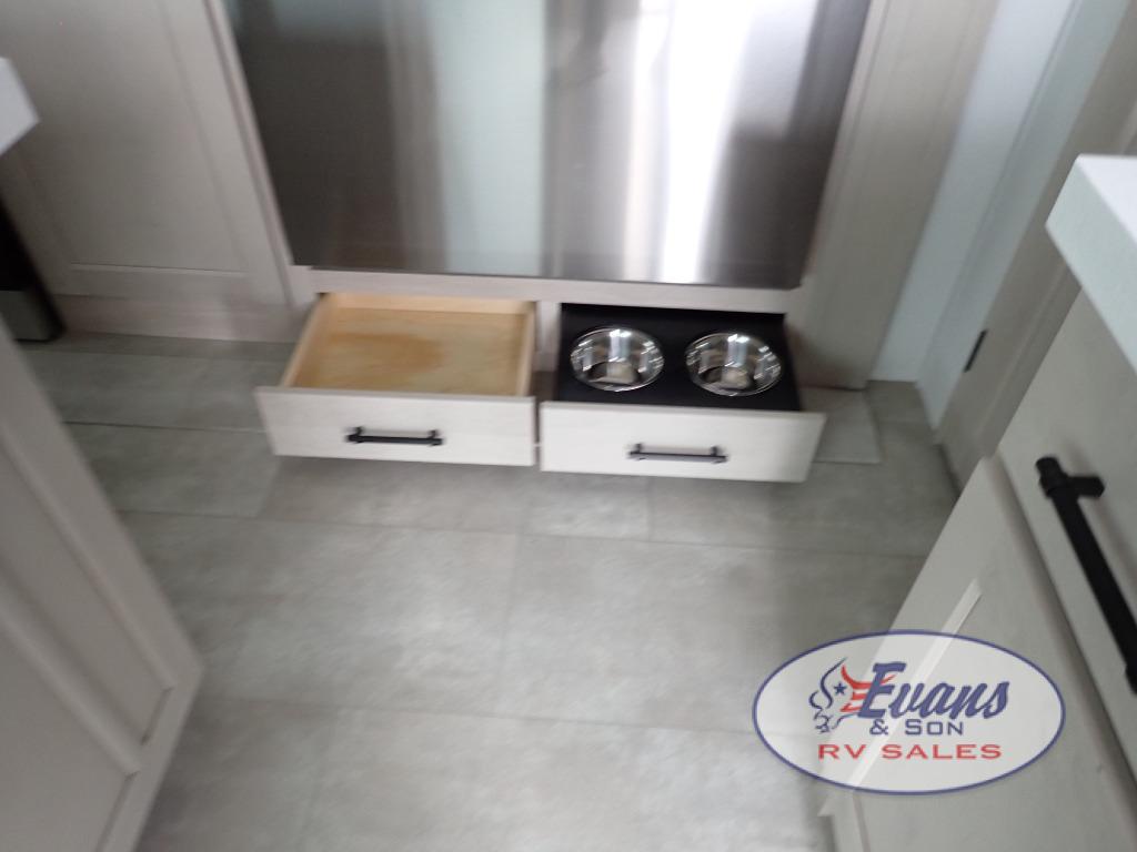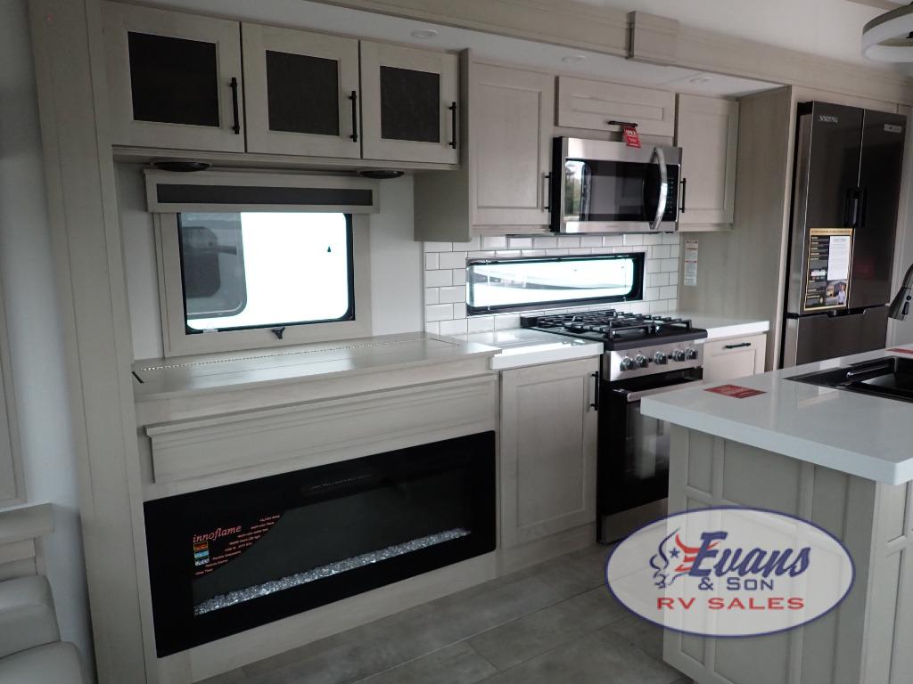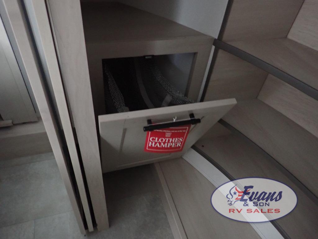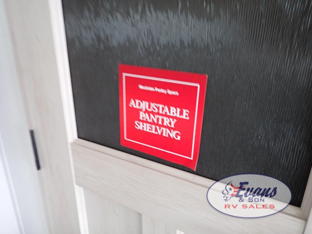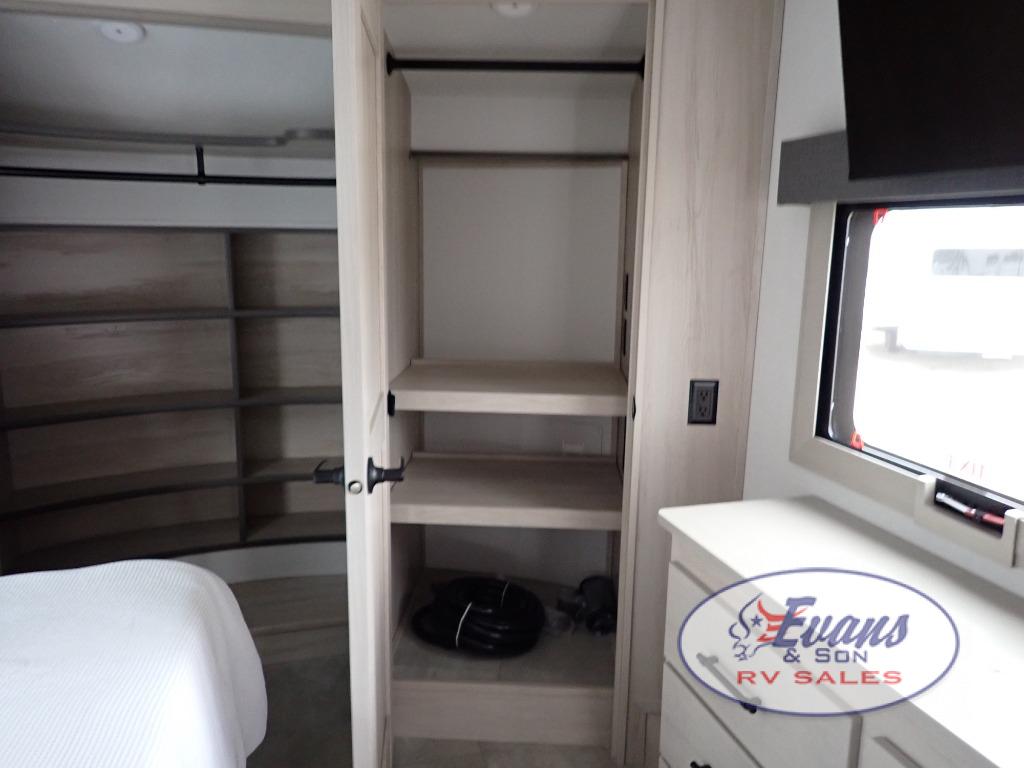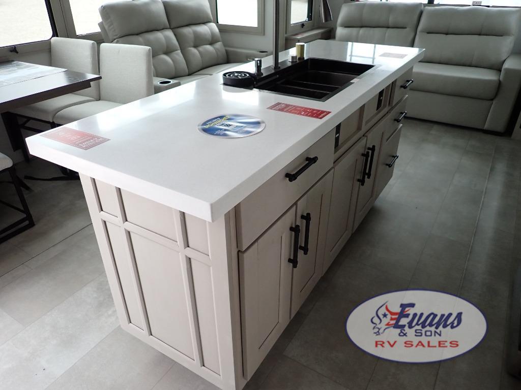Traveling for long periods at a time is made easy with this gourmet kitchen that can feed your entire group a holiday meal! The professional-grade stainless steel cooktop with a built-in oven, microwave, 12V 20 cu. ft. refrigerator, and a kitchen island offers everything you will need to enjoy cooking for your family and guests. There is abundant storage throughout multiple overhead cabinets, a kitchen pantry and hutch, a bath linen cabinet for your towels, and in the front master bedroom which features a large closet. In the bedroom there is also a queen bed slide for added space to sleep comfortable at night, or you may choose an optional king bed if you enjoy more space. You will also find a closet with washer/dryer prep, large wardrobe, a clothes hamper plus a slide top dresser. Two nice awnings will provide outdoor living space keeping you protected from the sun and rain, and you can add an optional pull-out kitchen to enjoy convenient cooking outdoors as well.