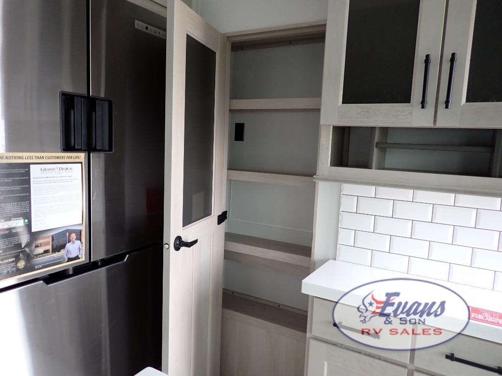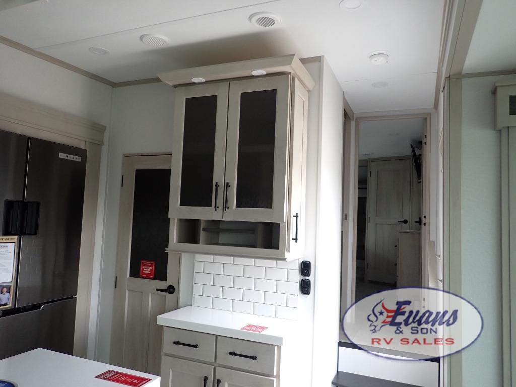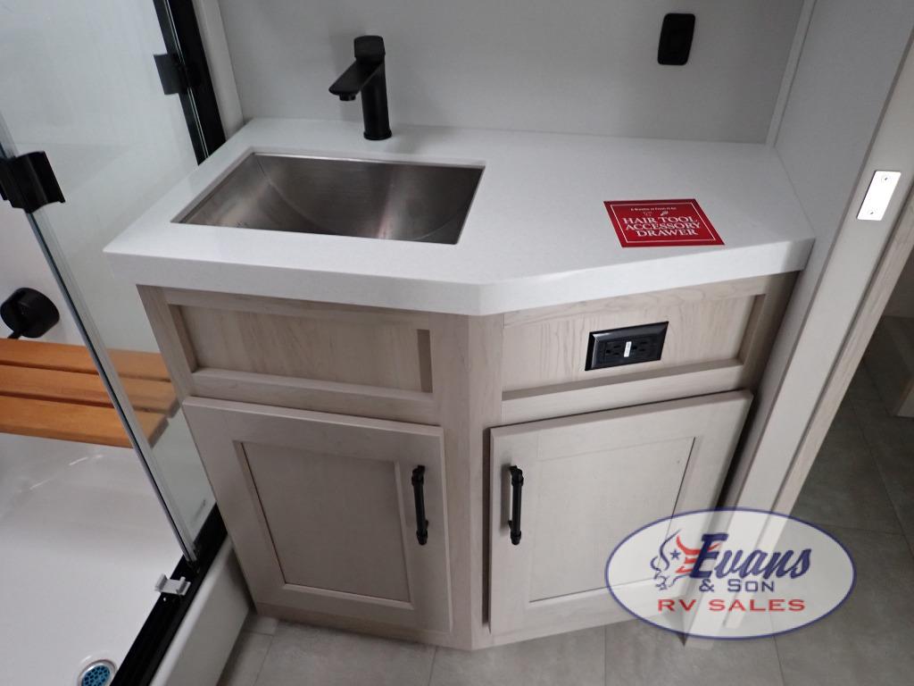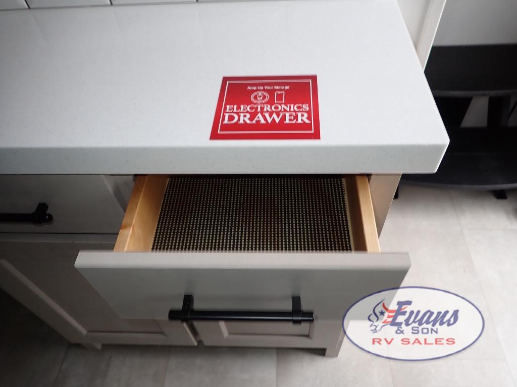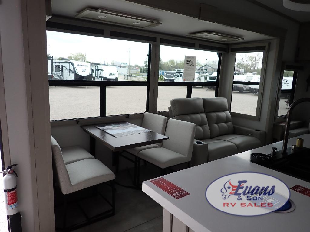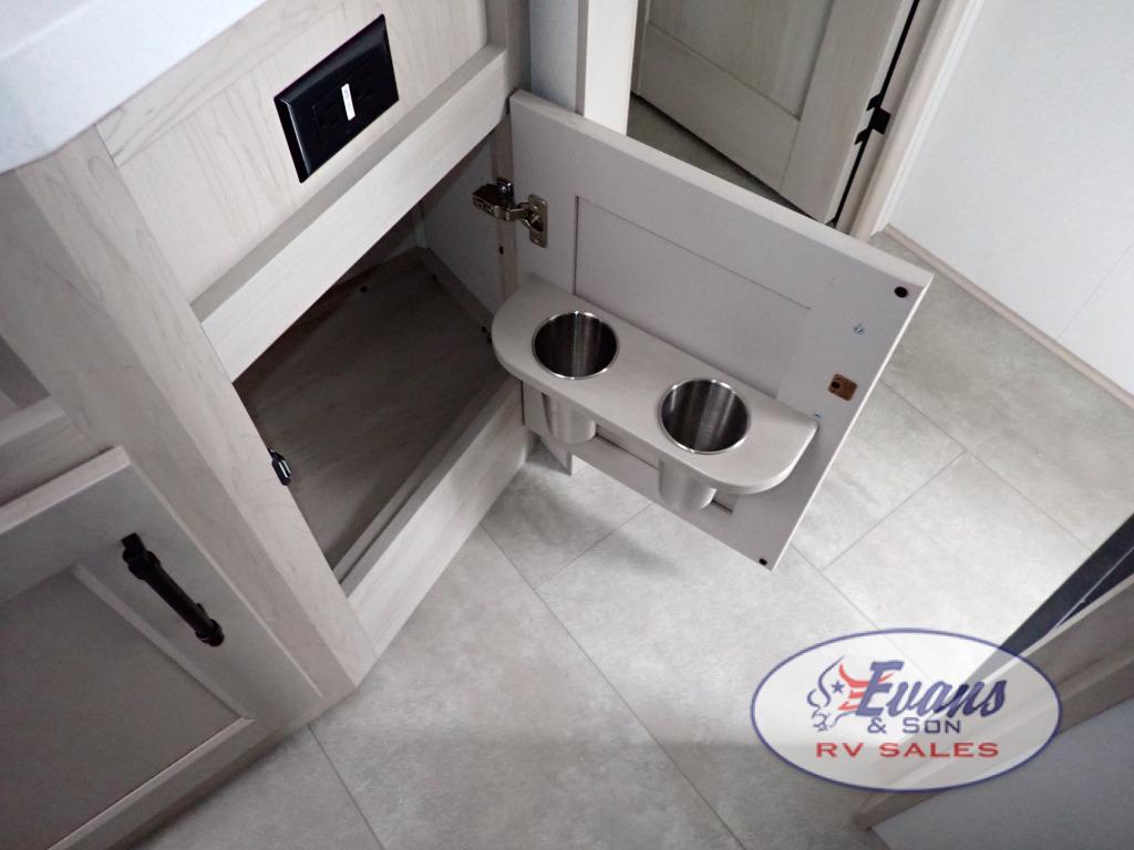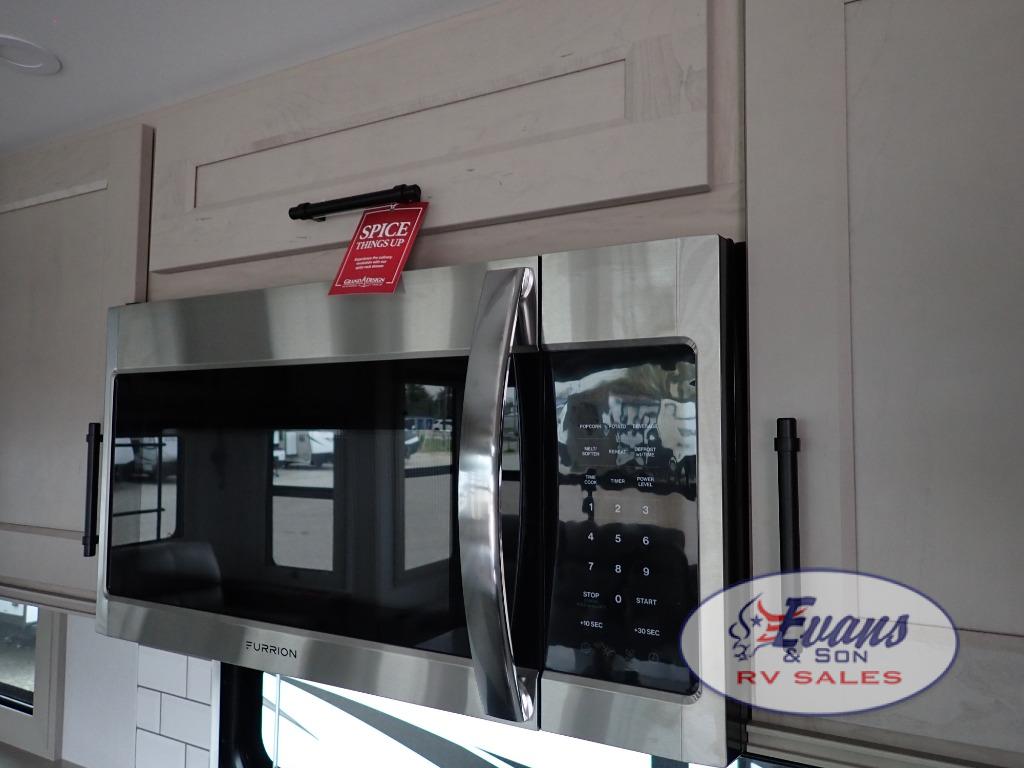 Traveling for long periods at a time is made easy with this gourmet kitchen that can feed your entire group a holiday meal! The professional-grade stainless steel cooktop with a built-in oven, microwave, 12V 20 cu. ft. refrigerator, and a kitchen island offers everything you will need to enjoy cooking for your family and guests. There is abundant storage throughout multiple overhead cabinets, a kitchen pantry and hutch, a bath linen cabinet for your towels, and in the front master bedroom which features a large closet. In the bedroom there is also a queen bed slide for added space to sleep comfortable at night, or you may choose an optional king bed if you enjoy more space. You will also find a closet with washer/dryer prep, large wardrobe, a clothes hamper plus a slide top dresser. Two nice awnings will provide outdoor living space keeping you protected from the sun and rain, and you can add an optional pull-out kitchen to enjoy convenient cooking outdoors as well.