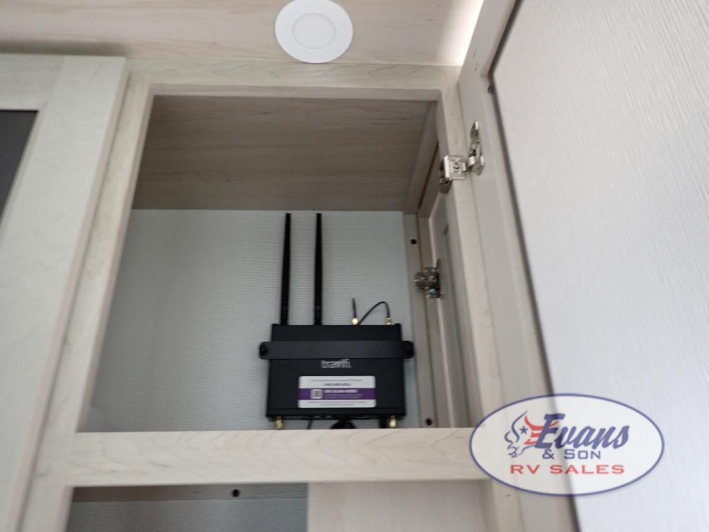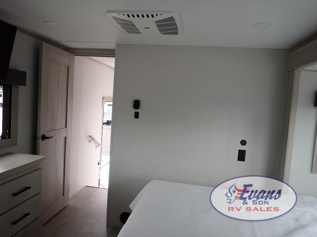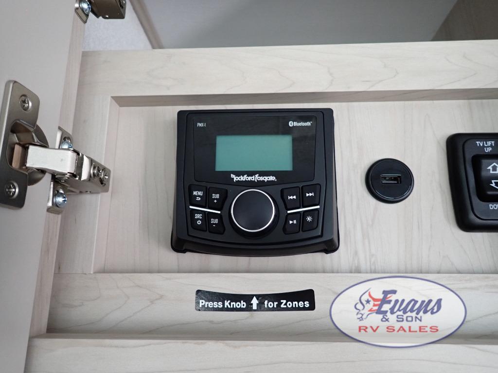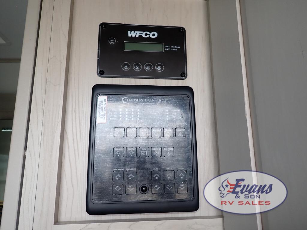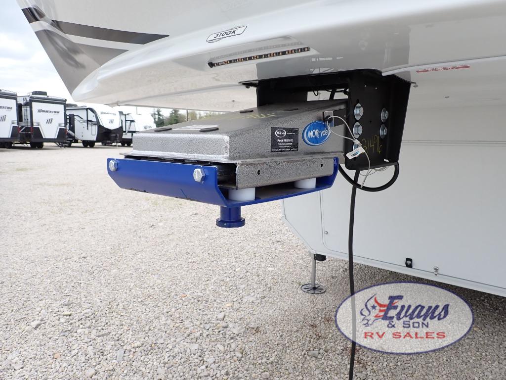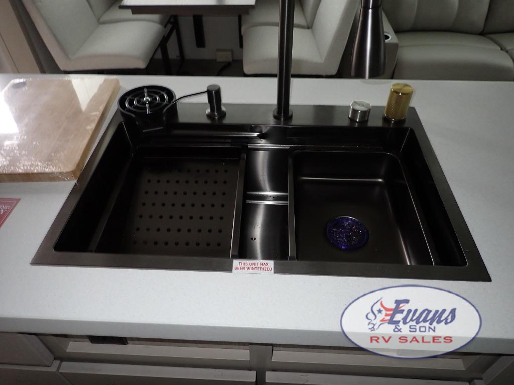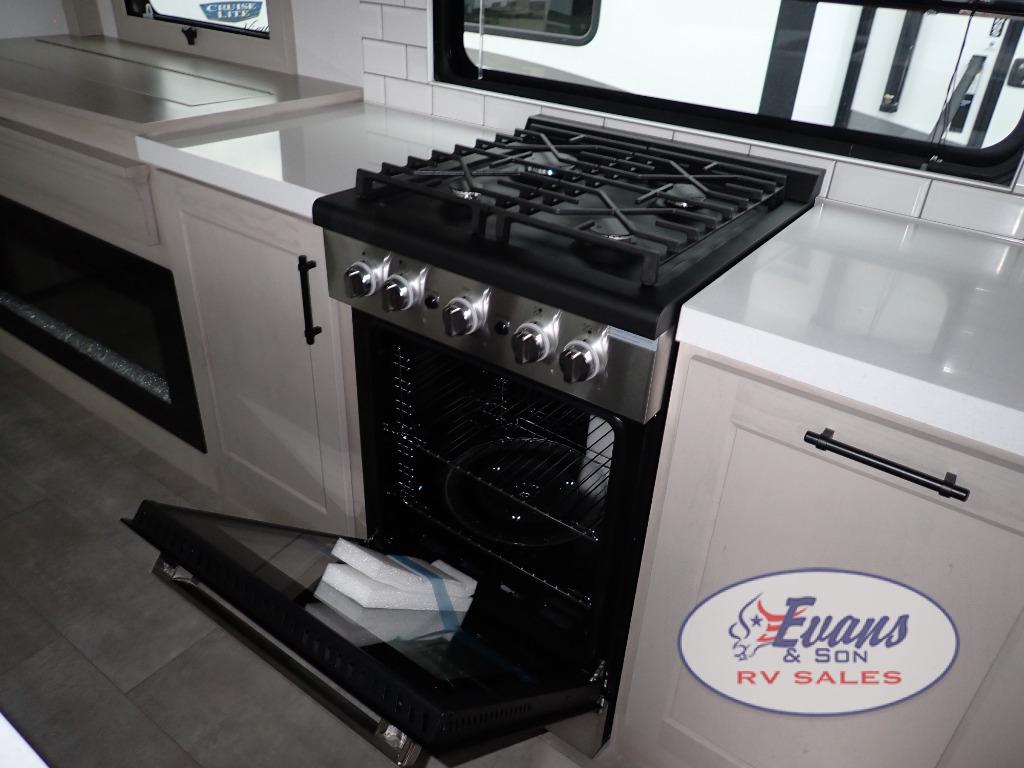 Traveling for long periods at a time is made easy with this gourmet kitchen that can feed your entire group a holiday meal! The professional-grade stainless steel cooktop with a built-in oven, microwave, 12V 20 cu. ft. refrigerator, and a kitchen island offers everything you will need to enjoy cooking for your family and guests. There is abundant storage throughout multiple overhead cabinets, a kitchen pantry and hutch, a bath linen cabinet for your towels, and in the front master bedroom which features a large closet. In the bedroom there is also a queen bed slide for added space to sleep comfortable at night, or you may choose an optional king bed if you enjoy more space. You will also find a closet with washer/dryer prep, large wardrobe, a clothes hamper plus a slide top dresser. Two nice awnings will provide outdoor living space keeping you protected from the sun and rain, and you can add an optional pull-out kitchen to enjoy convenient cooking outdoors as well.
