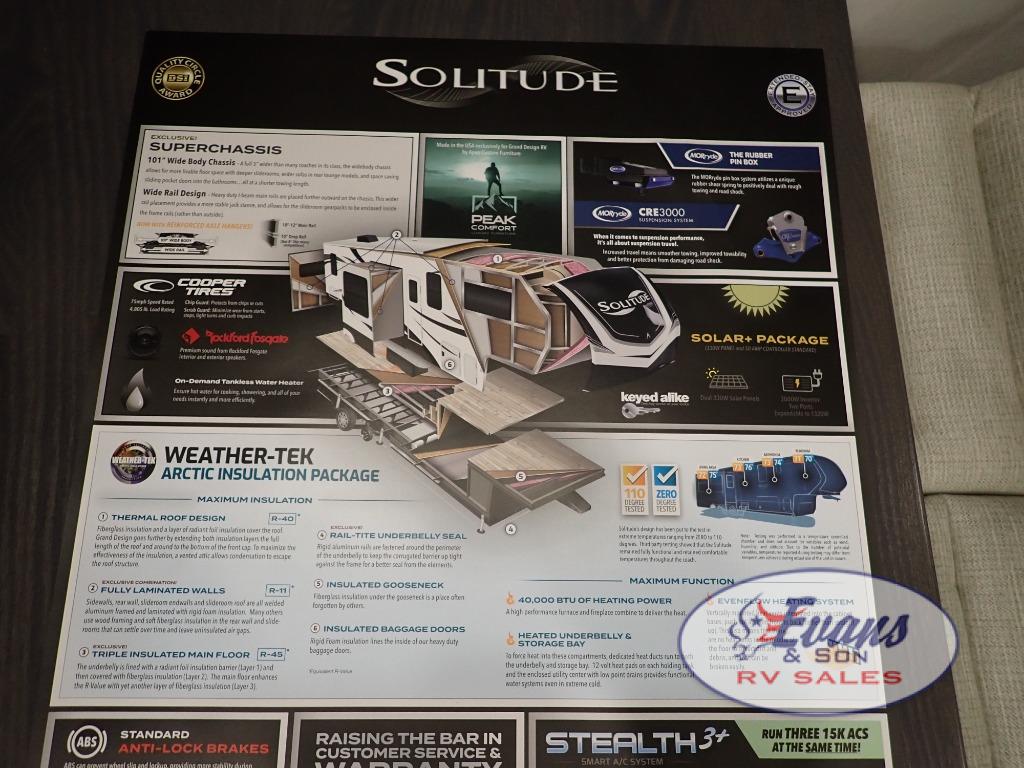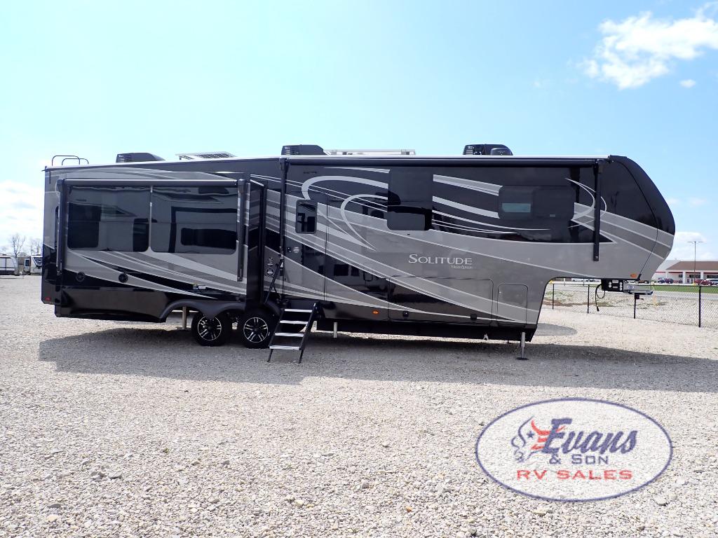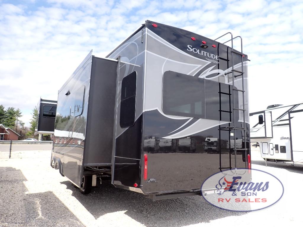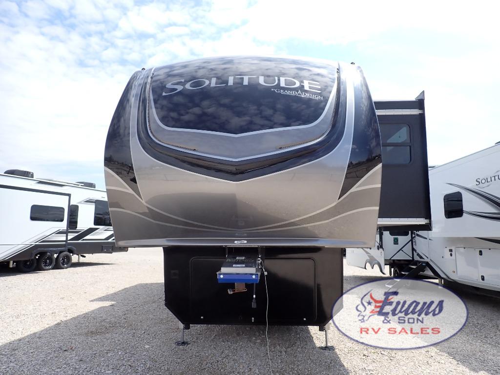 Each Solitude fifth wheel by Grand Design features a 101" wide-body construction, heavy duty 8,000 lb. axles, frameless tinted windows, and high-gloss gel coat sidewalls. You can camp year around thanks to the Weather-Tek Package that includes a 35K BTU high-capacity furnace, an all-in-one enclosed and heated utility center, and a fully enclosed underbelly with heated tanks and storage. Inside, you'll love the premium roller shades, hardwood cabinet doors, solid surface countertops, plus residential finishes throughout to make you truly feel at home. Each model also includes a MORryde CRE3000 suspension system, self adjusting brakes, and a MORryde pin box that will provide smooth towing from home to campground. Affordable luxury is possible with the Solitude fifth wheels; choose yours today!