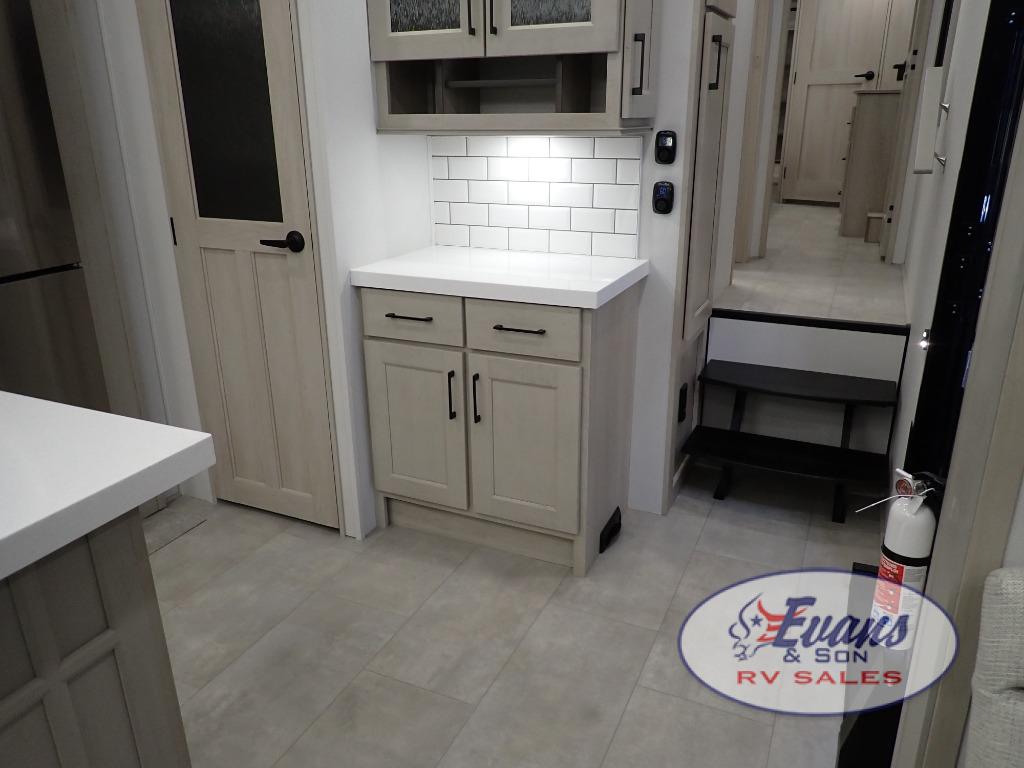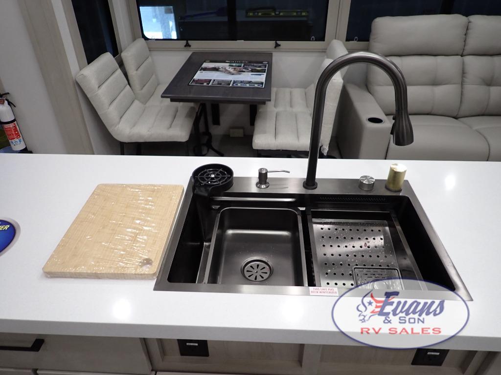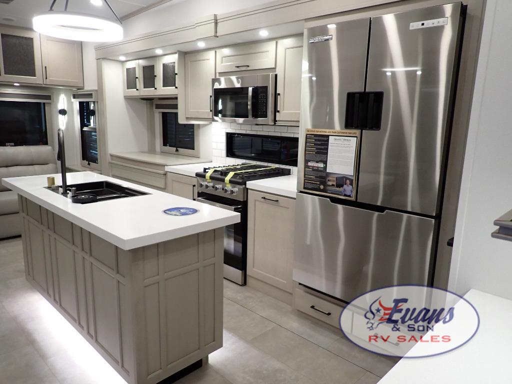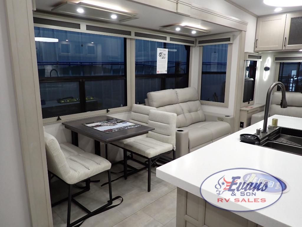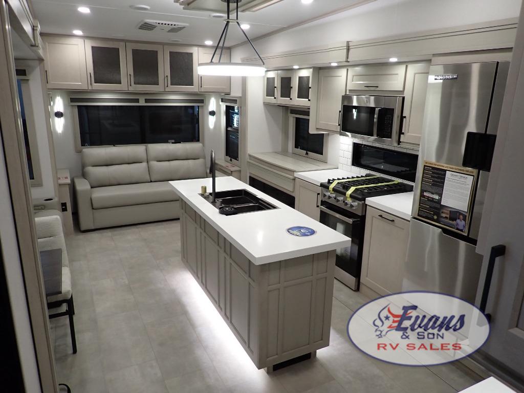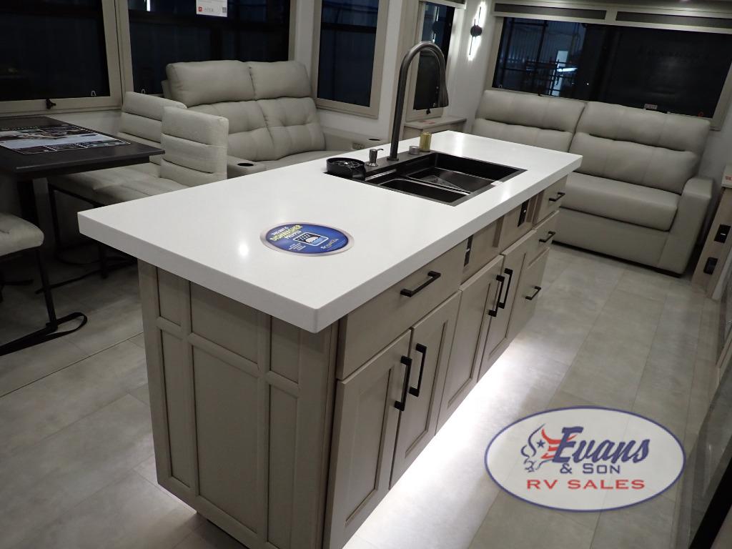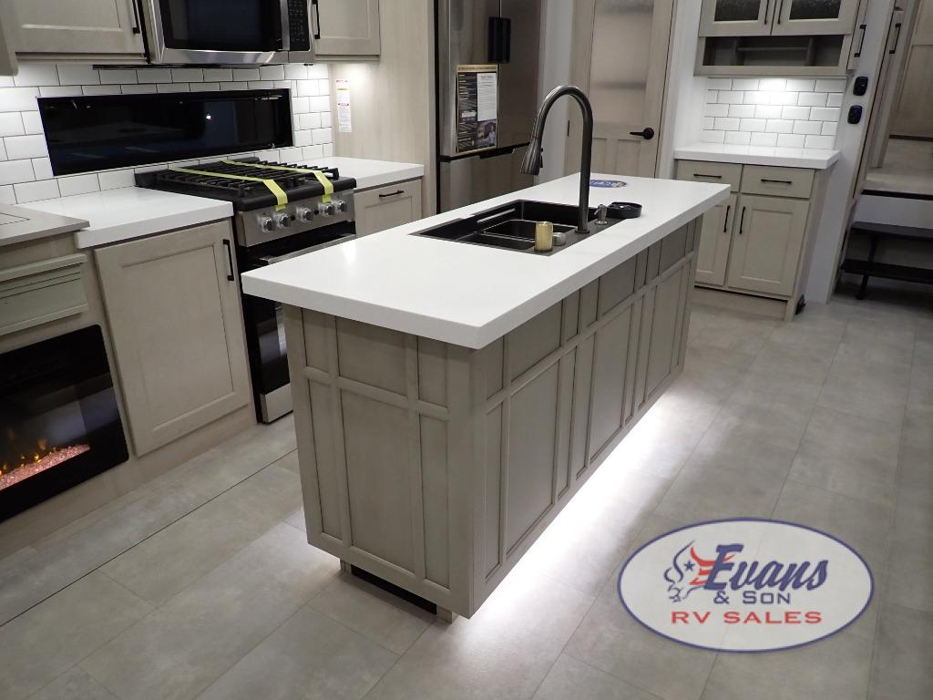 Are you looking to upgrade from a travel trailer to a fifth wheel? If so, this model will be perfect for you! Once you arrive at the campground, you can unload your gear from the pass-through storage, put out the two power awnings, then relax with a cold drink. Inside, you can kick your feet up on the theater seating, play a game at the free-standing dinette, or relax on the tri-fold sofa. The chef of your group will have a kitchen island with a Smart sink, dishwasher prep if you want the option to make cleaning up easier, plus a spacious 20 cu. ft. 12V refrigerator. There is also a built-in oven, plus a pantry and a hutch for storage galore! Having two bath sinks in the full bath is sure to be a big convenience when getting ready for bed, and the queen bed slide out in the front bedroom will provide a great night's rest. You will also find a front wardrobe, a slide top dresser, plus washer/dryer prep!