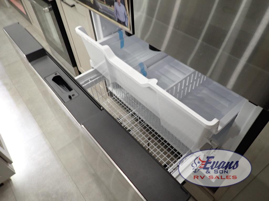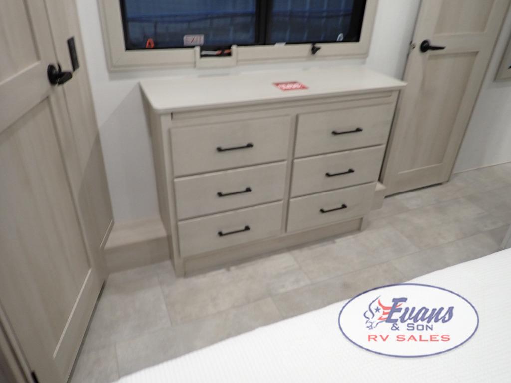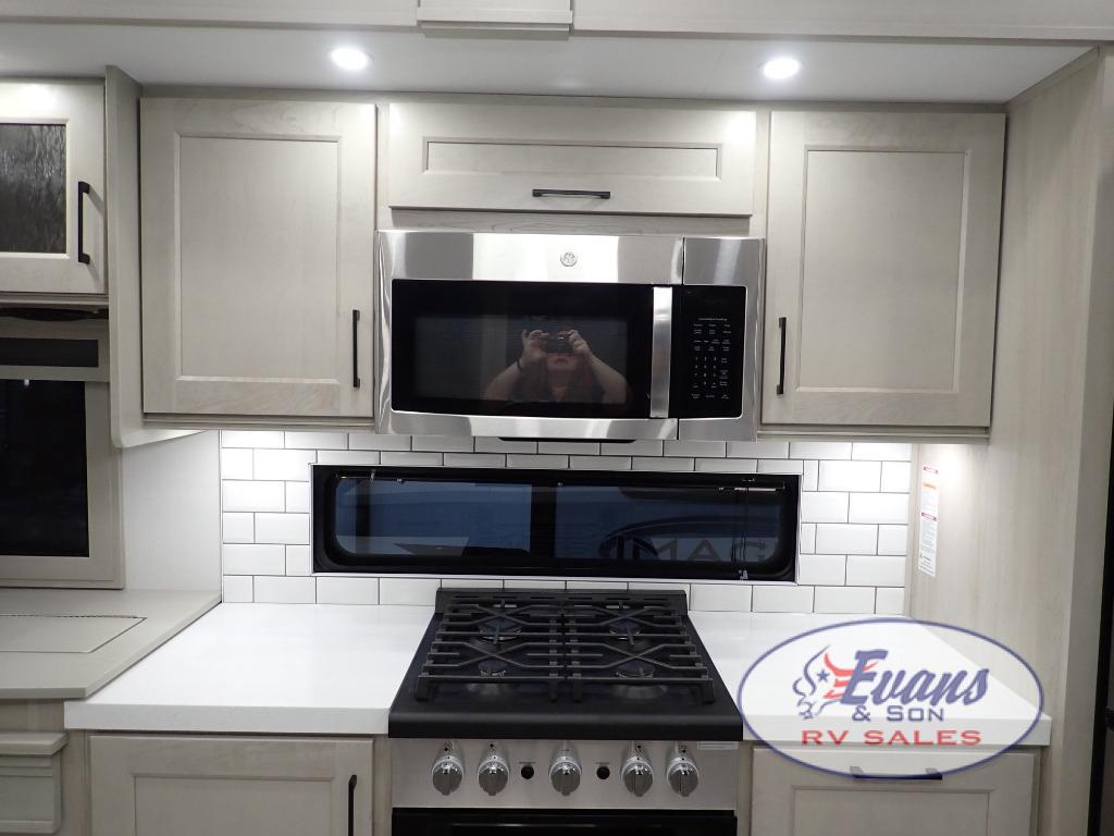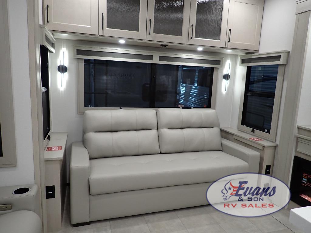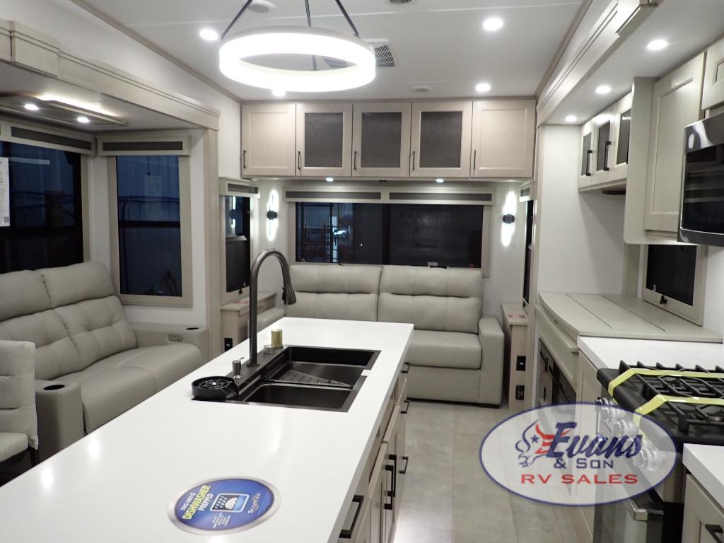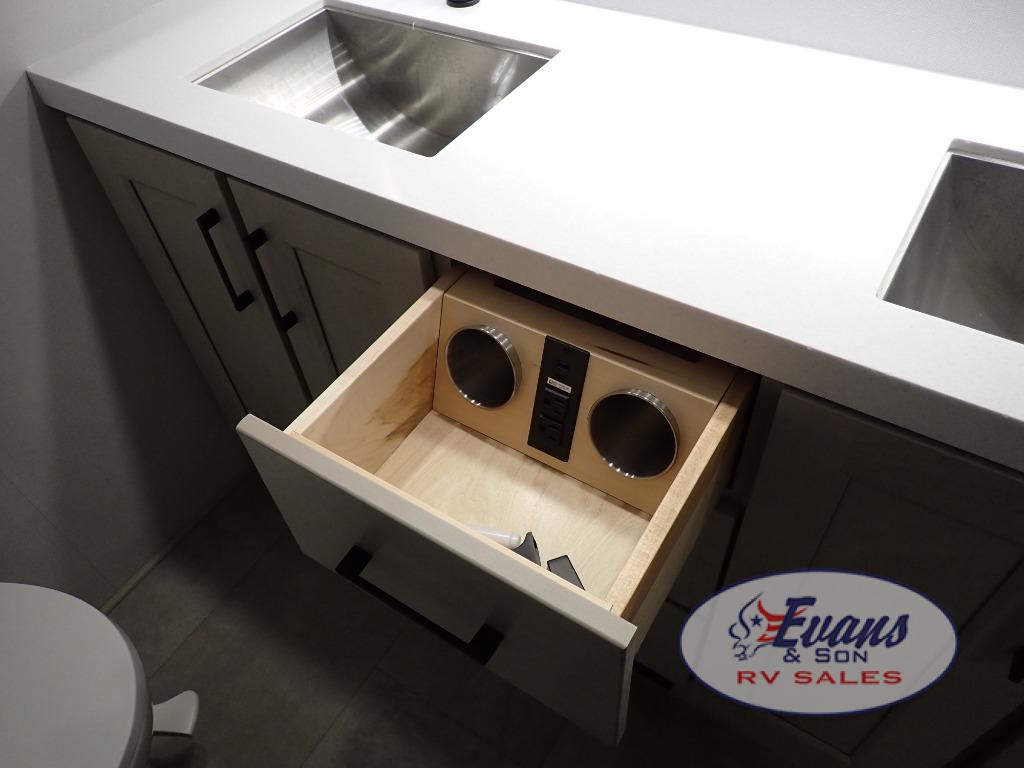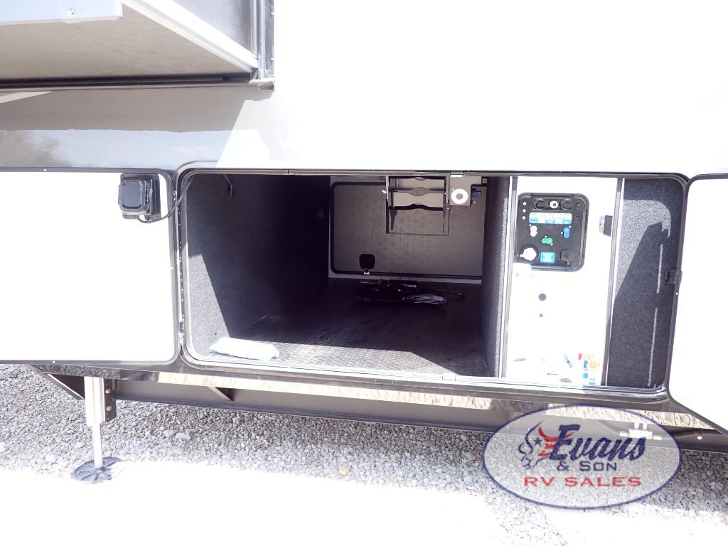 Are you looking to upgrade from a travel trailer to a fifth wheel? If so, this model will be perfect for you! Once you arrive at the campground, you can unload your gear from the pass-through storage, put out the two power awnings, then relax with a cold drink. Inside, you can kick your feet up on the theater seating, play a game at the free-standing dinette, or relax on the tri-fold sofa. The chef of your group will have a kitchen island with a Smart sink, dishwasher prep if you want the option to make cleaning up easier, plus a spacious 20 cu. ft. 12V refrigerator. There is also a built-in oven, plus a pantry and a hutch for storage galore! Having two bath sinks in the full bath is sure to be a big convenience when getting ready for bed, and the queen bed slide out in the front bedroom will provide a great night's rest. You will also find a front wardrobe, a slide top dresser, plus washer/dryer prep!