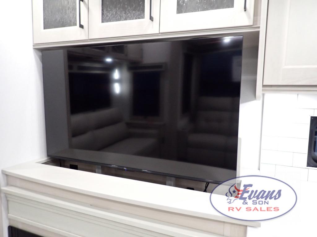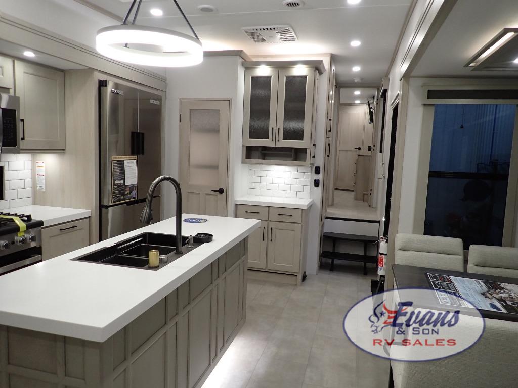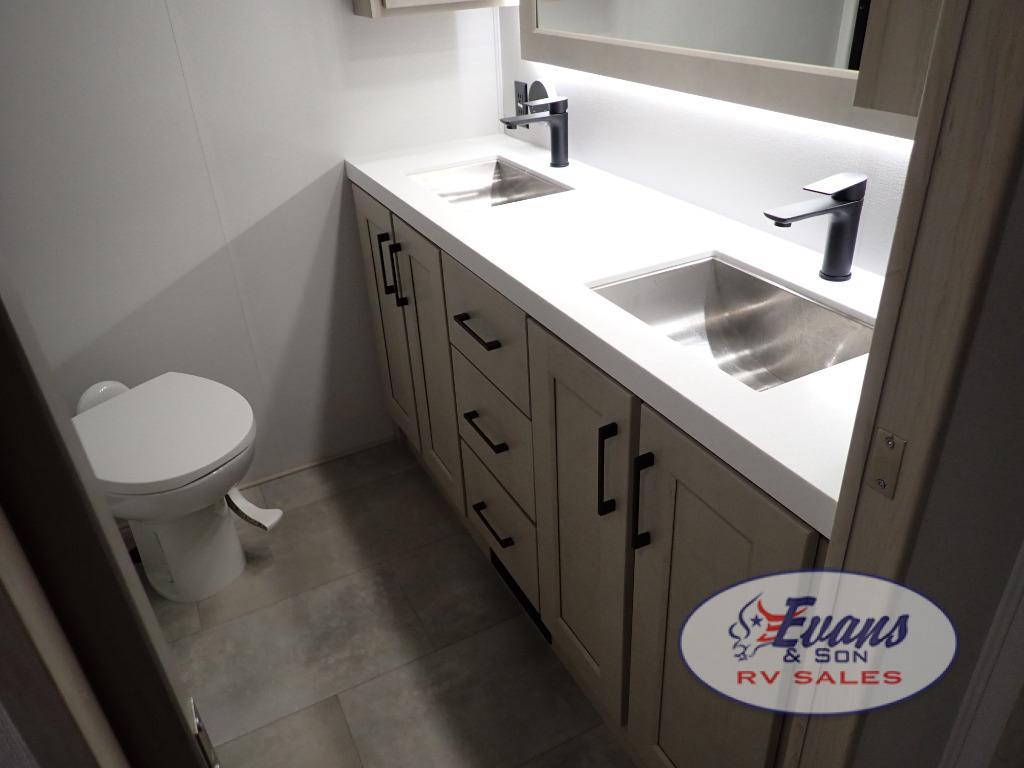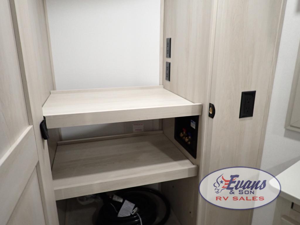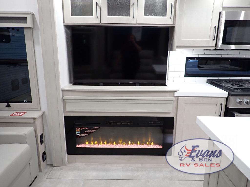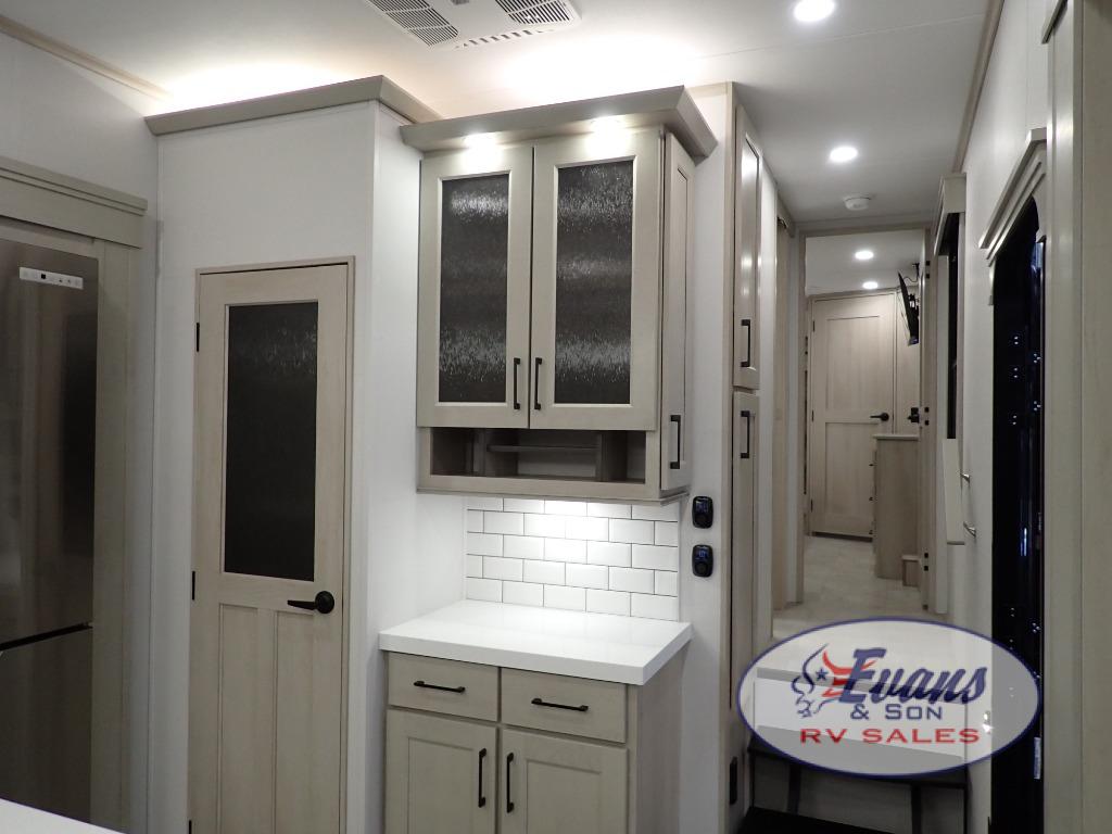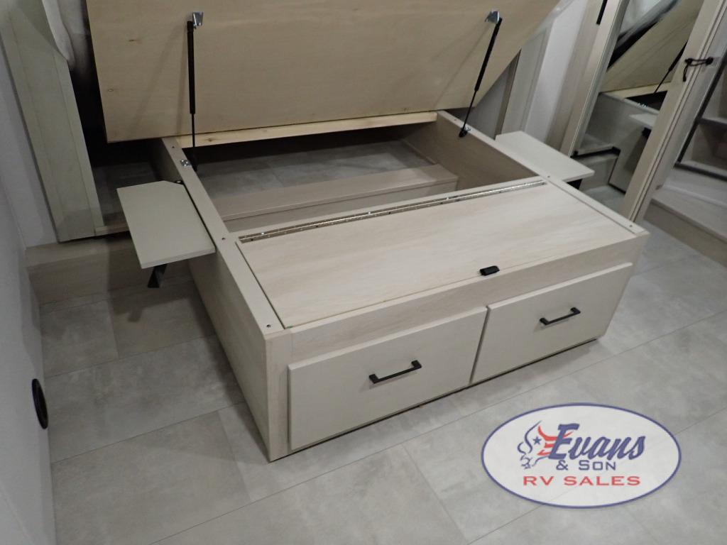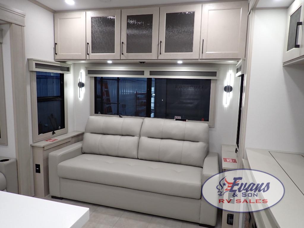 Are you looking to upgrade from a travel trailer to a fifth wheel? If so, this model will be perfect for you! Once you arrive at the campground, you can unload your gear from the pass-through storage, put out the two power awnings, then relax with a cold drink. Inside, you can kick your feet up on the theater seating, play a game at the free-standing dinette, or relax on the tri-fold sofa. The chef of your group will have a kitchen island with a Smart sink, dishwasher prep if you want the option to make cleaning up easier, plus a spacious 20 cu. ft. 12V refrigerator. There is also a built-in oven, plus a pantry and a hutch for storage galore! Having two bath sinks in the full bath is sure to be a big convenience when getting ready for bed, and the queen bed slide out in the front bedroom will provide a great night's rest. You will also find a front wardrobe, a slide top dresser, plus washer/dryer prep!