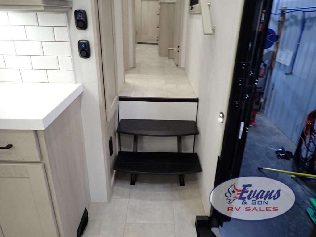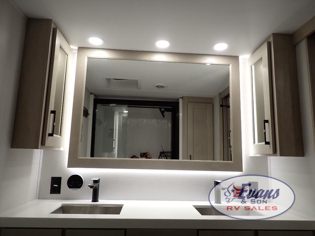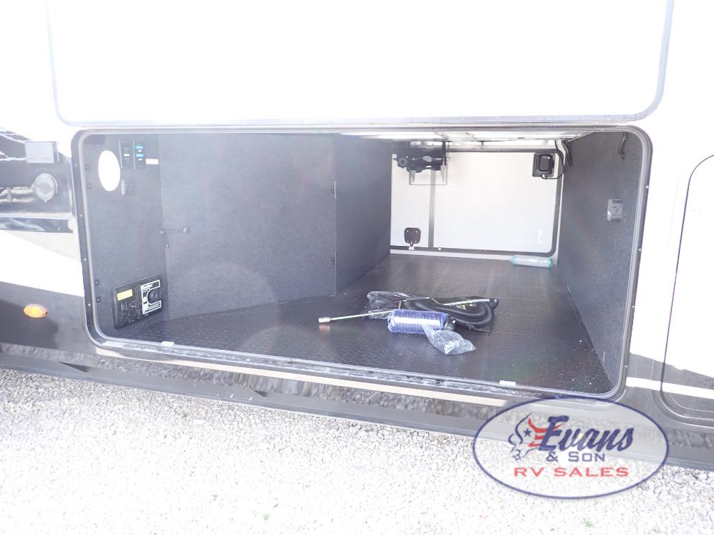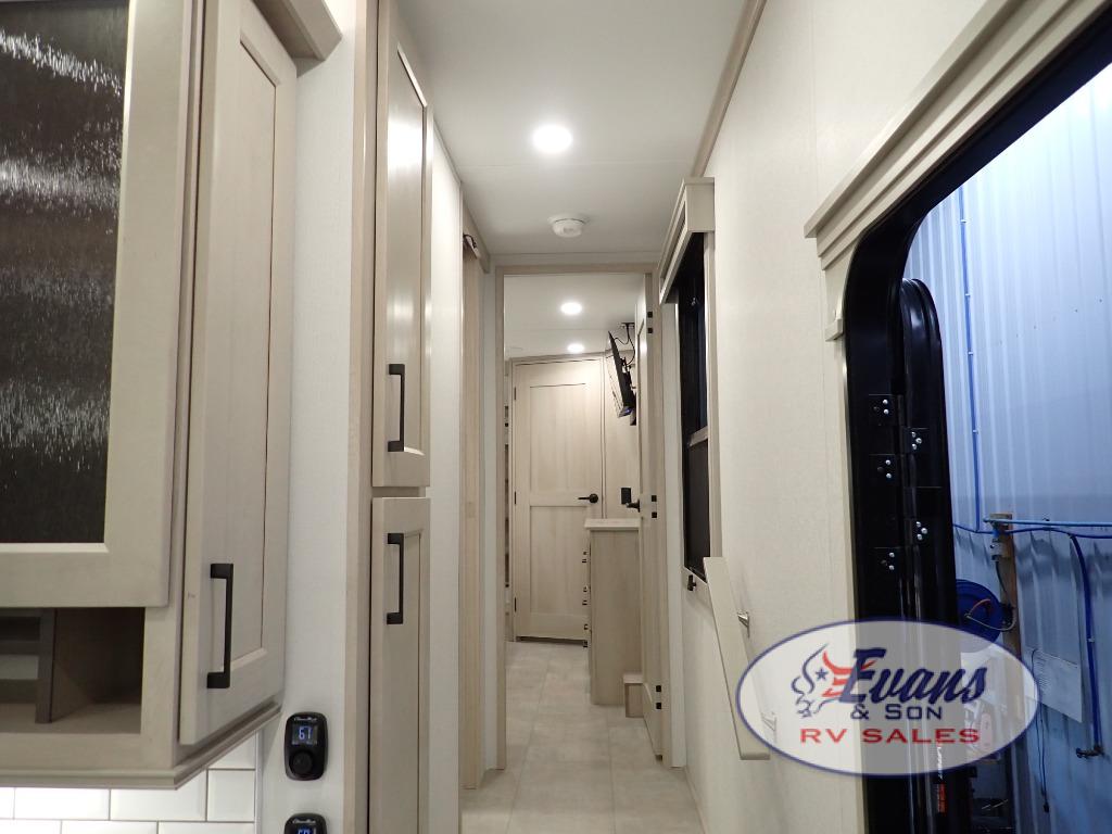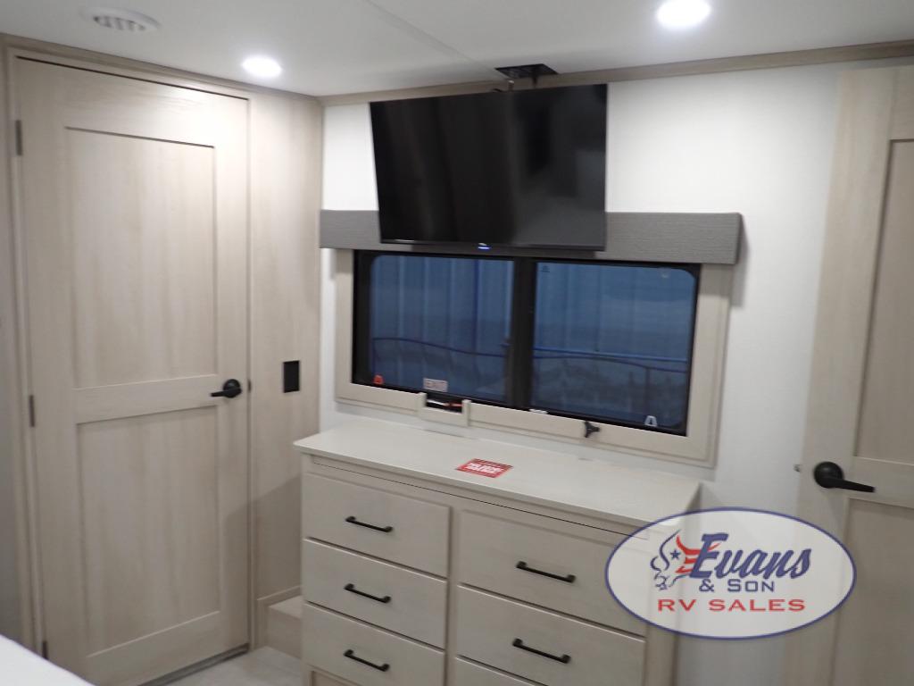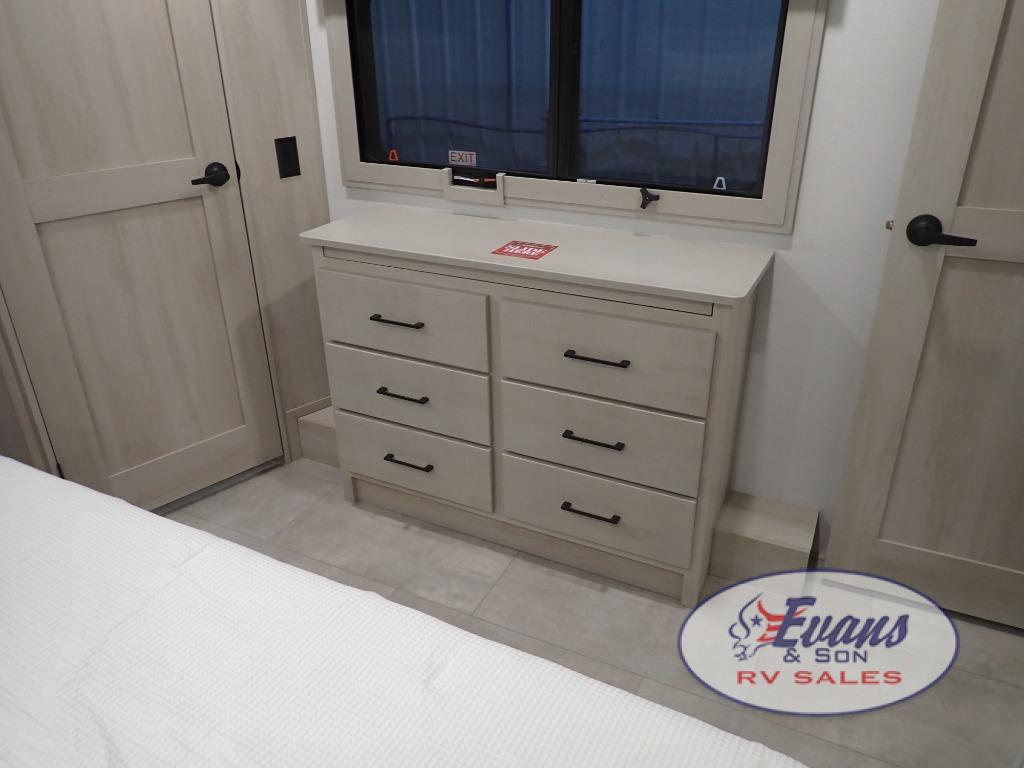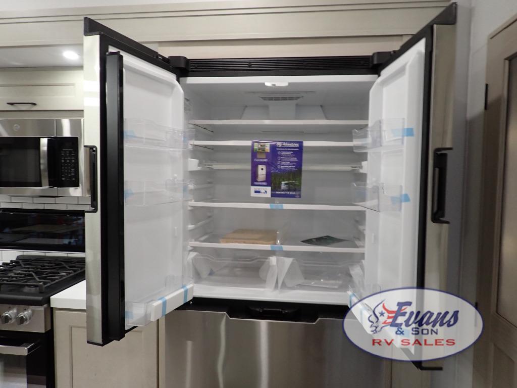 Are you looking to upgrade from a travel trailer to a fifth wheel? If so, this model will be perfect for you! Once you arrive at the campground, you can unload your gear from the pass-through storage, put out the two power awnings, then relax with a cold drink. Inside, you can kick your feet up on the theater seating, play a game at the free-standing dinette, or relax on the tri-fold sofa. The chef of your group will have a kitchen island with a Smart sink, dishwasher prep if you want the option to make cleaning up easier, plus a spacious 20 cu. ft. 12V refrigerator. There is also a built-in oven, plus a pantry and a hutch for storage galore! Having two bath sinks in the full bath is sure to be a big convenience when getting ready for bed, and the queen bed slide out in the front bedroom will provide a great night's rest. You will also find a front wardrobe, a slide top dresser, plus washer/dryer prep!