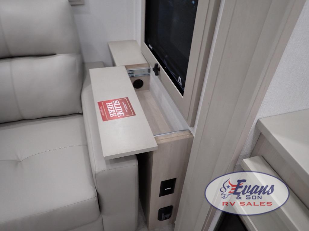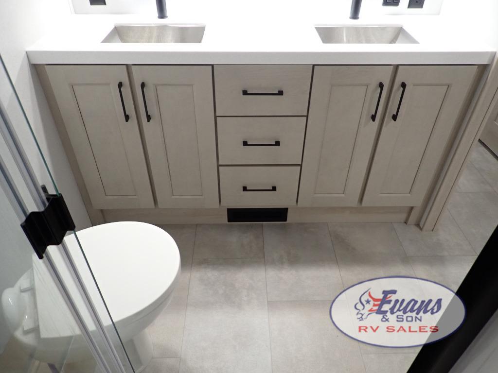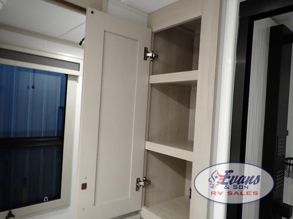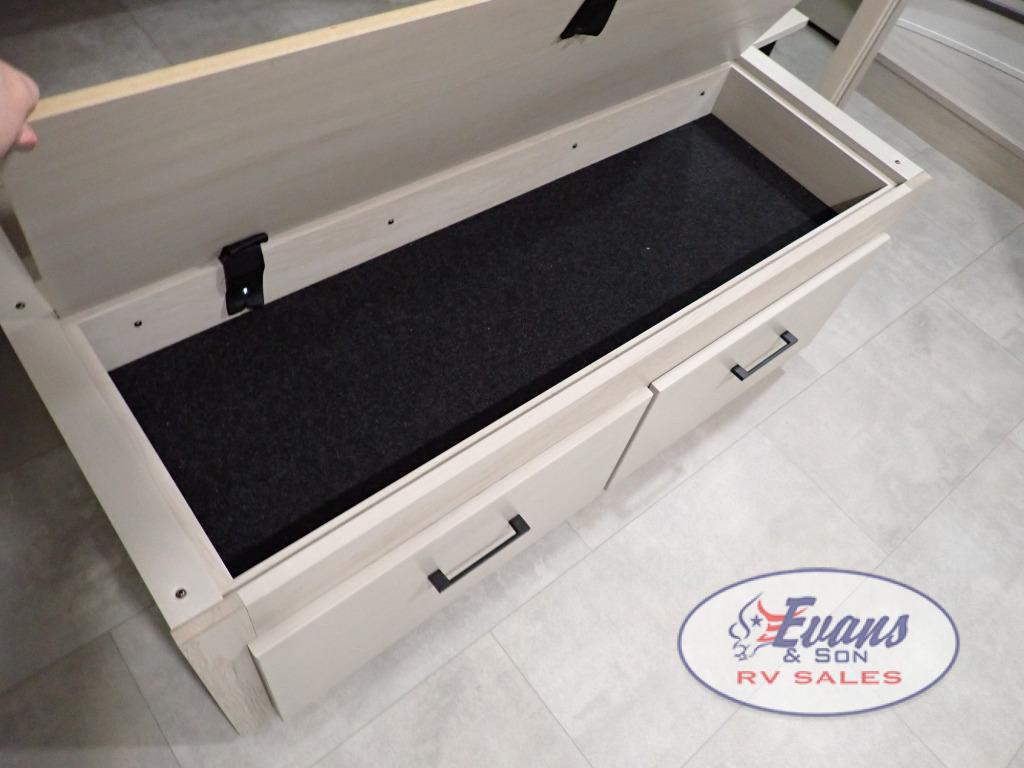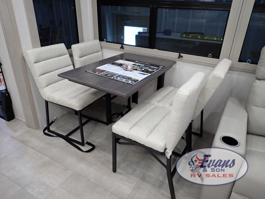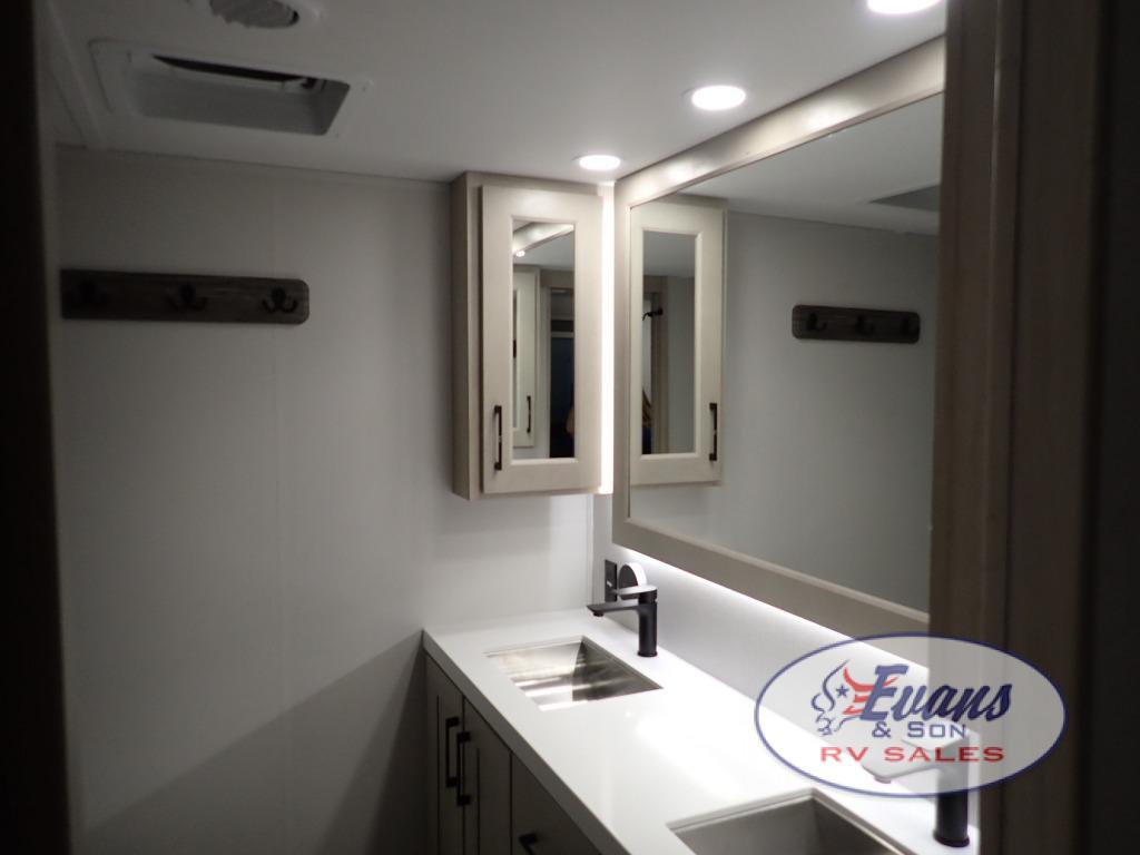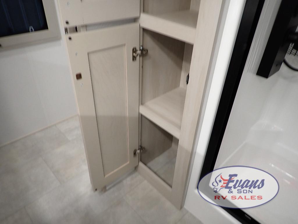 Are you looking to upgrade from a travel trailer to a fifth wheel? If so, this model will be perfect for you! Once you arrive at the campground, you can unload your gear from the pass-through storage, put out the two power awnings, then relax with a cold drink. Inside, you can kick your feet up on the theater seating, play a game at the free-standing dinette, or relax on the tri-fold sofa. The chef of your group will have a kitchen island with a Smart sink, dishwasher prep if you want the option to make cleaning up easier, plus a spacious 20 cu. ft. 12V refrigerator. There is also a built-in oven, plus a pantry and a hutch for storage galore! Having two bath sinks in the full bath is sure to be a big convenience when getting ready for bed, and the queen bed slide out in the front bedroom will provide a great night's rest. You will also find a front wardrobe, a slide top dresser, plus washer/dryer prep!