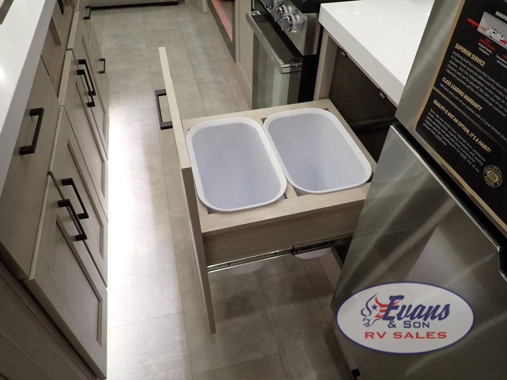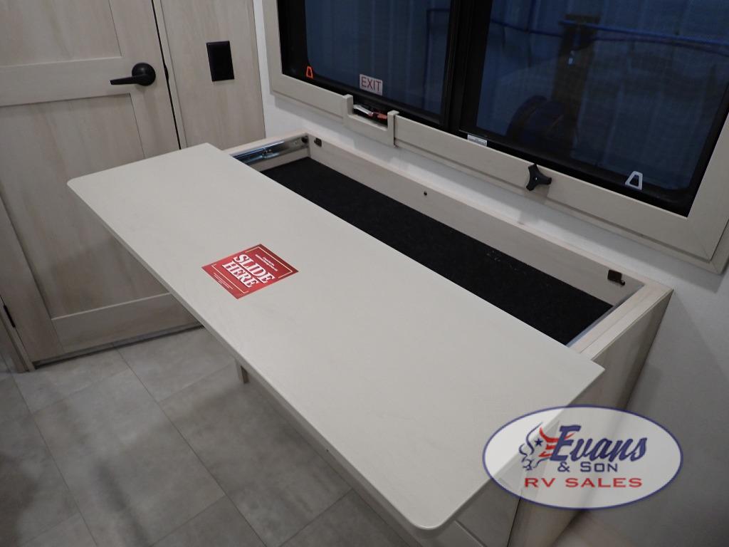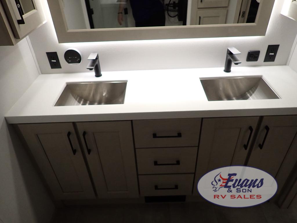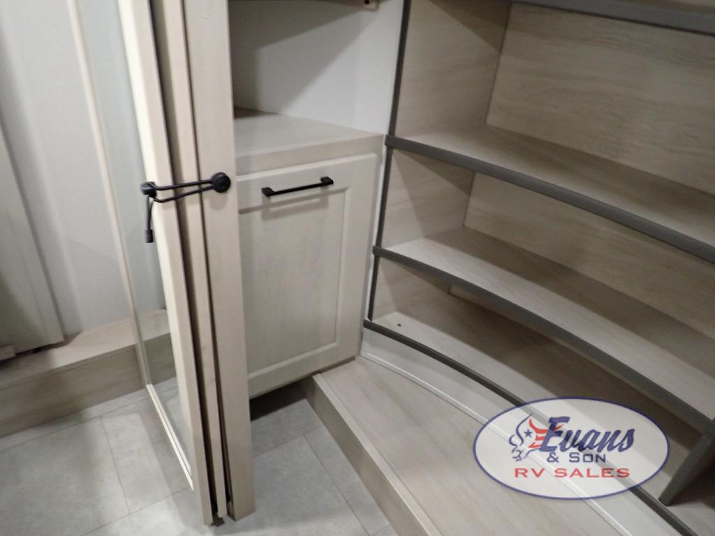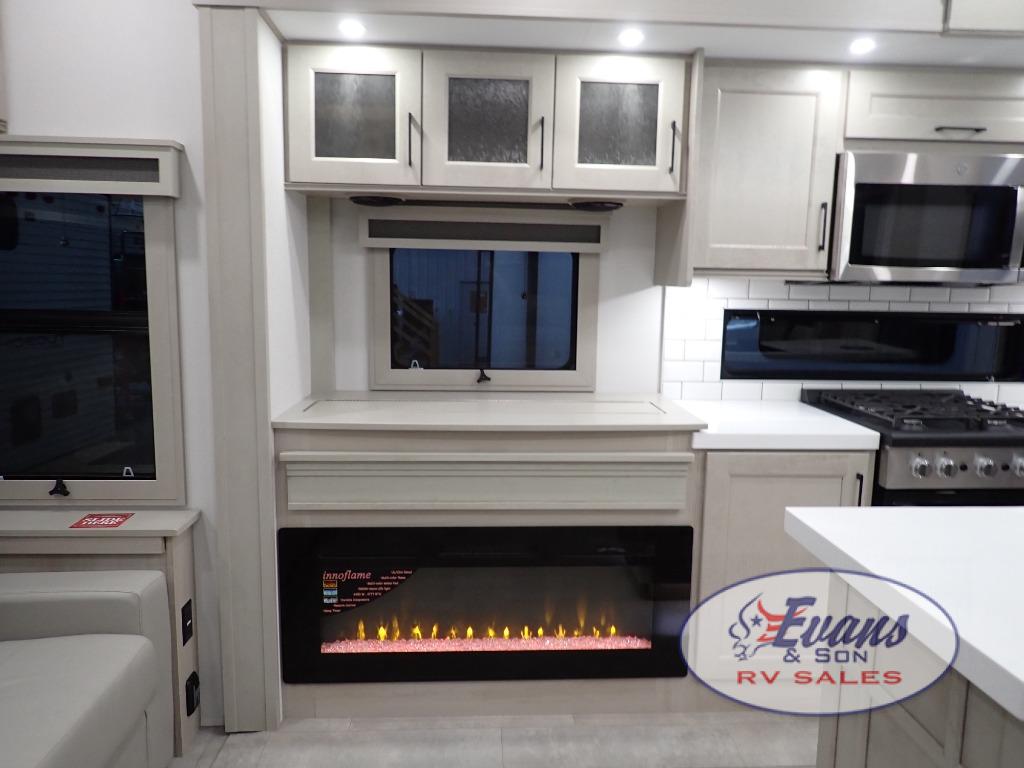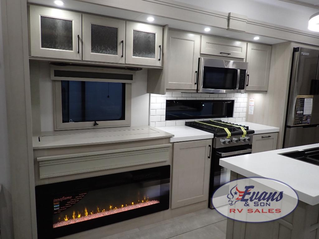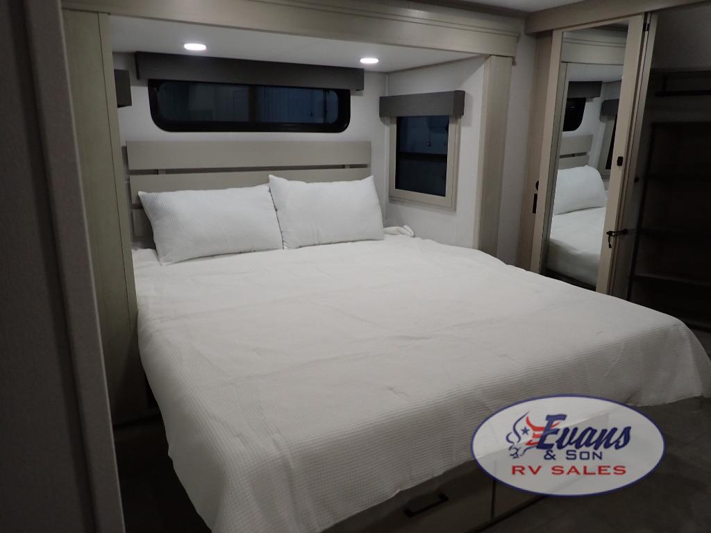 Are you looking to upgrade from a travel trailer to a fifth wheel? If so, this model will be perfect for you! Once you arrive at the campground, you can unload your gear from the pass-through storage, put out the two power awnings, then relax with a cold drink. Inside, you can kick your feet up on the theater seating, play a game at the free-standing dinette, or relax on the tri-fold sofa. The chef of your group will have a kitchen island with a Smart sink, dishwasher prep if you want the option to make cleaning up easier, plus a spacious 20 cu. ft. 12V refrigerator. There is also a built-in oven, plus a pantry and a hutch for storage galore! Having two bath sinks in the full bath is sure to be a big convenience when getting ready for bed, and the queen bed slide out in the front bedroom will provide a great night's rest. You will also find a front wardrobe, a slide top dresser, plus washer/dryer prep!