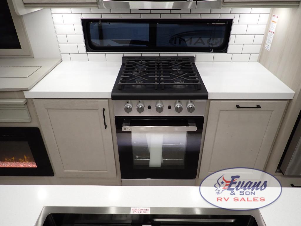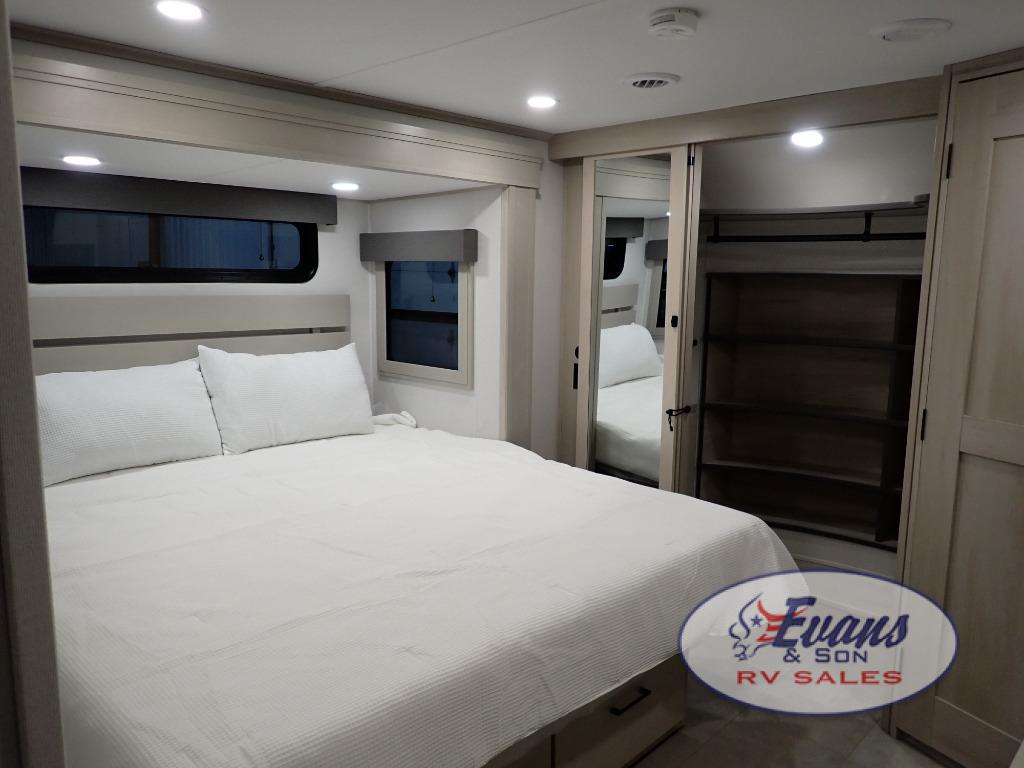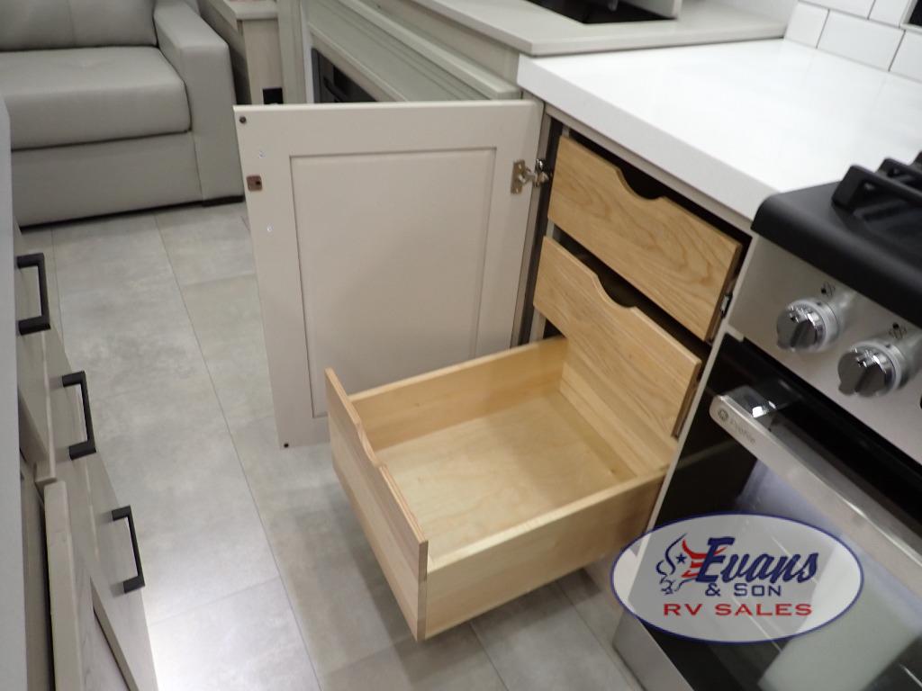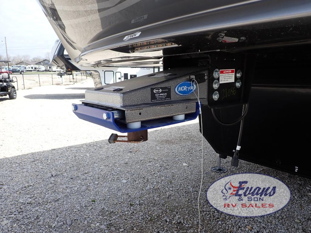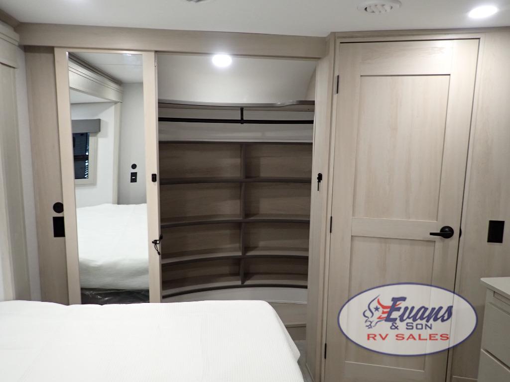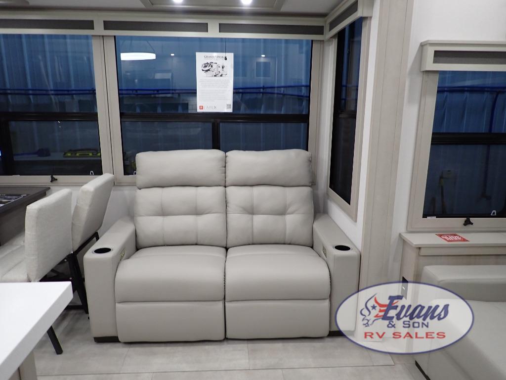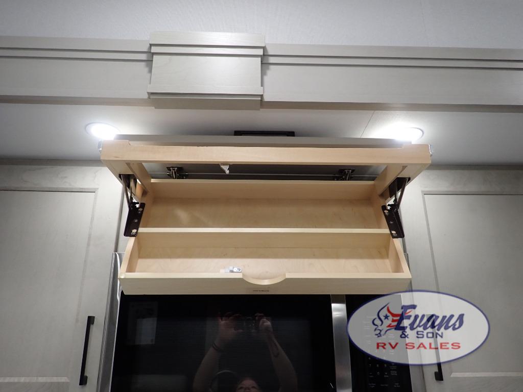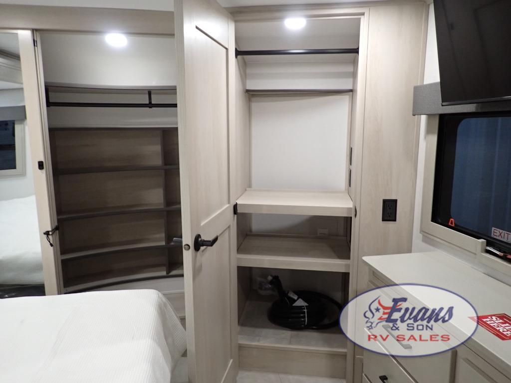 Are you looking to upgrade from a travel trailer to a fifth wheel? If so, this model will be perfect for you! Once you arrive at the campground, you can unload your gear from the pass-through storage, put out the two power awnings, then relax with a cold drink. Inside, you can kick your feet up on the theater seating, play a game at the free-standing dinette, or relax on the tri-fold sofa. The chef of your group will have a kitchen island with a Smart sink, dishwasher prep if you want the option to make cleaning up easier, plus a spacious 20 cu. ft. 12V refrigerator. There is also a built-in oven, plus a pantry and a hutch for storage galore! Having two bath sinks in the full bath is sure to be a big convenience when getting ready for bed, and the queen bed slide out in the front bedroom will provide a great night's rest. You will also find a front wardrobe, a slide top dresser, plus washer/dryer prep!