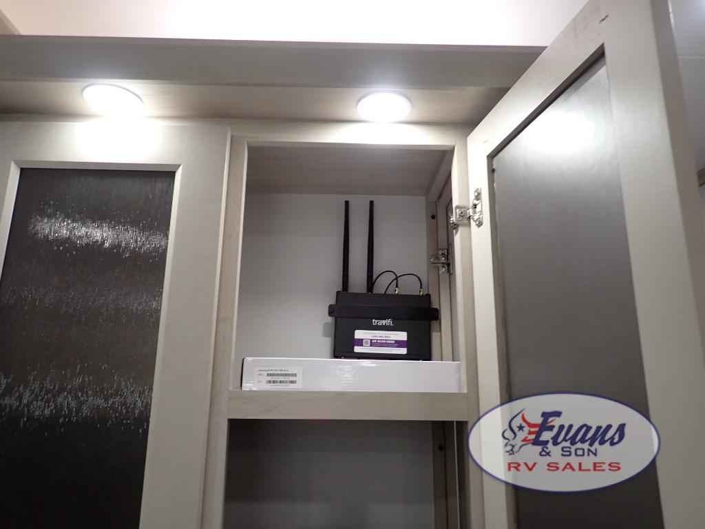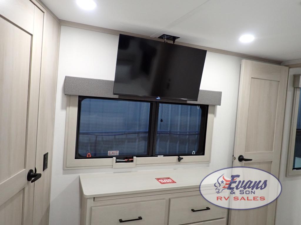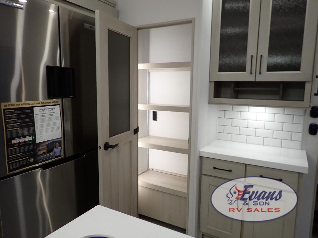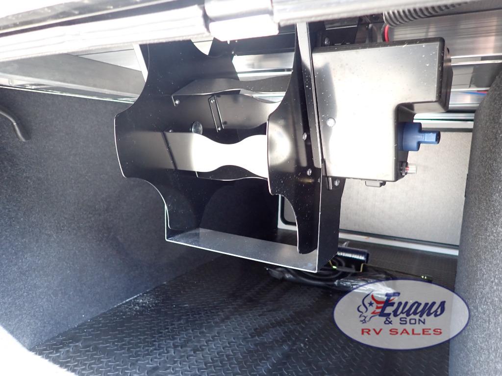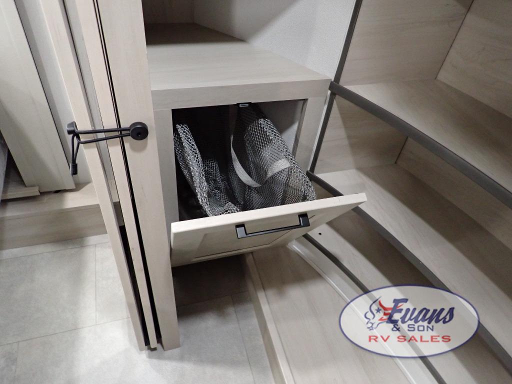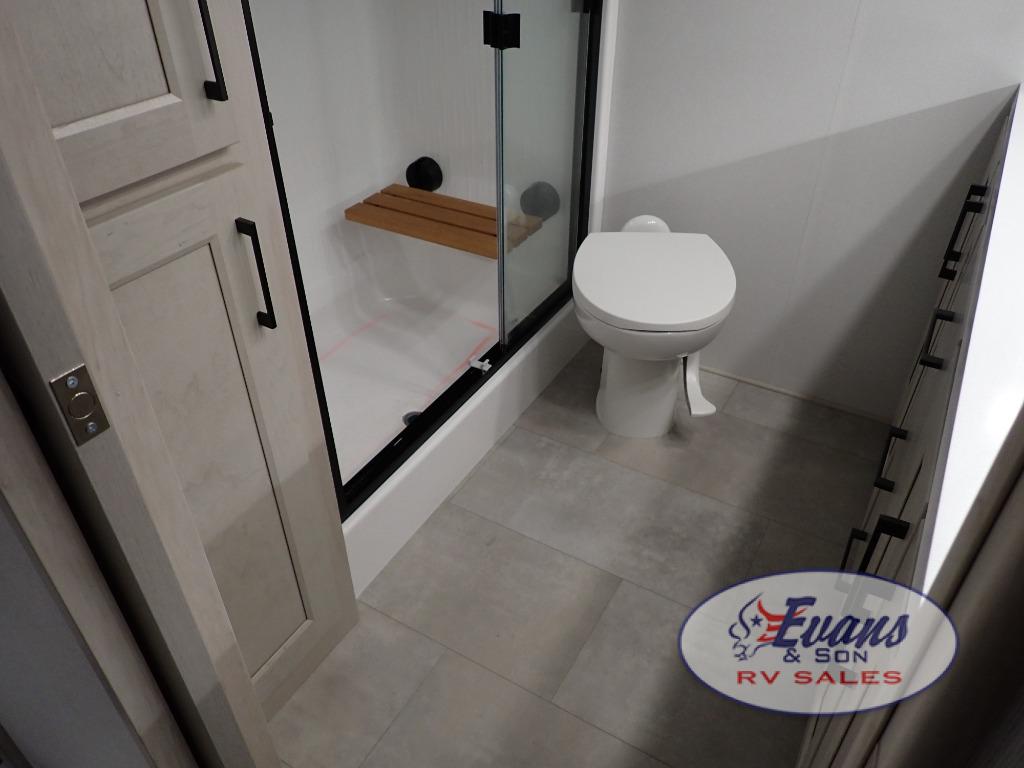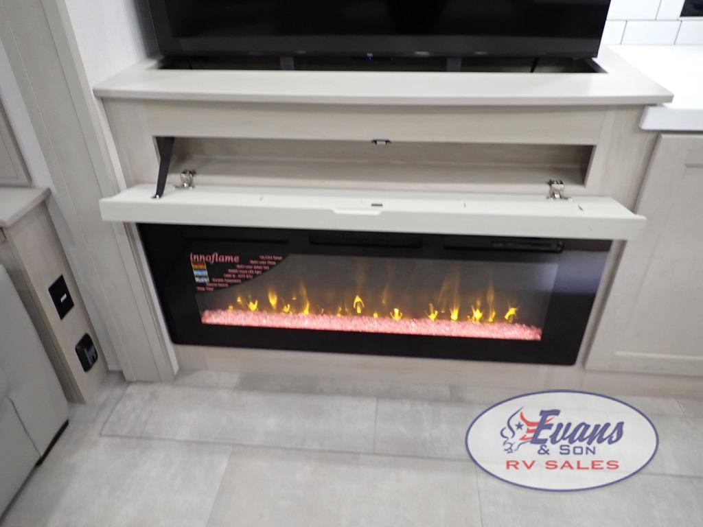 Are you looking to upgrade from a travel trailer to a fifth wheel? If so, this model will be perfect for you! Once you arrive at the campground, you can unload your gear from the pass-through storage, put out the two power awnings, then relax with a cold drink. Inside, you can kick your feet up on the theater seating, play a game at the free-standing dinette, or relax on the tri-fold sofa. The chef of your group will have a kitchen island with a Smart sink, dishwasher prep if you want the option to make cleaning up easier, plus a spacious 20 cu. ft. 12V refrigerator. There is also a built-in oven, plus a pantry and a hutch for storage galore! Having two bath sinks in the full bath is sure to be a big convenience when getting ready for bed, and the queen bed slide out in the front bedroom will provide a great night's rest. You will also find a front wardrobe, a slide top dresser, plus washer/dryer prep!