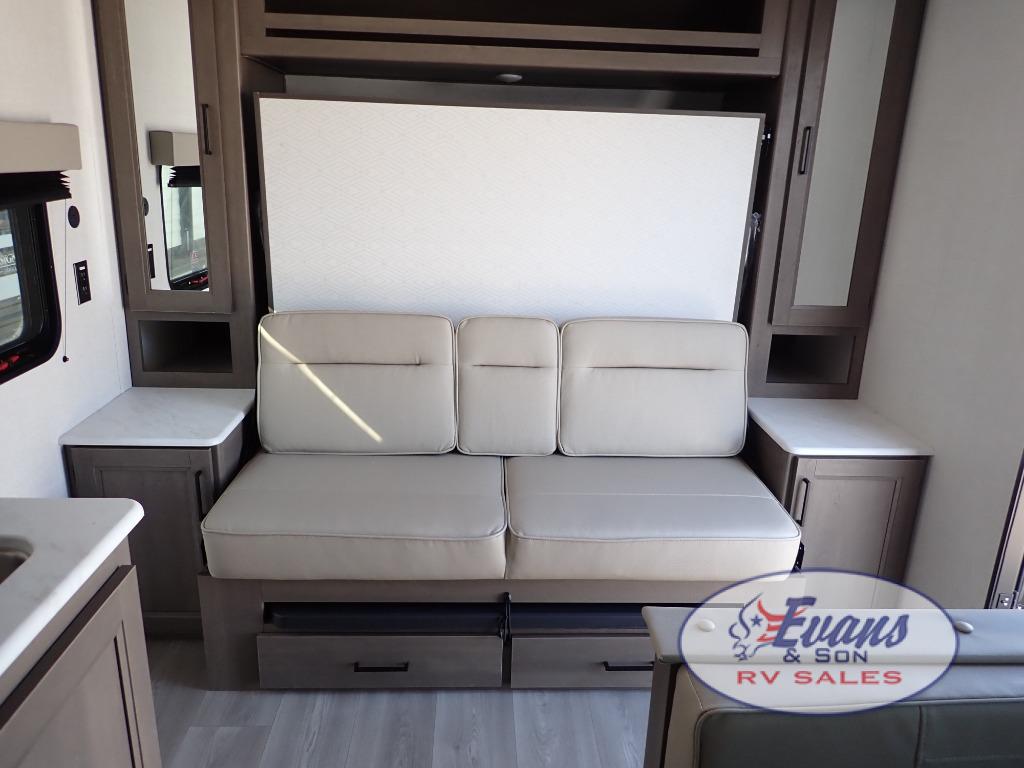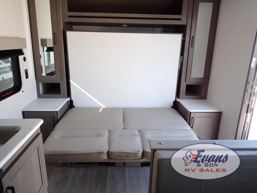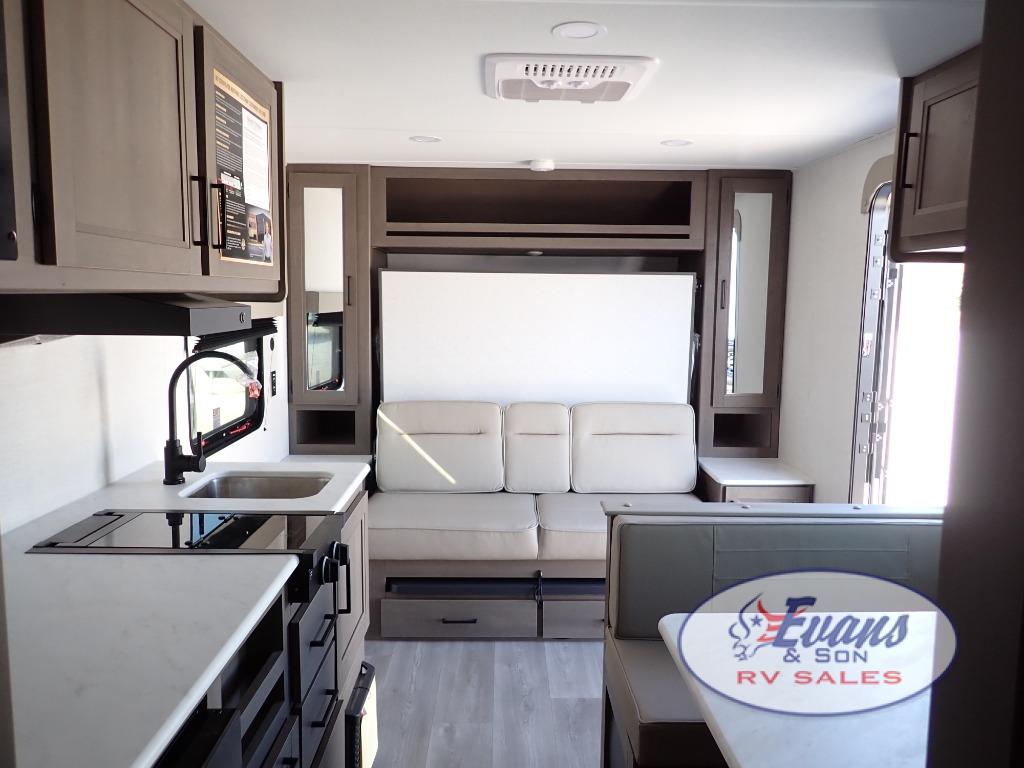 This is the perfect couple's trailer with versatile seating and sleeping space! You'll find a queen-size Murphy bed up front with storage space beside and above plus a full rear bath for added privacy. Once you've made lunch in the full kitchen, you can dine at the booth dinette, or take your plate outdoors to sit under the 10' power awning with an LED light. You'll also find an unobstructed pass-thru storage outside that will be perfect for fishing poles, lawn chairs, tools and more!