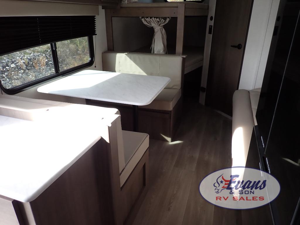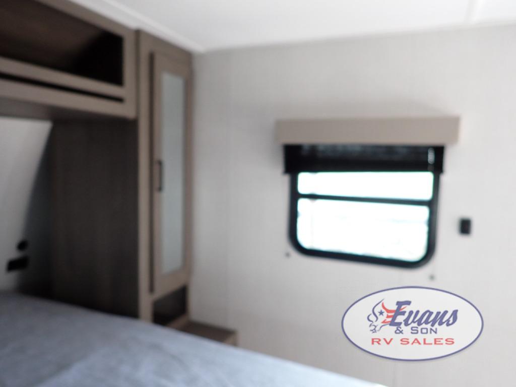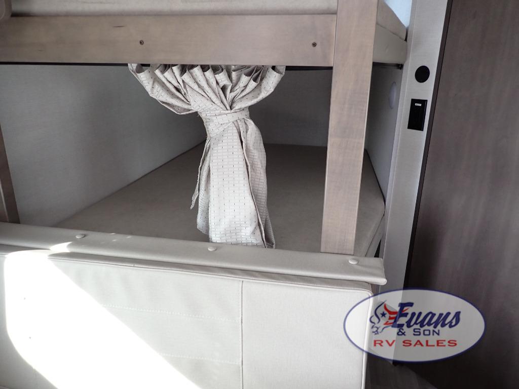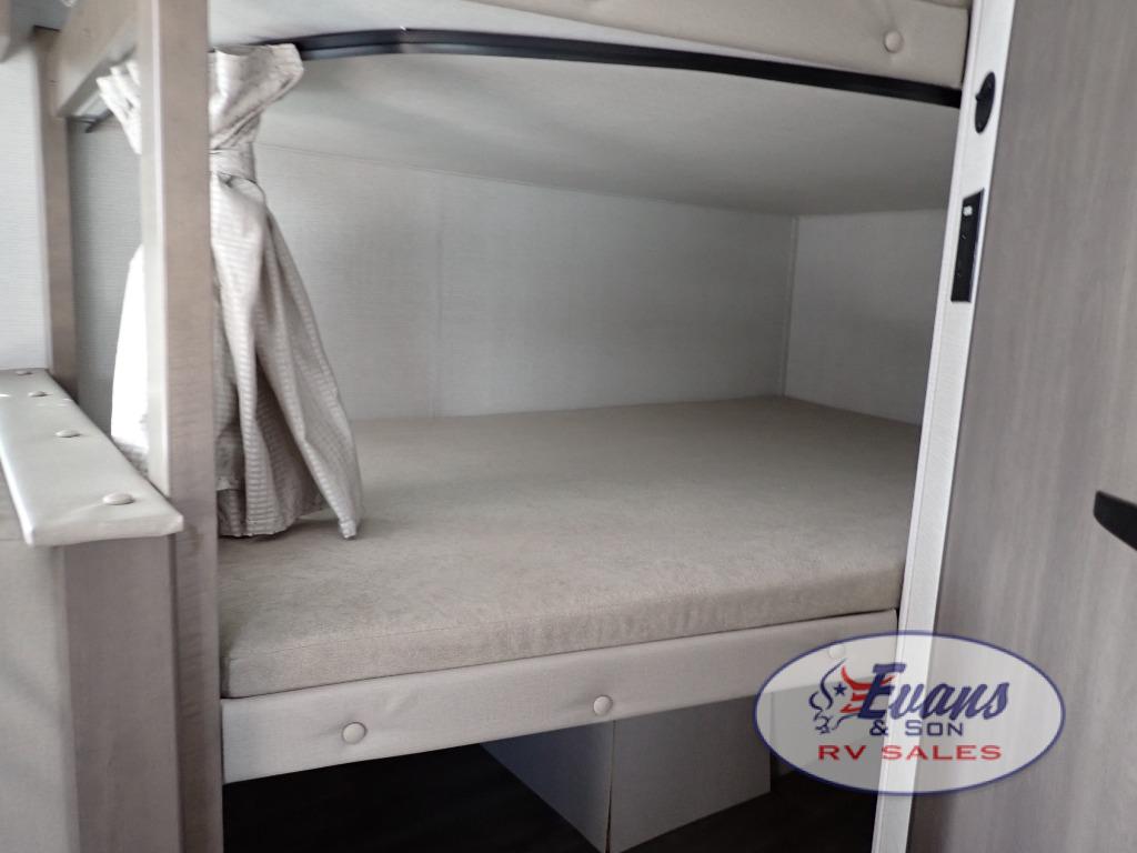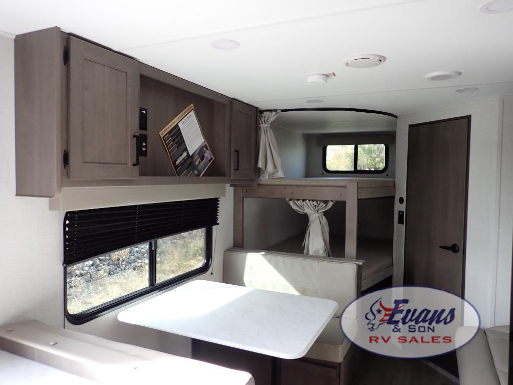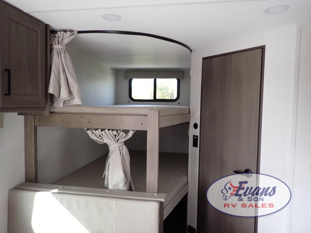 This is the perfect travel trailer if you like to camp with friends and family. Since there are double-size bunks, a queen bed in the front bedroom, plus a booth dinette and sofa, you can sleep eight campers each night! The three burner range and microwave in the kitchen will let you cook meals each day, and the 12V refrigerator will keep your cold items fresh. This model also includes a counter with extra storage underneath, a pull-out trash can storage for convenience, and a full bath to freshen up in each day. And you'll love having your own space in the front bedroom with a privacy curtain, dual wardrobes, and TV prep if you want to add a television!