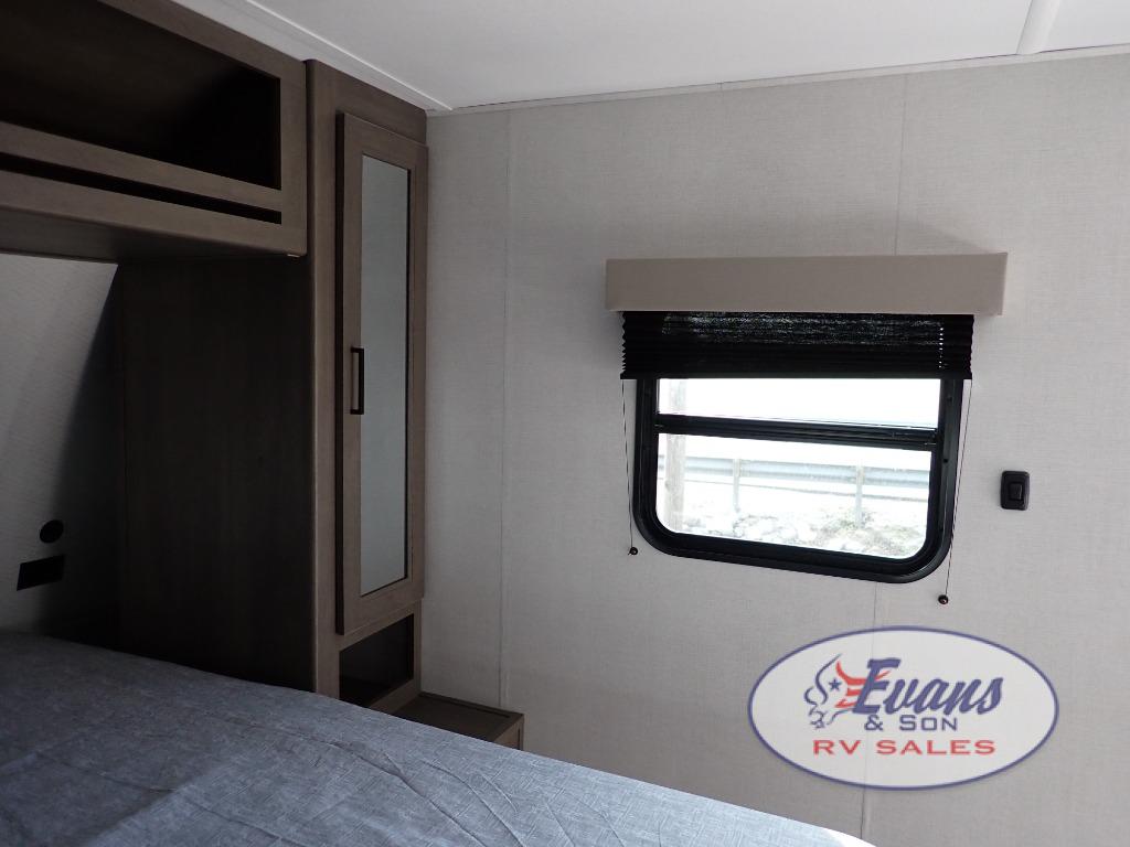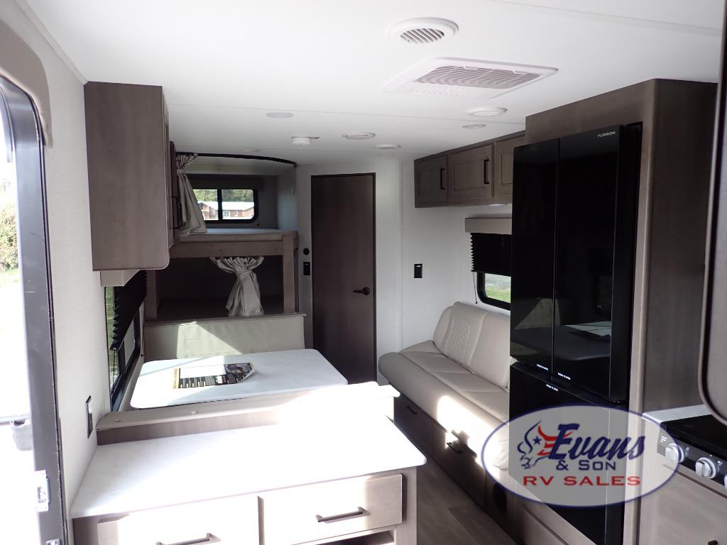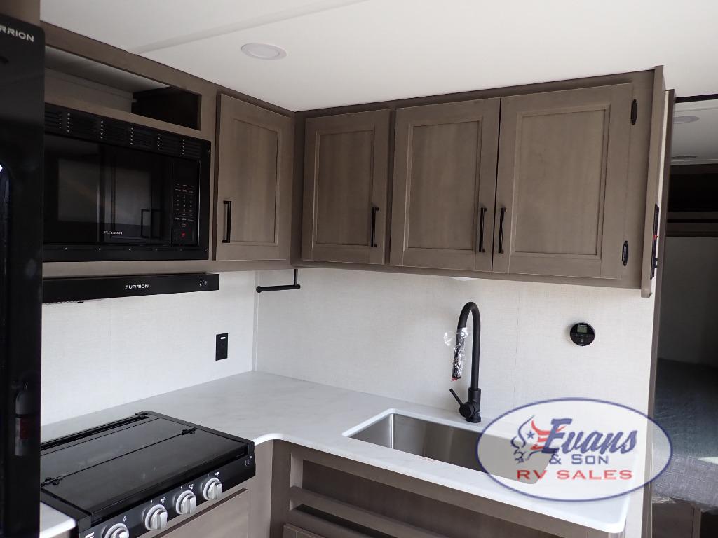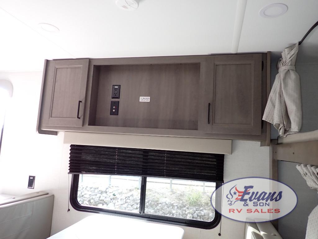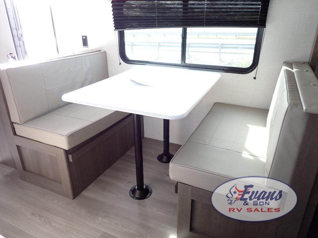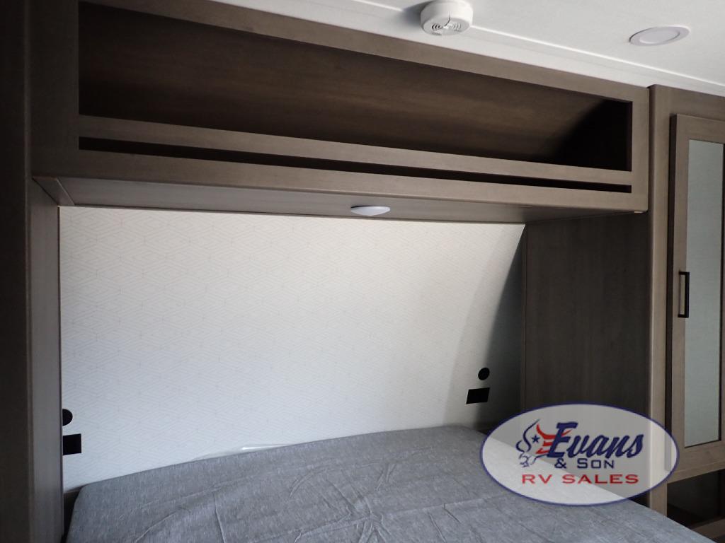 This is the perfect travel trailer if you like to camp with friends and family. Since there are double-size bunks, a queen bed in the front bedroom, plus a booth dinette and sofa, you can sleep eight campers each night! The three burner range and microwave in the kitchen will let you cook meals each day, and the 12V refrigerator will keep your cold items fresh. This model also includes a counter with extra storage underneath, a pull-out trash can storage for convenience, and a full bath to freshen up in each day. And you'll love having your own space in the front bedroom with a privacy curtain, dual wardrobes, and TV prep if you want to add a television!