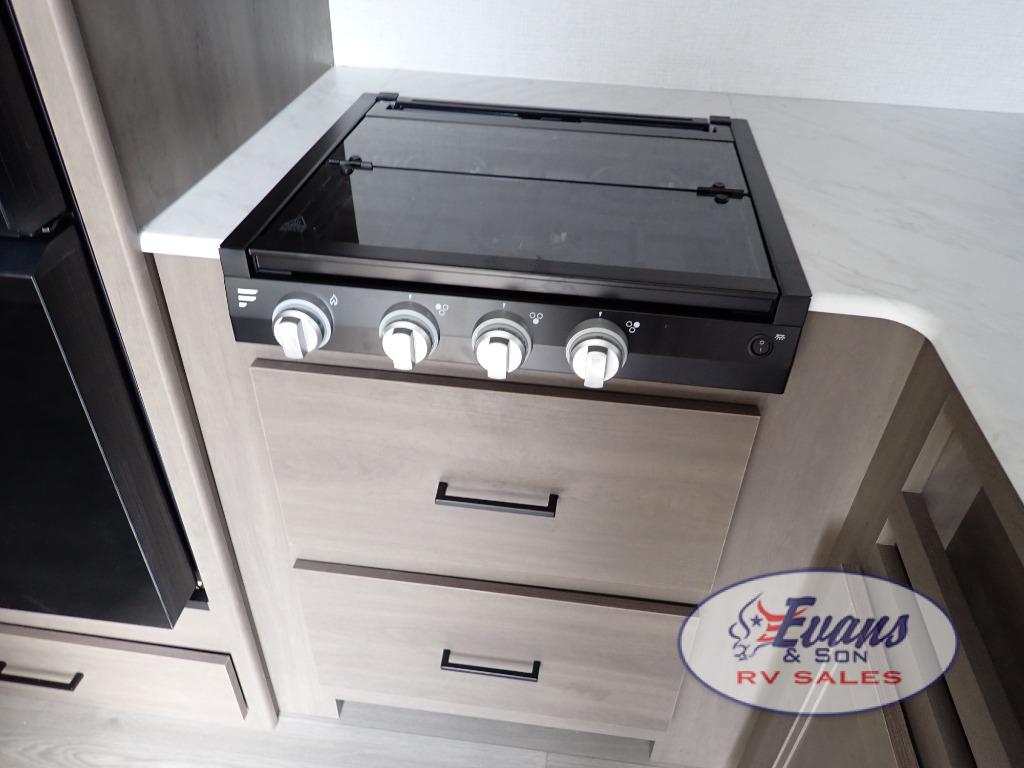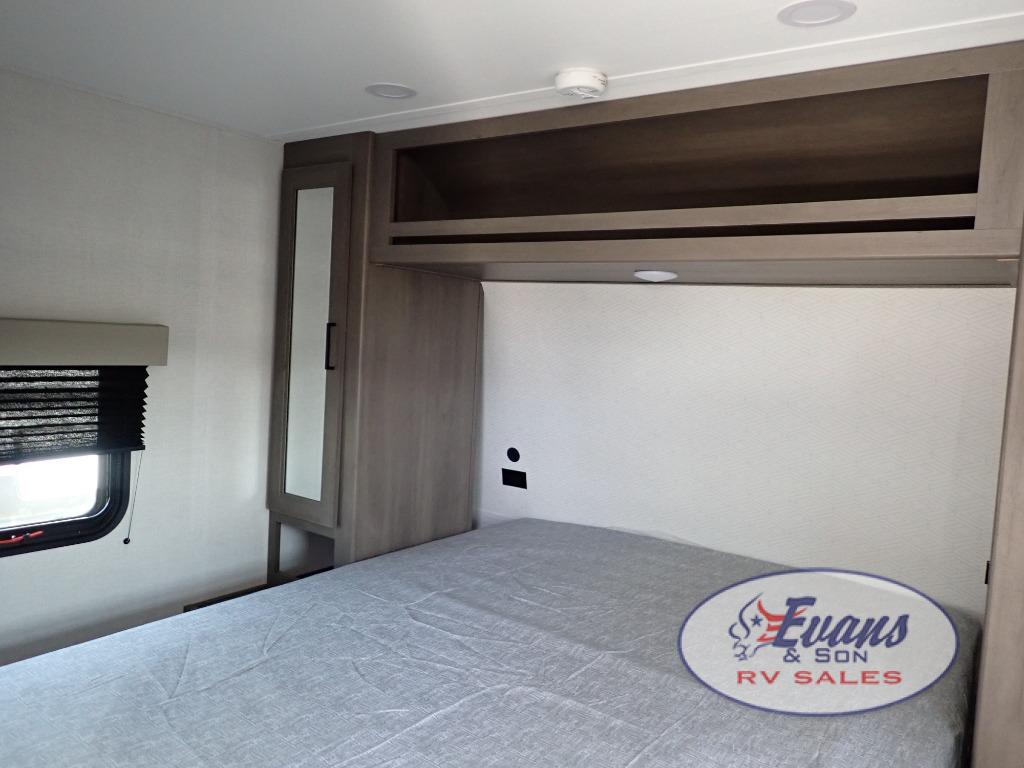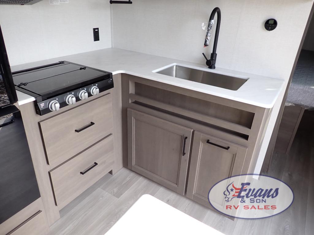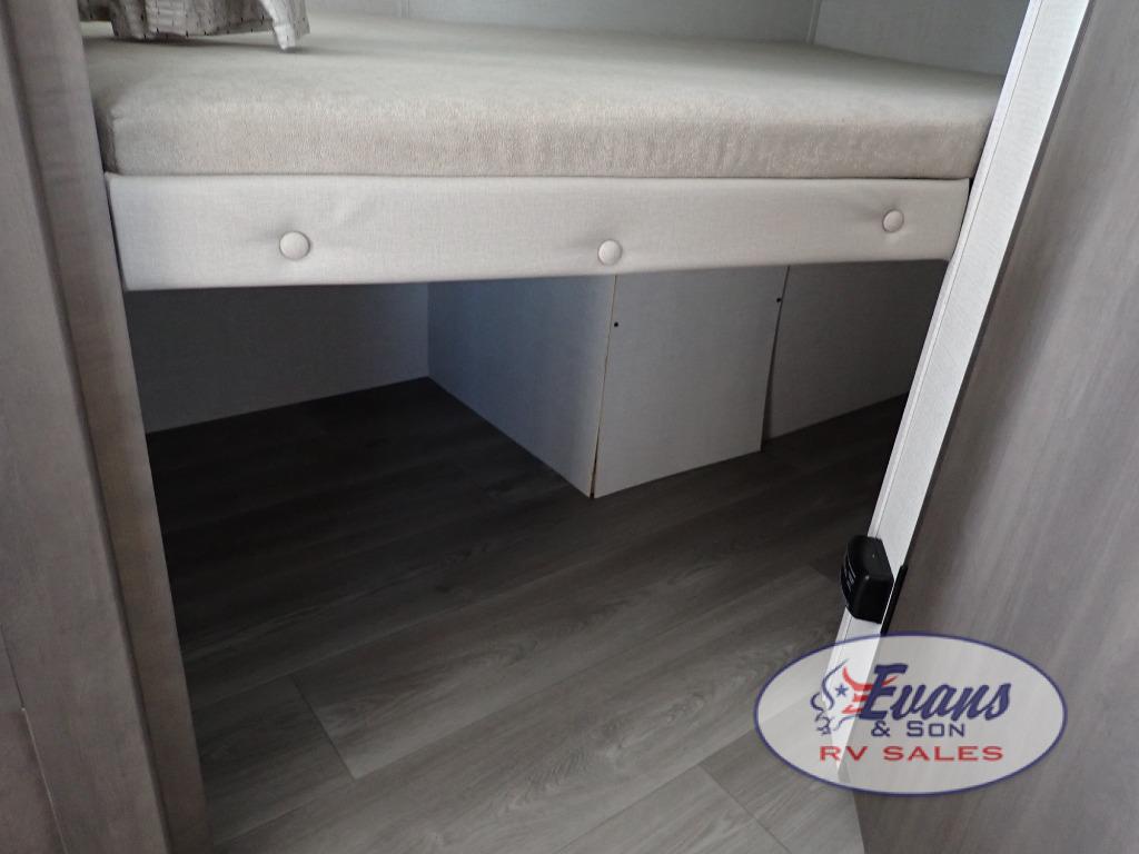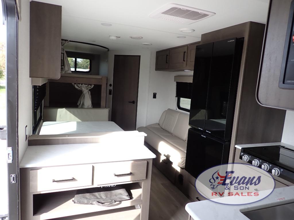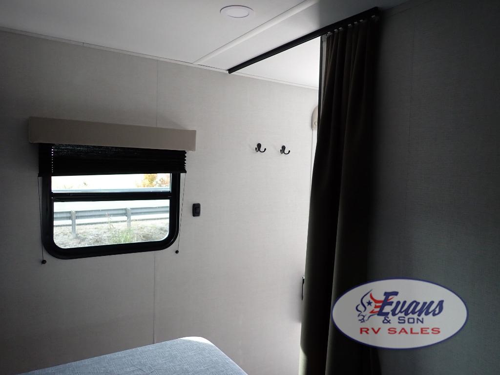 This is the perfect travel trailer if you like to camp with friends and family. Since there are double-size bunks, a queen bed in the front bedroom, plus a booth dinette and sofa, you can sleep eight campers each night! The three burner range and microwave in the kitchen will let you cook meals each day, and the 12V refrigerator will keep your cold items fresh. This model also includes a counter with extra storage underneath, a pull-out trash can storage for convenience, and a full bath to freshen up in each day. And you'll love having your own space in the front bedroom with a privacy curtain, dual wardrobes, and TV prep if you want to add a television!