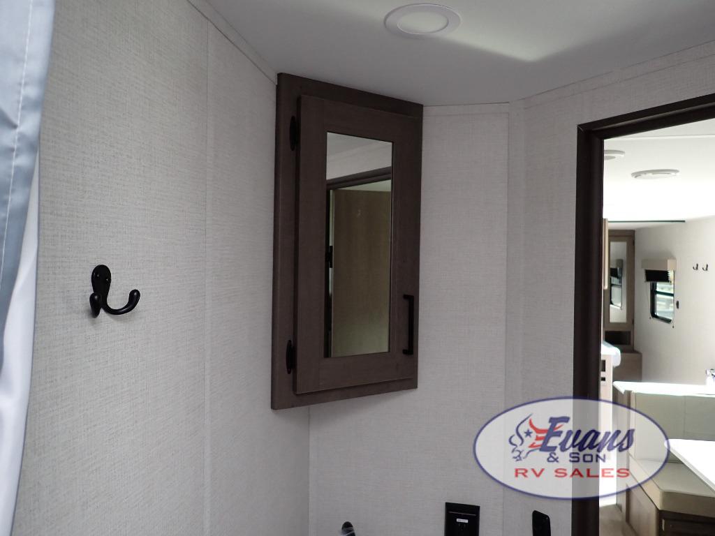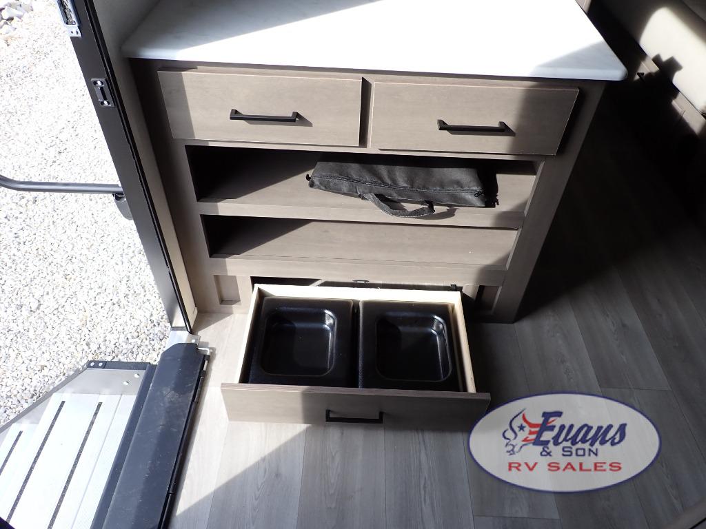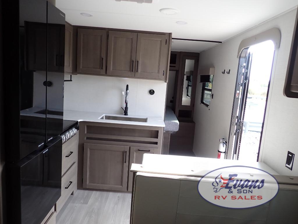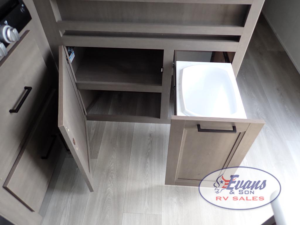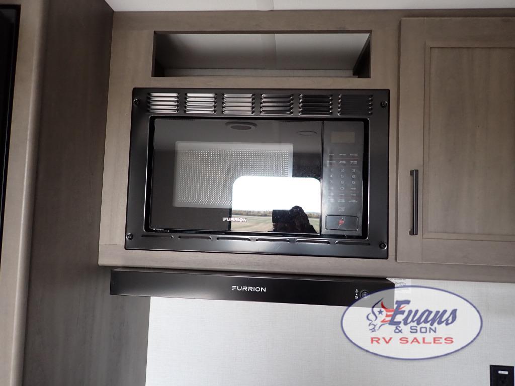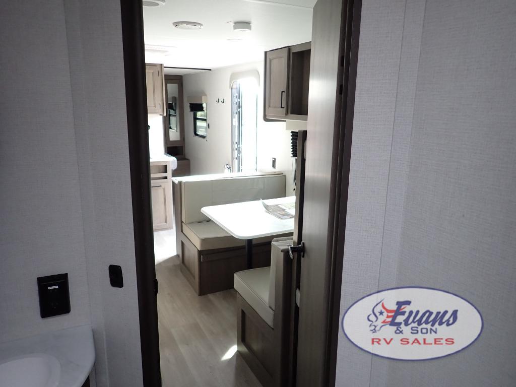 This is the perfect travel trailer if you like to camp with friends and family. Since there are double-size bunks, a queen bed in the front bedroom, plus a booth dinette and sofa, you can sleep eight campers each night! The three burner range and microwave in the kitchen will let you cook meals each day, and the 12V refrigerator will keep your cold items fresh. This model also includes a counter with extra storage underneath, a pull-out trash can storage for convenience, and a full bath to freshen up in each day. And you'll love having your own space in the front bedroom with a privacy curtain, dual wardrobes, and TV prep if you want to add a television!