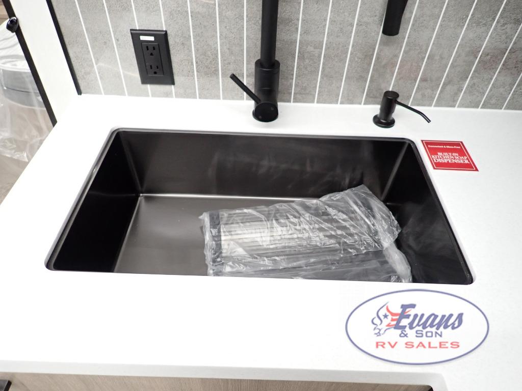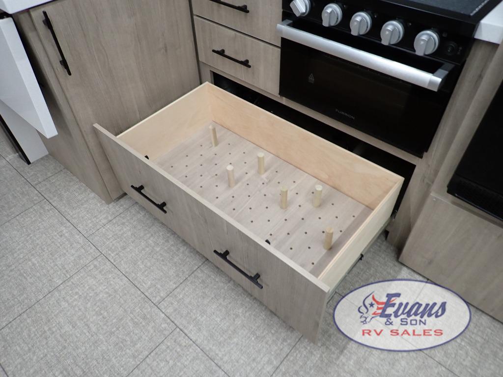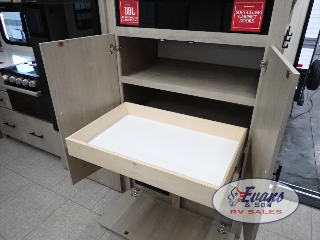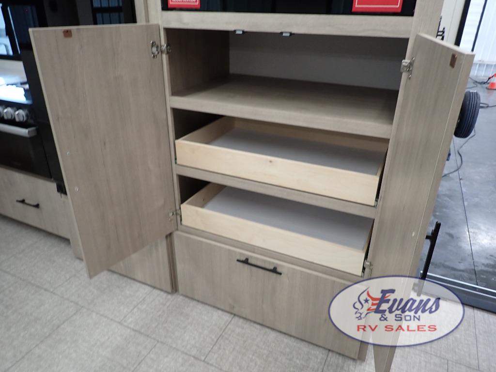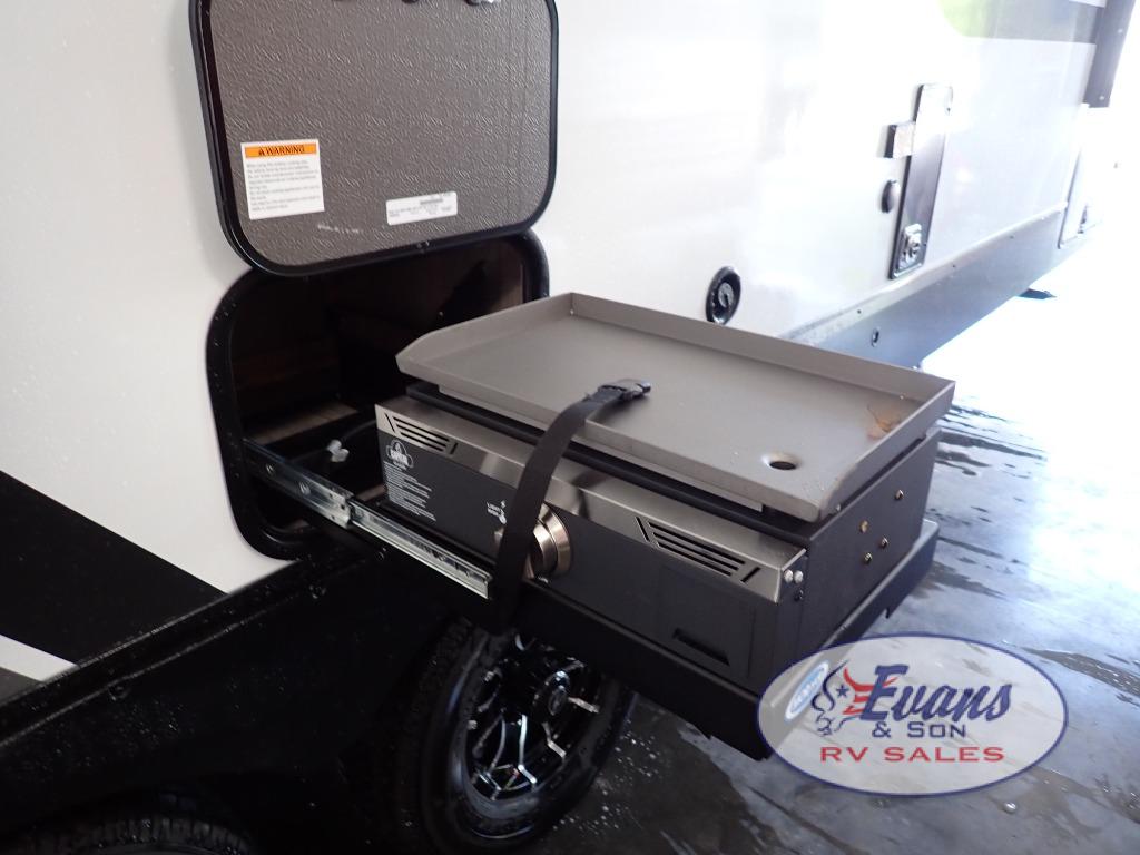 Experience the ultimate in comfort and convenience with this luxurious travel trailer. When you enter this trailer, you'll find convenient shoe storage to your right below the wardrobe/pantry. The full rear bathroom has a 30" x 36" shower with skylight for you to rinse off after you come in from an afternoon hike, and you can lounge on the tri-fold sofa or U-shaped dinette with removable ottoman after you are clean. The large slide creates more interior space, so you can cook freely on the three-burner range with oven in the kitchen, also, you can cook on the outside griddle. You'll have a private bedroom that you can retreat to at the end of a long day, and the 60" x 80" queen bed will provide comfort while you sleep.