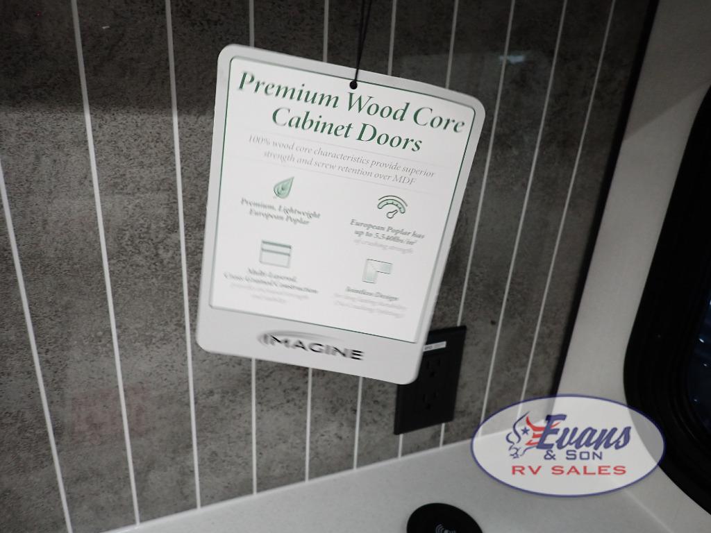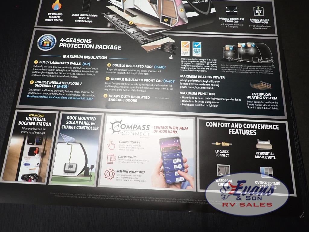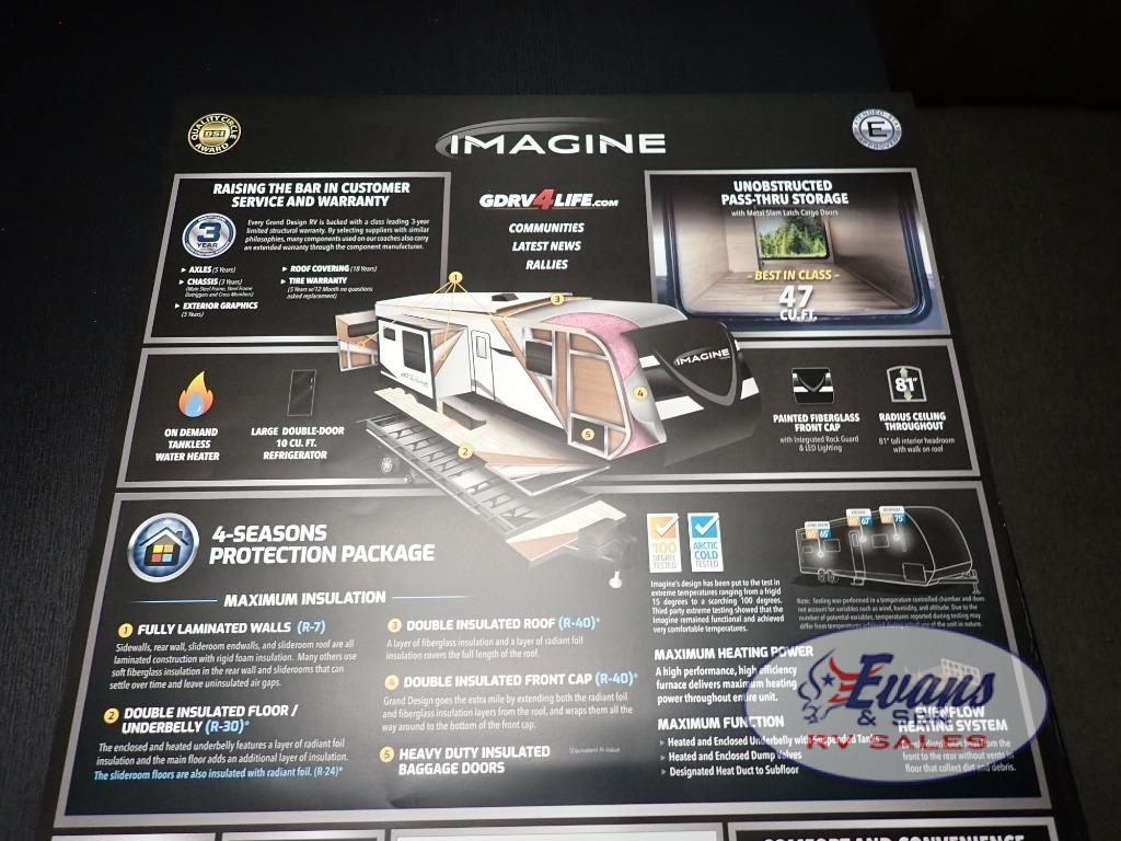 Just imagine leaving the world behind and secluding yourself away with your favorite people in your Grand Design Imagine travel trailer! The Imagine has been designed to enjoy extended season camping and includes a high-capacity furnace, a heated and enclosed underbelly with suspended tanks, a designated heat duct to the subfloor, and a high-density roof insulation with attic vent. You'll have maximum head room on the interior with 81" radius ceilings, and large panoramic windows to let in natural lighting. The exclusive drop-frame pass-through storage compartment is going to allow you to bring along lots of equipment, and the universal docking station is an all-in-one location for utilities and hook-ups. You'll also have oversized tank capacities so that you can fill and empty your tanks less often.