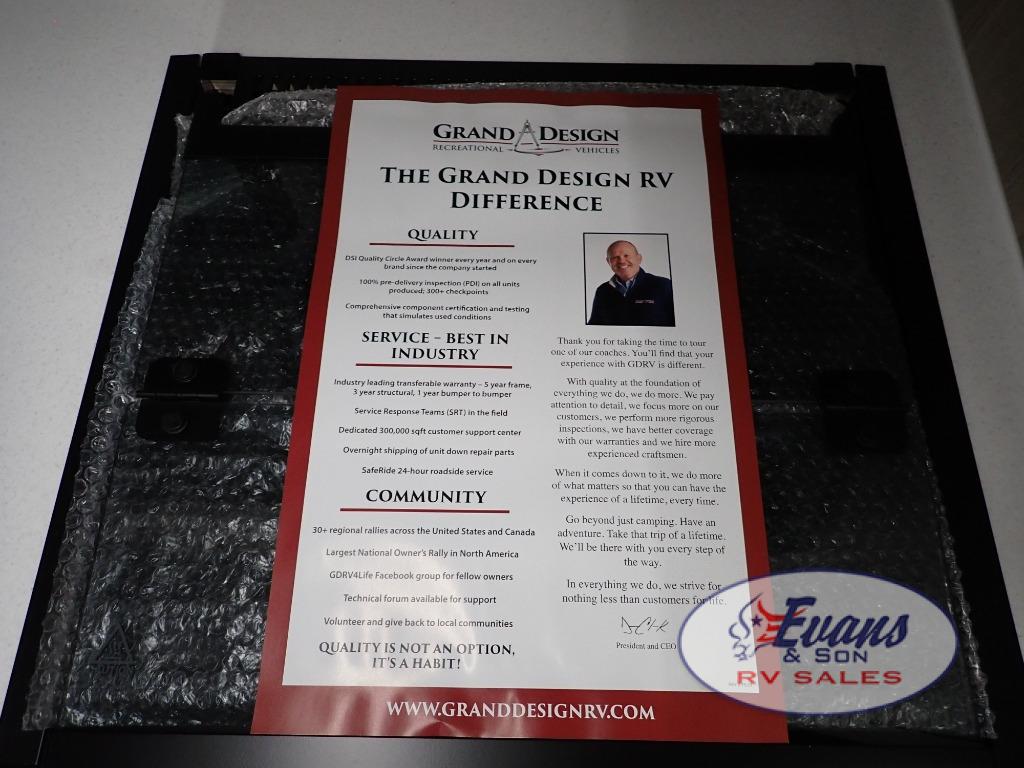 At Grand Design we've raised the quality bar by putting every unit through a series of quality inspection gates during the manufacturing process. Once completed, the unit undergoes a comprehensive “final finish” inspection. Every one of our coaches is shipped to a PDI (Pre-Delivery Inspection) area where they are put through a rigorous 300+ point inspection checklist before being shipped to our dealers. And, we back every one of our coaches with a 3-year limited structural warranty.