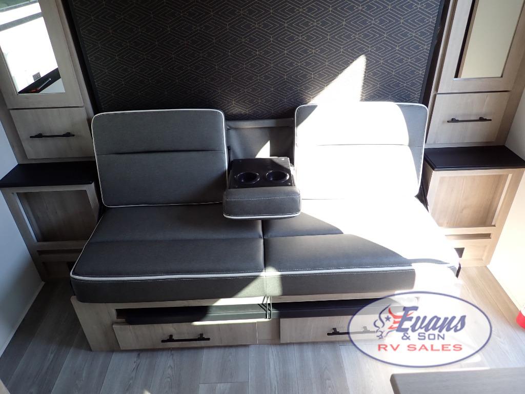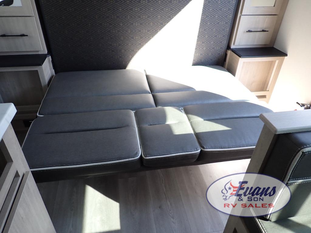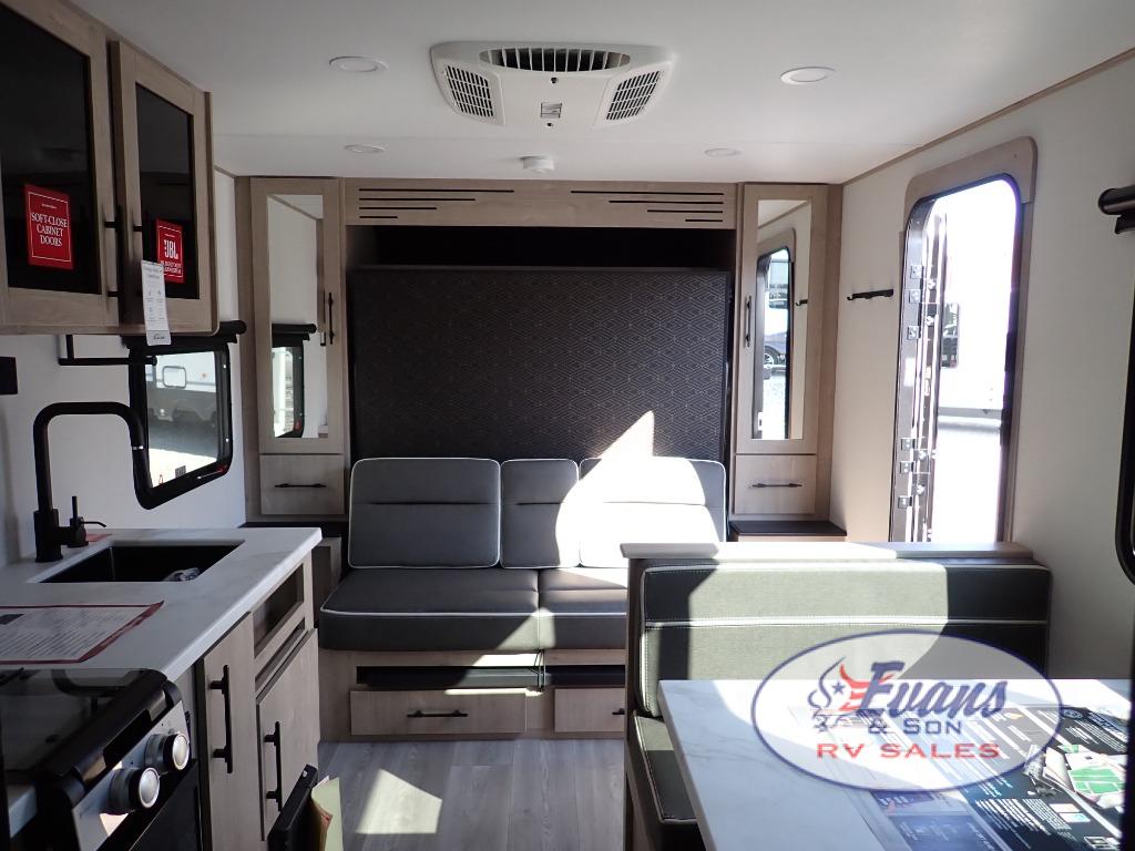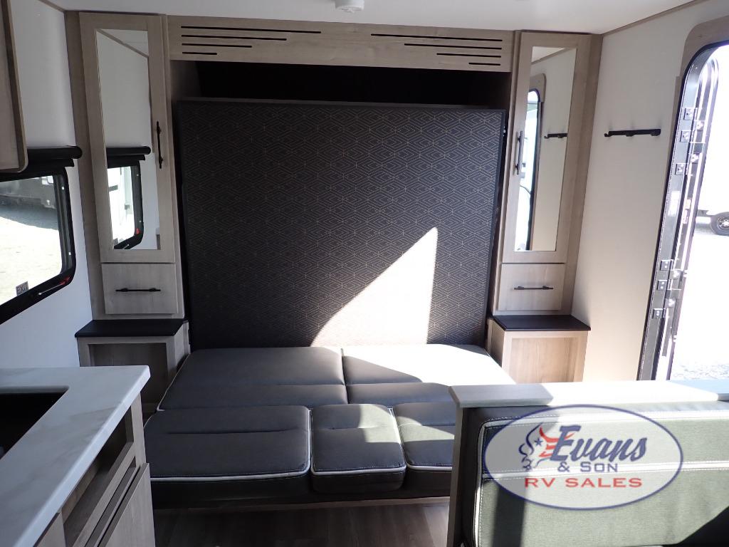 Start looking for your favorite campground to take this travel trailer to! After a fun day at the beach, you can rinse the sand out of your hair with the walk-in shower with a skylight in the full rear bathroom. Depending on what time you enter the unit will determine whether you see the Murphy bed or sofa with drawers underneath and wardrobes on either side of it. The booth dinette is not only great for enjoying meals prepared with the two burner cooktop or outside griddle, but also for transforming into an extra sleeping space!