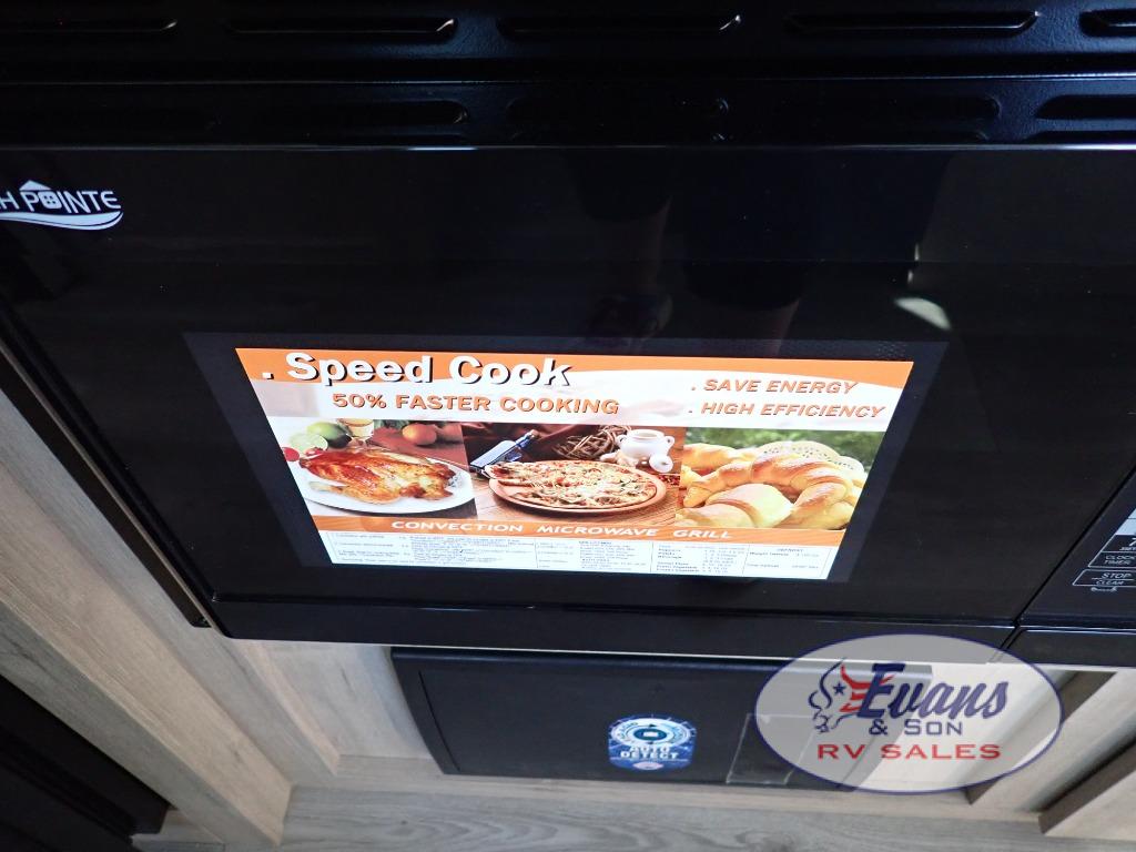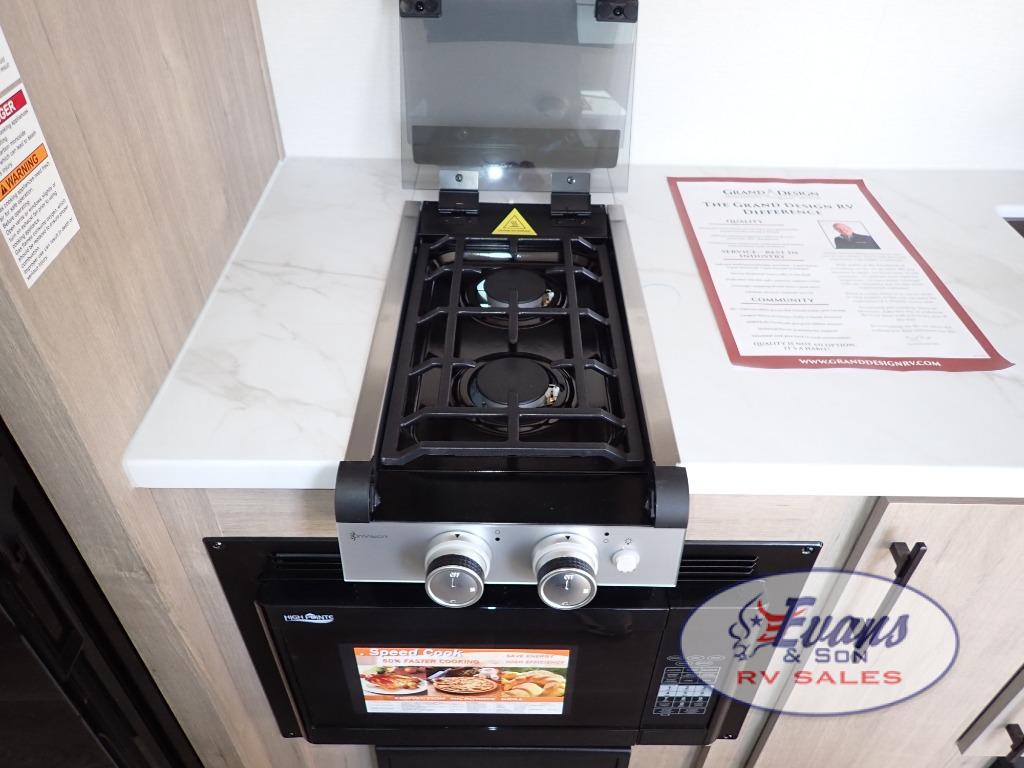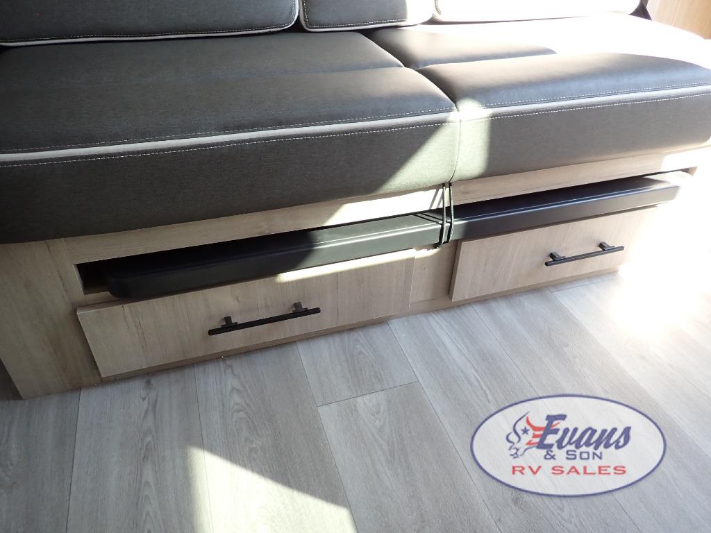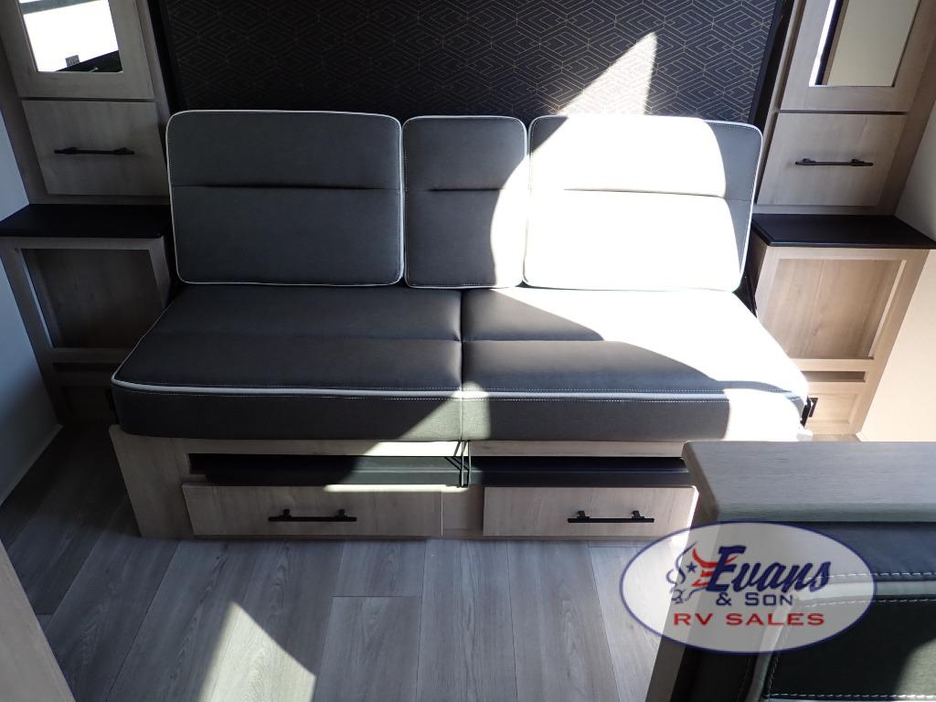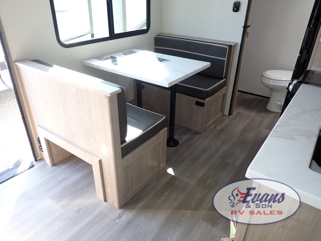 Start looking for your favorite campground to take this travel trailer to! After a fun day at the beach, you can rinse the sand out of your hair with the walk-in shower with a skylight in the full rear bathroom. Depending on what time you enter the unit will determine whether you see the Murphy bed or sofa with drawers underneath and wardrobes on either side of it. The booth dinette is not only great for enjoying meals prepared with the two burner cooktop or outside griddle, but also for transforming into an extra sleeping space!