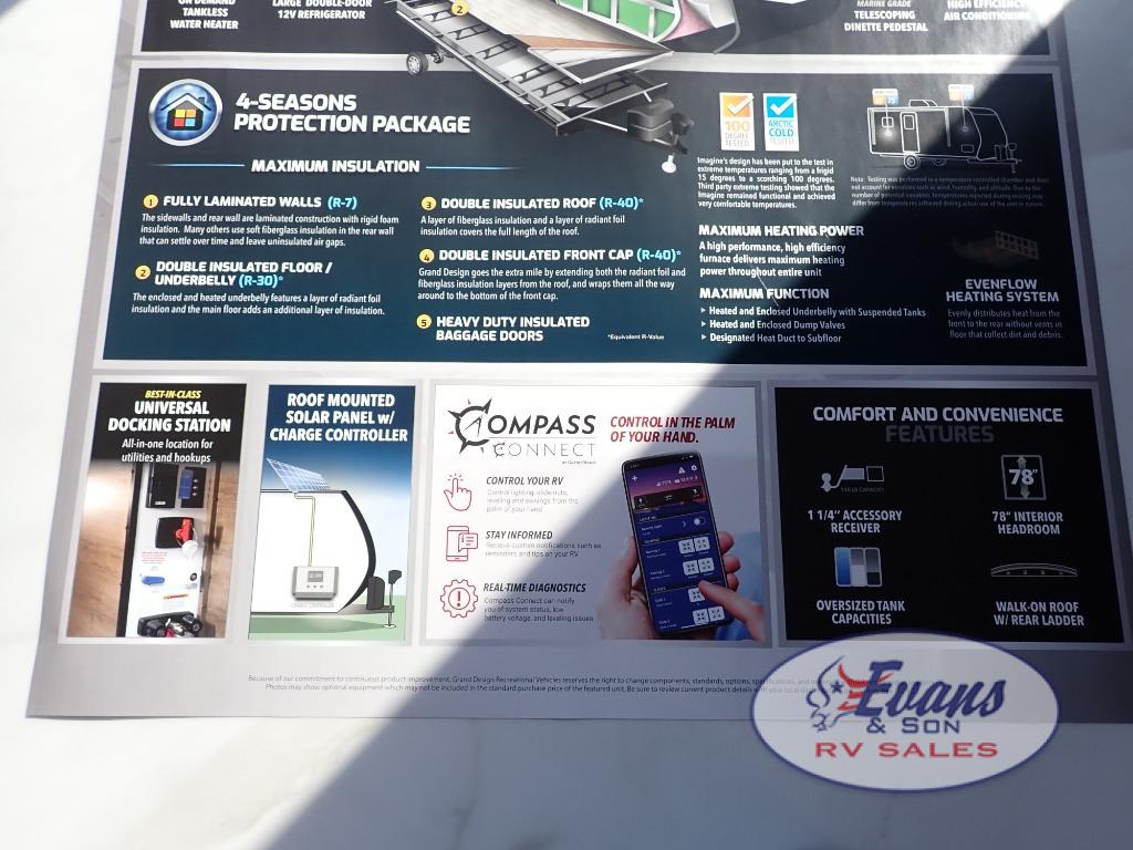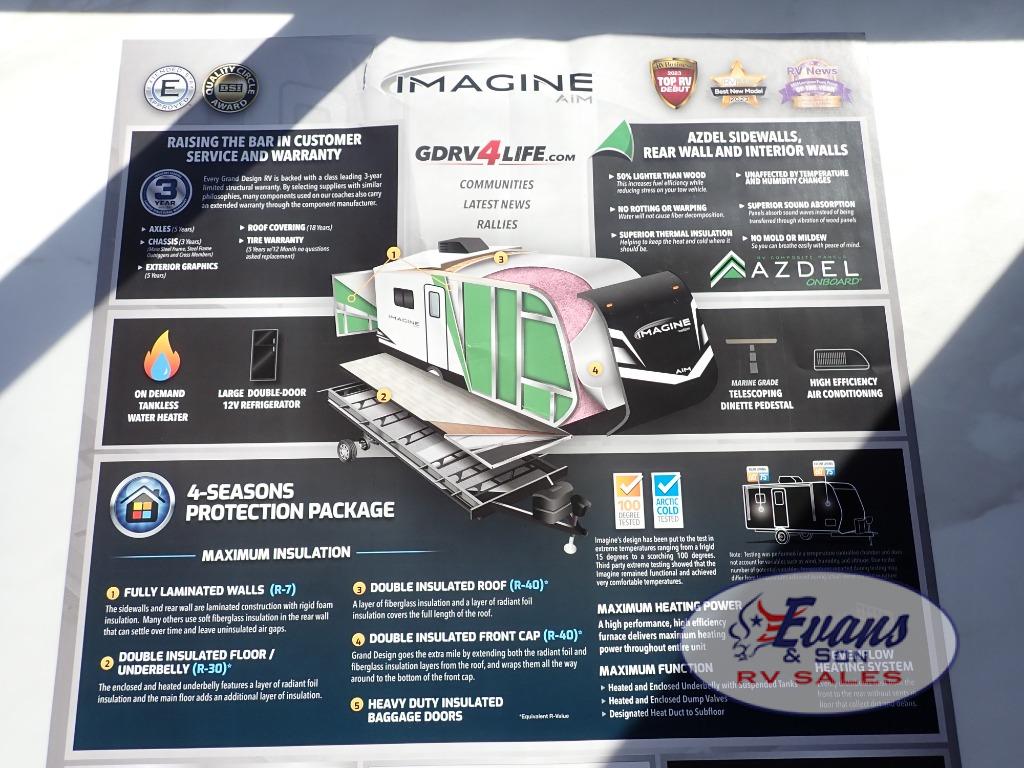 Aim for new destinations in one of these Grand Design Imagine AIM travel trailers! They are constructed to a superior standard with the 4-Seasons Protection Package that features a heated and enclosed underbelly with suspended tanks, a moisture barrier floor enclosure, a double insulated roof and front wall, and more. There is backup camera prep outside, along with a universal docking station, and a power tongue jack. You are sure to feel at home with residential cabinetry, premium window treatments, residential countertops, and a spacious walk-in shower to name a few comforts. The on-demand tankless water heater is a feature you won't want to camp without and the hi-definition LED TV will ensure you'll never go bored on rainy days. Each model also comes with four AIM packages; the Peace of Mind Package, The Ultimate Power Package, The 4-Season Protection Package, and the Solar Package!