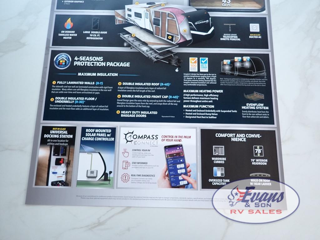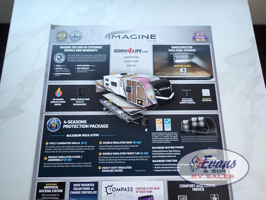 Let your imagination run wild with the possibilities that the Grand Design Imagine XLS travel trailer can provide! The Imagine XLS has been built with oversized tank capacities, an extra-large 2" fresh water drain valve, a ducted A/C system, a power tongue jack, and a heated and enclosed underbelly with suspended tanks. There is a designated heat duct to the subfloor and a residential ductless heating system throughout. For outdoor adventures, the electric awning with LED lights will enable you to stay protected, and the Tuff-Ply pass-thru flooring will withstand your many adventures. You will also love the XLS Solar Package that comes with a 200W roof mounted solar panel, a 40 Amp charge controller, a 12V 10 cu. ft. refrigerator, and roof mounted quick connect plugs!