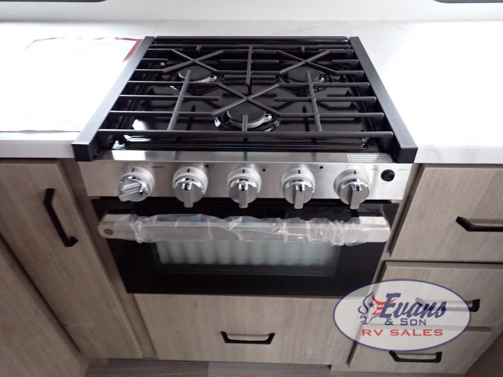 This 25RLE model travel trailer is designed for both comfort and convenience from front to back. At the front, the private bedroom features a spacious 60" x 80" queen bed with built-in wardrobe cubby storage and one of two entry doors for easy access. Moving down the hall, the full bathroom offers a residential-style walk-in shower with a skylight that adds both light and headroom, along with a mirrored medicine cabinet and linen shelves for towels and toiletries. The main living area opens up with a large slide out that houses 60" theater seating and a 10-cu. ft. refrigerator for all your fresh groceries, while a nearby pantry keeps your dry goods organized. Across from the slide, the U-shaped kitchen provides ample counter space, a three-burner range with oven, stainless steel sink, and microwave, everything you need to cook in comfort. At the rear, the booth dinette creates the perfect spot for meals or games and easily converts into an extra-sleeping area when needed.