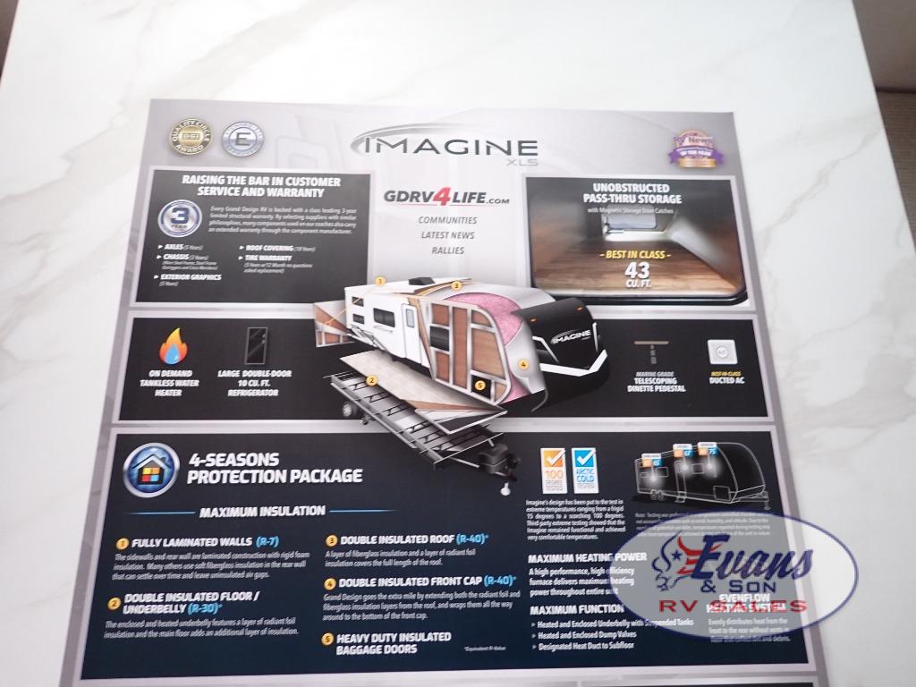 Let your imagination run wild with the possibilities that the Grand Design Imagine XLS travel trailer can provide! The Imagine XLS has been built with oversized tank capacities, an extra-large 2" fresh water drain valve, a ducted A/C system, a power tongue jack, and a heated and enclosed underbelly with suspended tanks. There is a designated heat duct to the subfloor and a residential ductless heating system throughout. For outdoor adventures, the electric awning with LED lights will enable you to stay protected, and the Tuff-Ply pass-thru flooring will withstand your adventures. You will also love the XLS Solar Package that comes with a 200W roof mounted solar panel, a 30 Amp charge controller, a 12V 10 cu. ft. refrigerator, and roof mounted quick connect plugs!