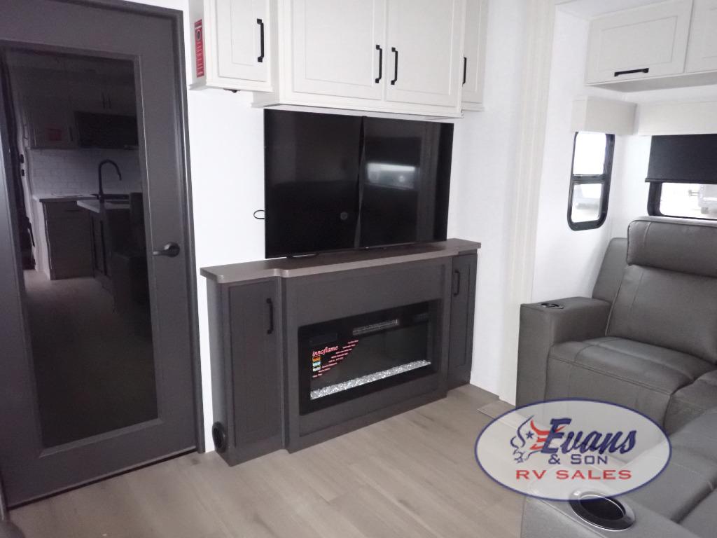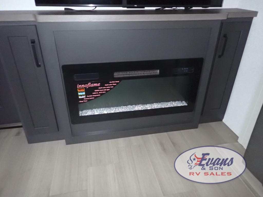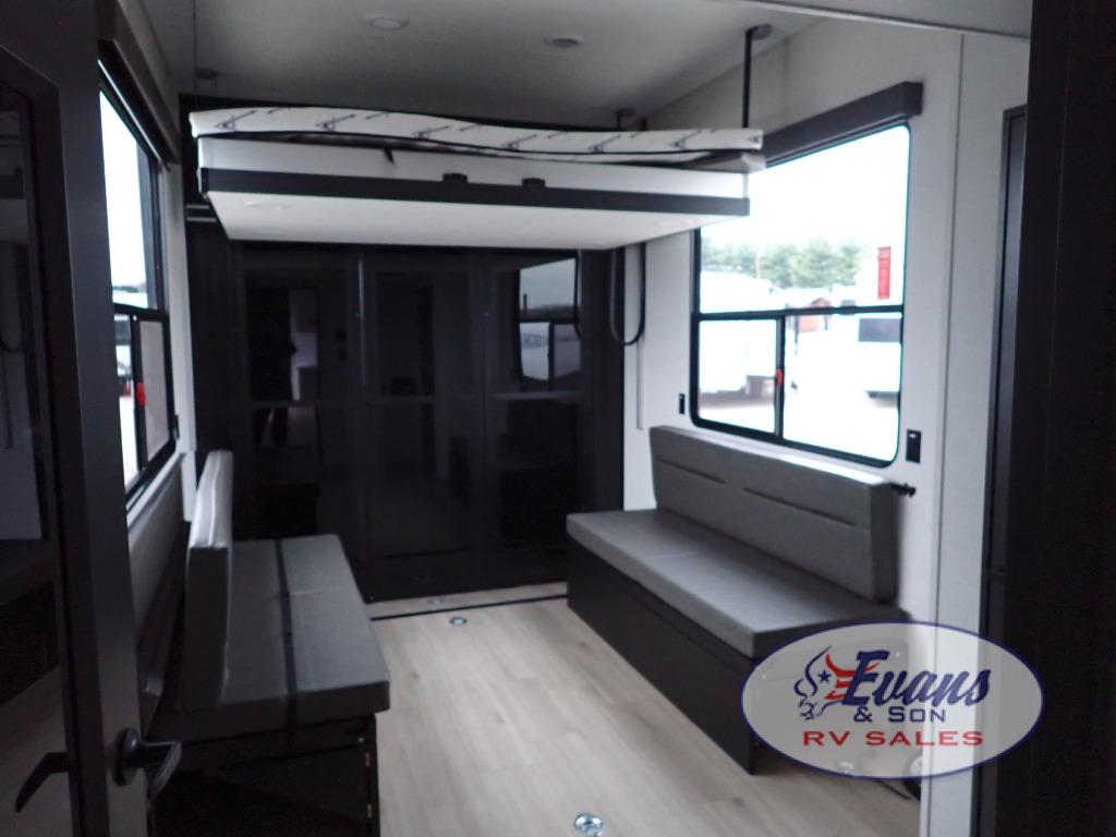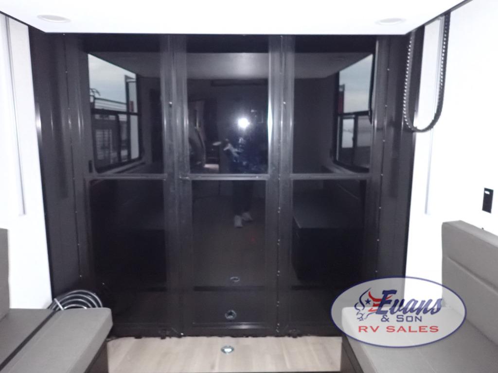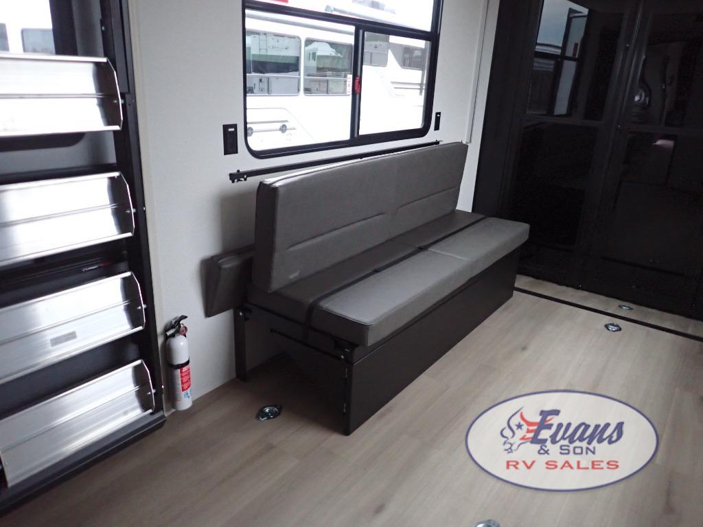A 15' separate garage in this toy hauler offers plenty of space for your off-road toys! You will appreciate the convenience of having a full bathroom with a walk-in shower and there is washer and dryer prep so you can accommodate these appliances. You will also appreciate the two entry doors, and flip-up pet dish. The rear ramp door can even be converted into a patio, plus there are exterior speakers to keep the party going. Everyone will love hanging out in the separate living area with a fireplace at the entertainment center, theater seating, and a sectional sofa. The fully equipped kitchen has everything you need to prepare delicious home cooked meals. The front private bedroom offers an escape to rest and relax on a queen bed for the next ride!