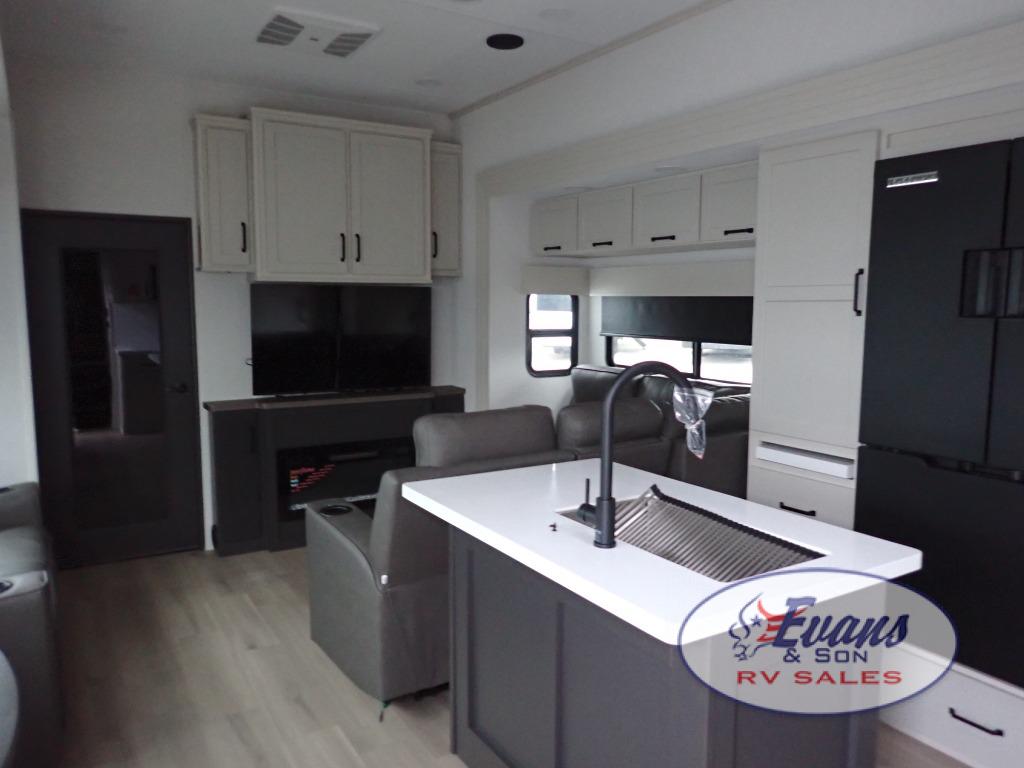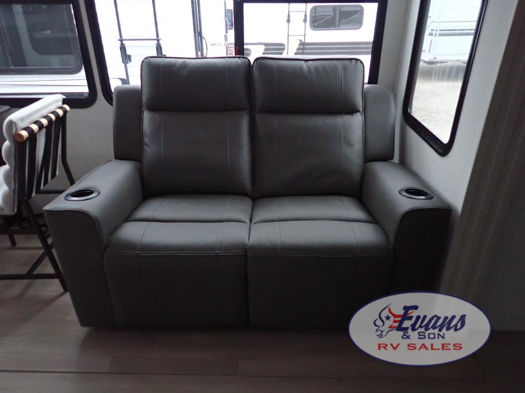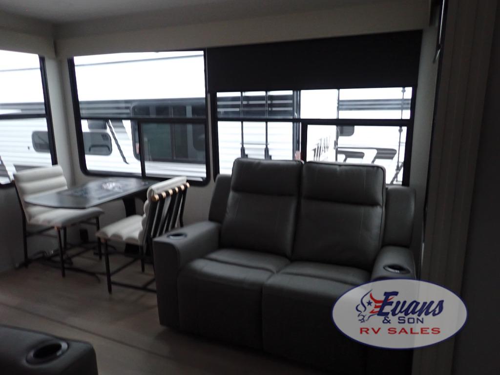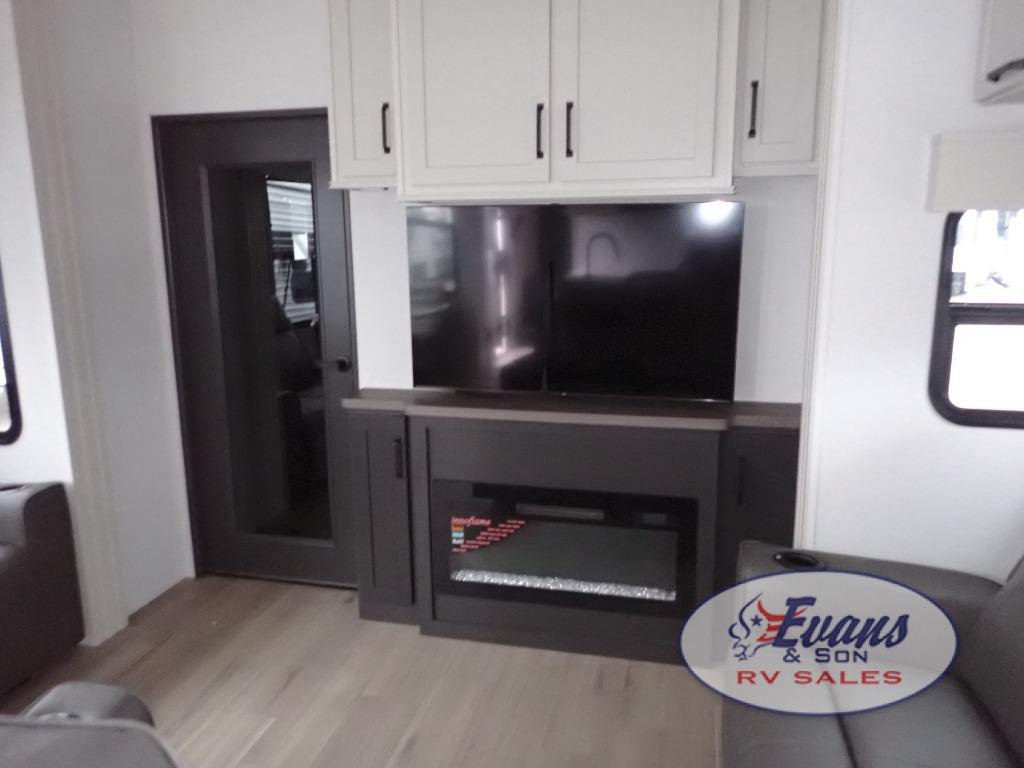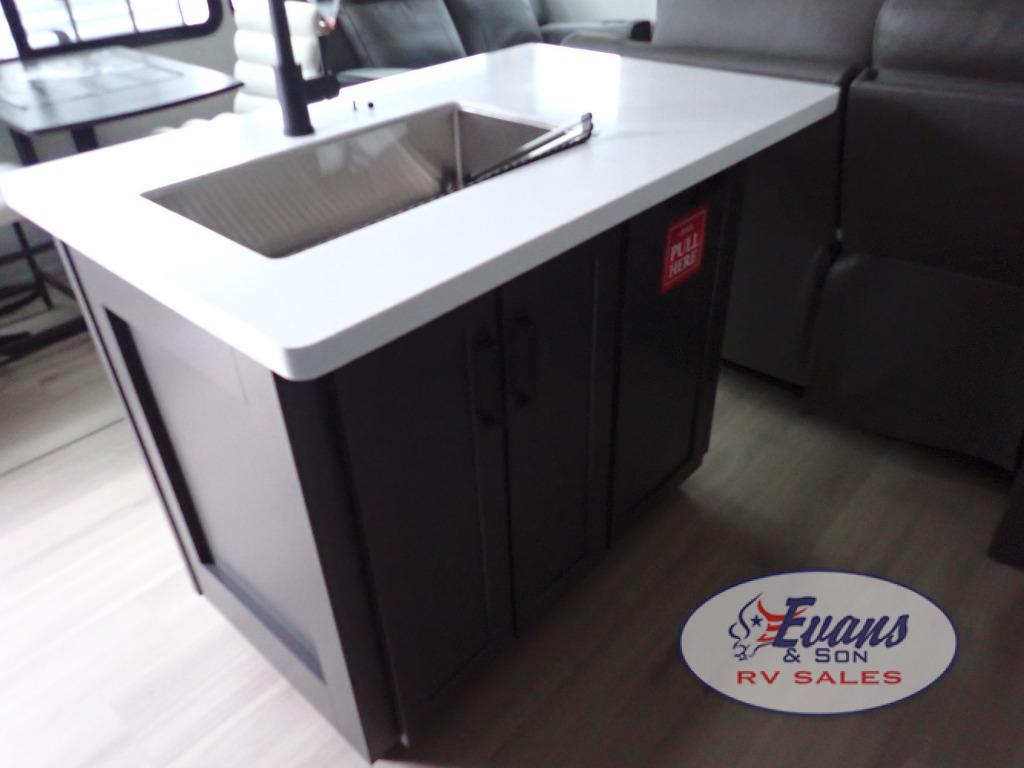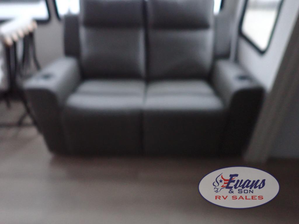 A 15' separate garage in this toy hauler offers plenty of space for your off-road toys! You will appreciate the convenience of having a full bathroom with a walk-in shower and there is washer and dryer prep so you can accommodate these appliances. You will also appreciate the two entry doors, and flip-up pet dish. The rear ramp door can even be converted into a patio, plus there are exterior speakers to keep the party going. Everyone will love hanging out in the separate living area with a fireplace at the entertainment center, theater seating, and a sectional sofa. The fully equipped kitchen has everything you need to prepare delicious home cooked meals. The front private bedroom offers an escape to rest and relax on a queen bed for the next ride!