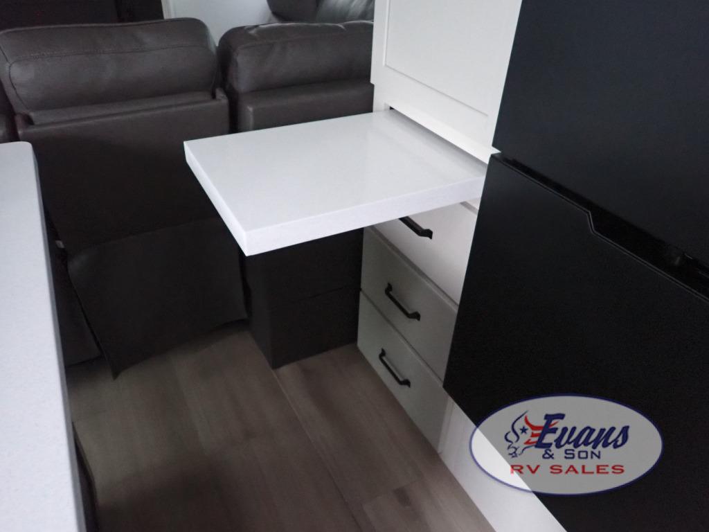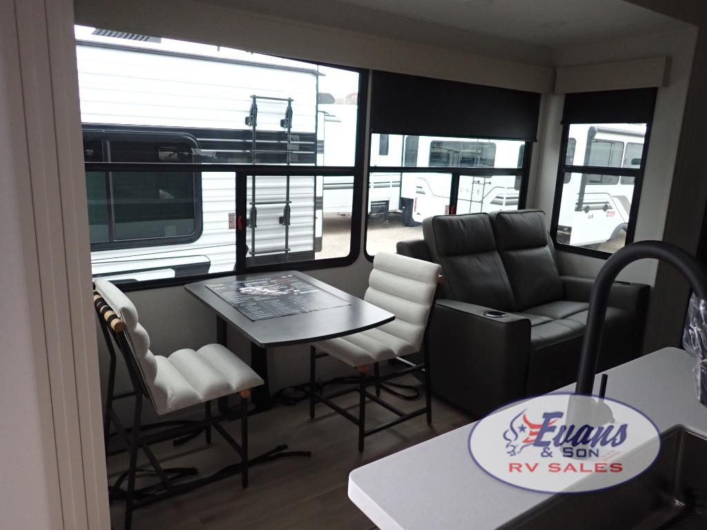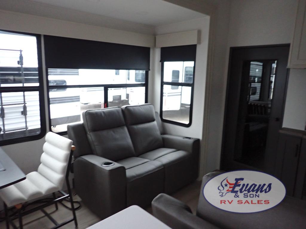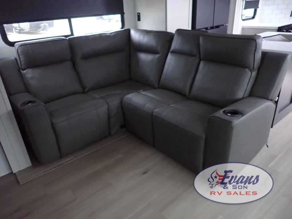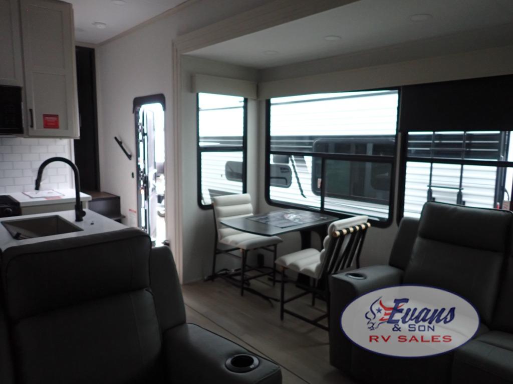 A 15' separate garage in this toy hauler offers plenty of space for your off-road toys! You will appreciate the convenience of having a full bathroom with a walk-in shower and there is washer and dryer prep so you can accommodate these appliances. You will also appreciate the two entry doors, and flip-up pet dish. The rear ramp door can even be converted into a patio, plus there are exterior speakers to keep the party going. Everyone will love hanging out in the separate living area with a fireplace at the entertainment center, theater seating, and a sectional sofa. The fully equipped kitchen has everything you need to prepare delicious home cooked meals. The front private bedroom offers an escape to rest and relax on a queen bed for the next ride!