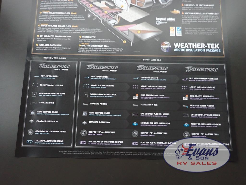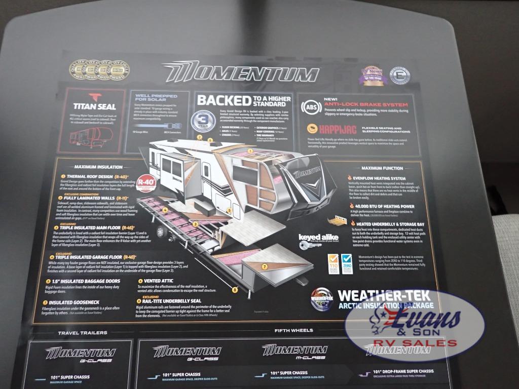 Are you looking for adventure and fun? The Momentum G-Class toy hauler by Grand Design will help you find it! You can explore during any season you choose with the Insulation Package that includes a heated and enclosed underbelly with suspended tanks, a high-capacity furnace, a moisture barrier floor enclosure, and cabinet-mounted heat ducts. Each model includes a high capacity water pump, a dovetail rear end, and 2,500-LB tie-downs anchored into the chassis. Throughout the Momentum G-Class interior, you'll enjoy many comfortable features like large panoramic windows, a shower skylight, USB chargers in the bedroom, and residential cabinetry.